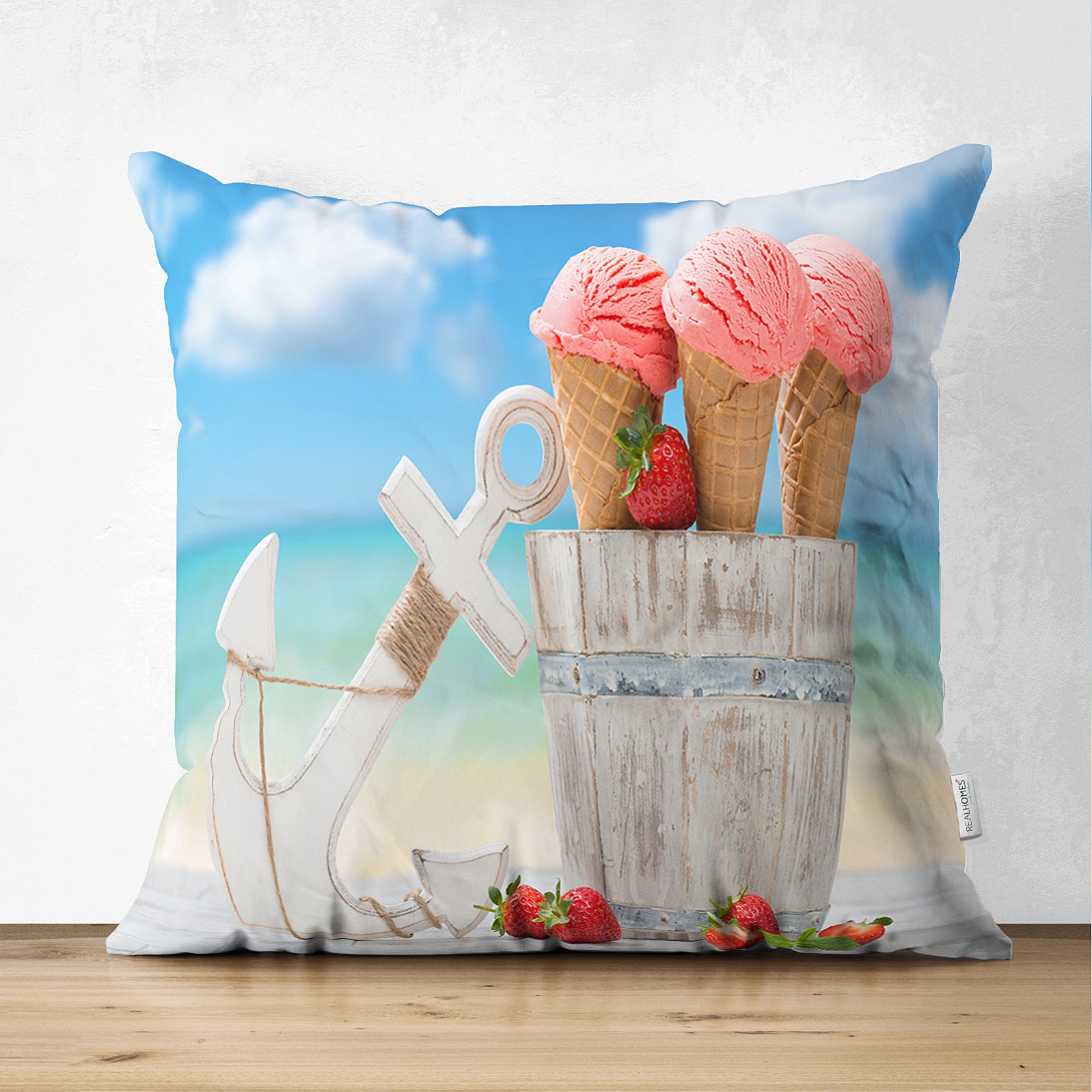 Sea and Icecream Özel Tasarımlı Dijital Baskılı Modern Süet Yastık Kırlent Kılıfı