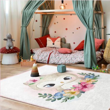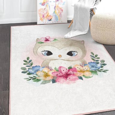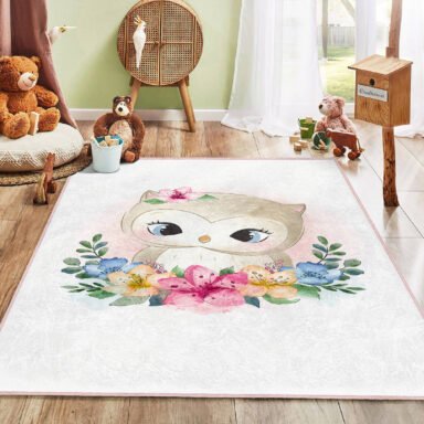 Sevimli Baykuş Desenli Makinede Yıkanabilir Kaymaz Taban Çocuk Halısı – Renkli ve Eğlenceli