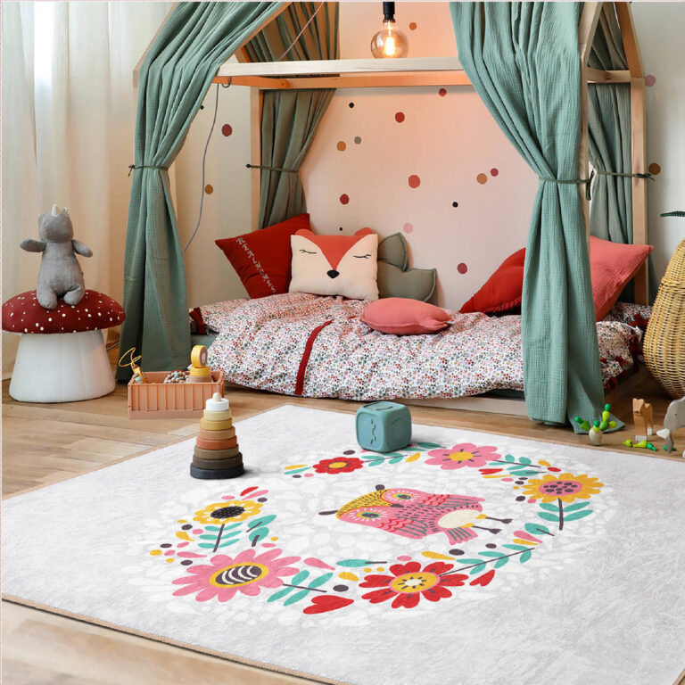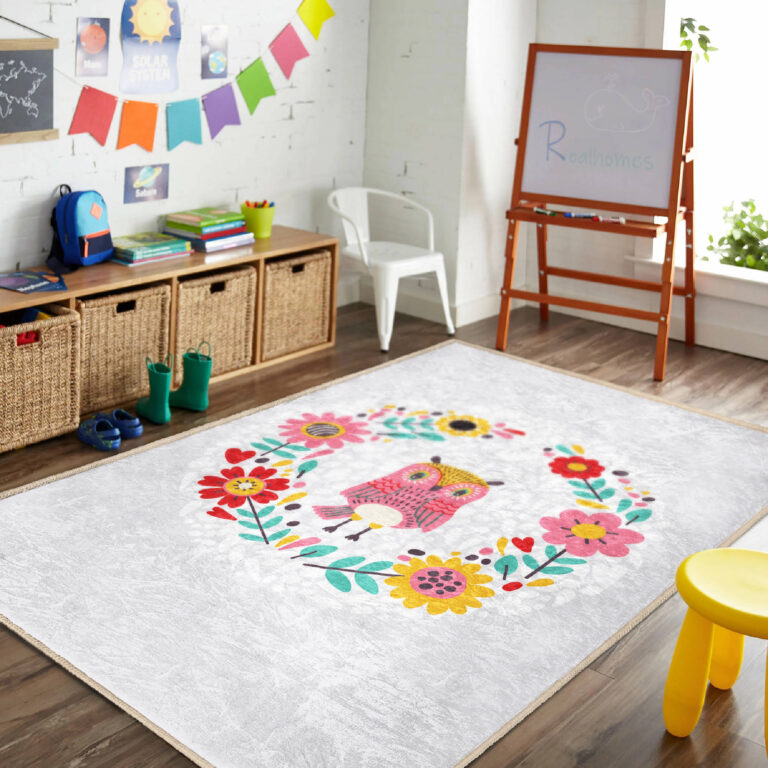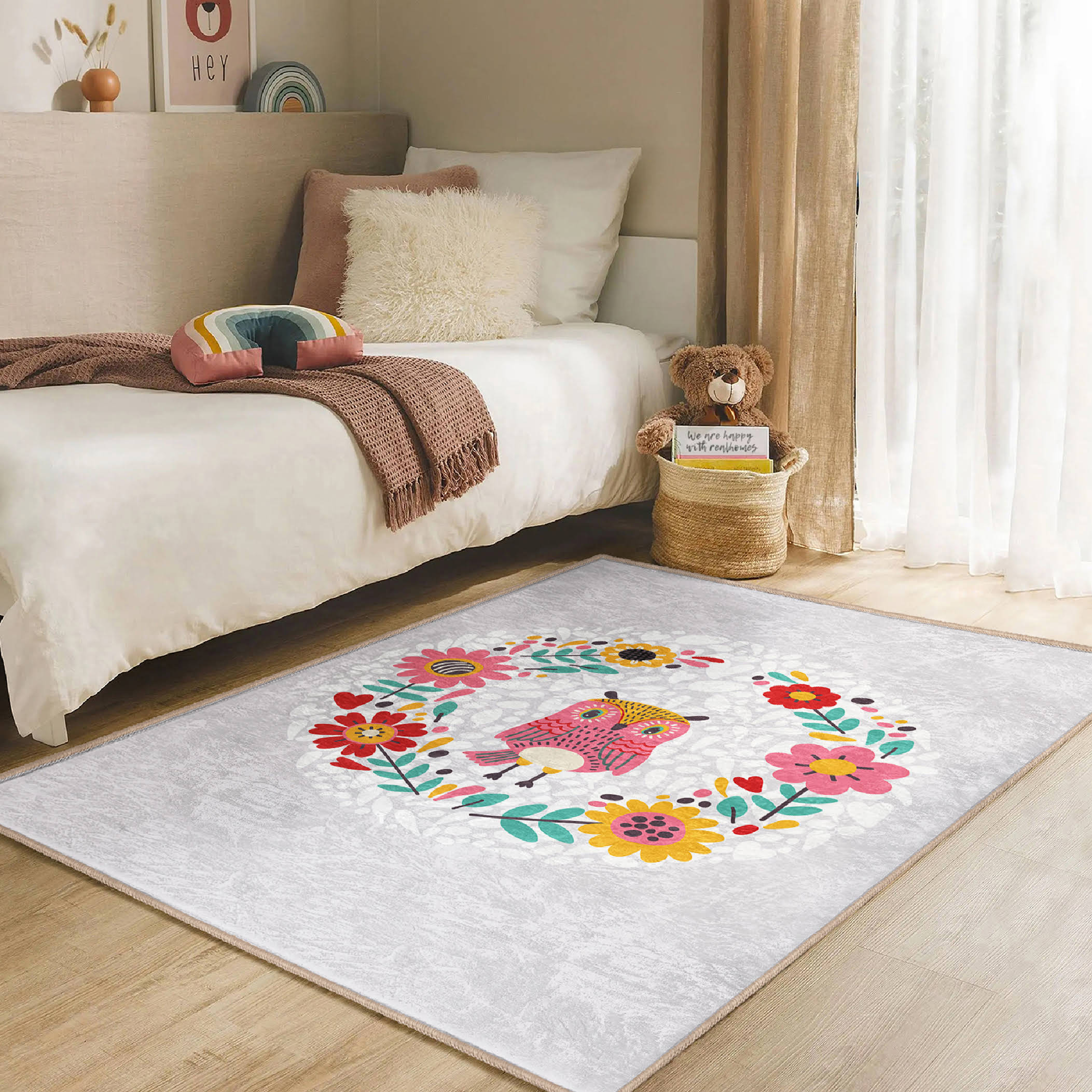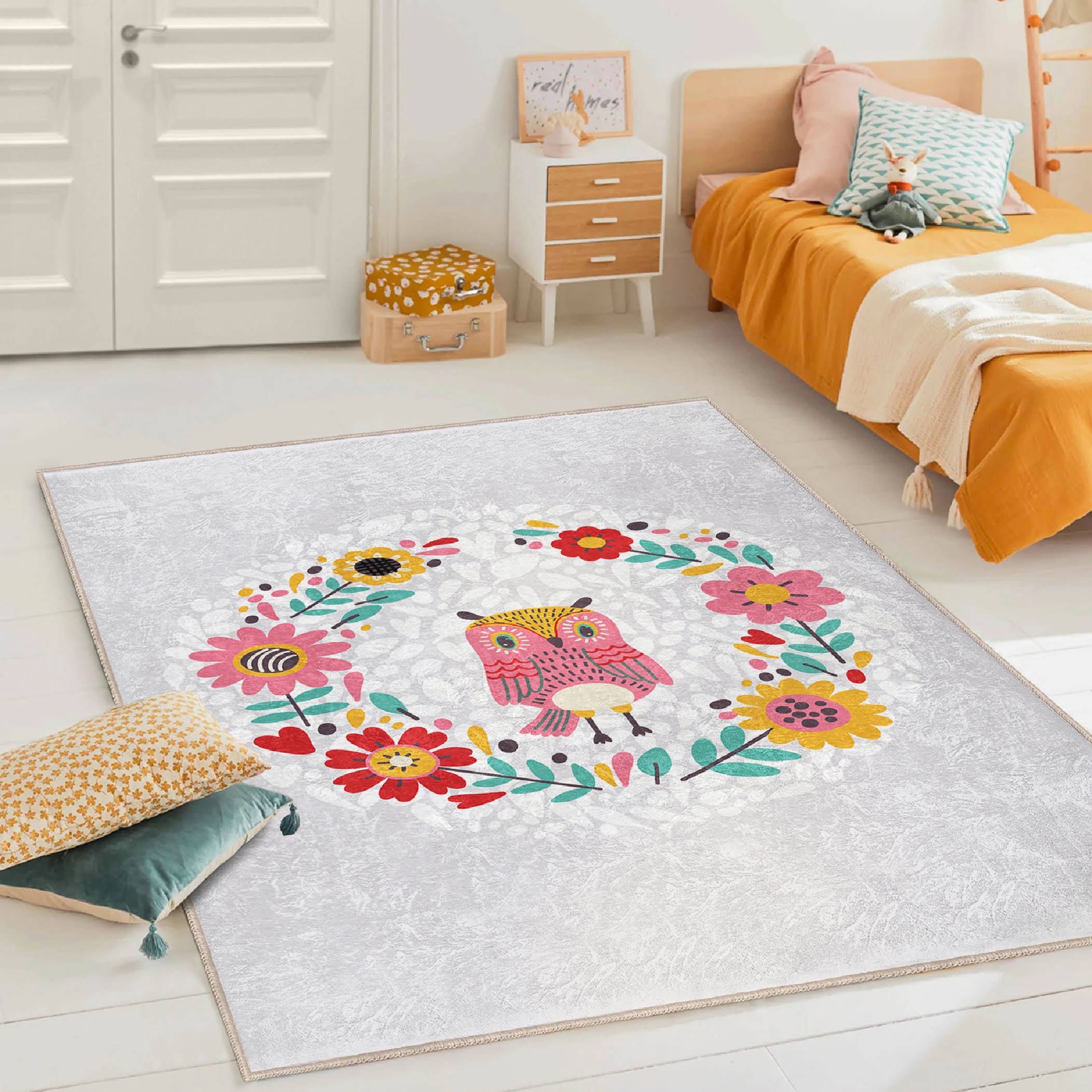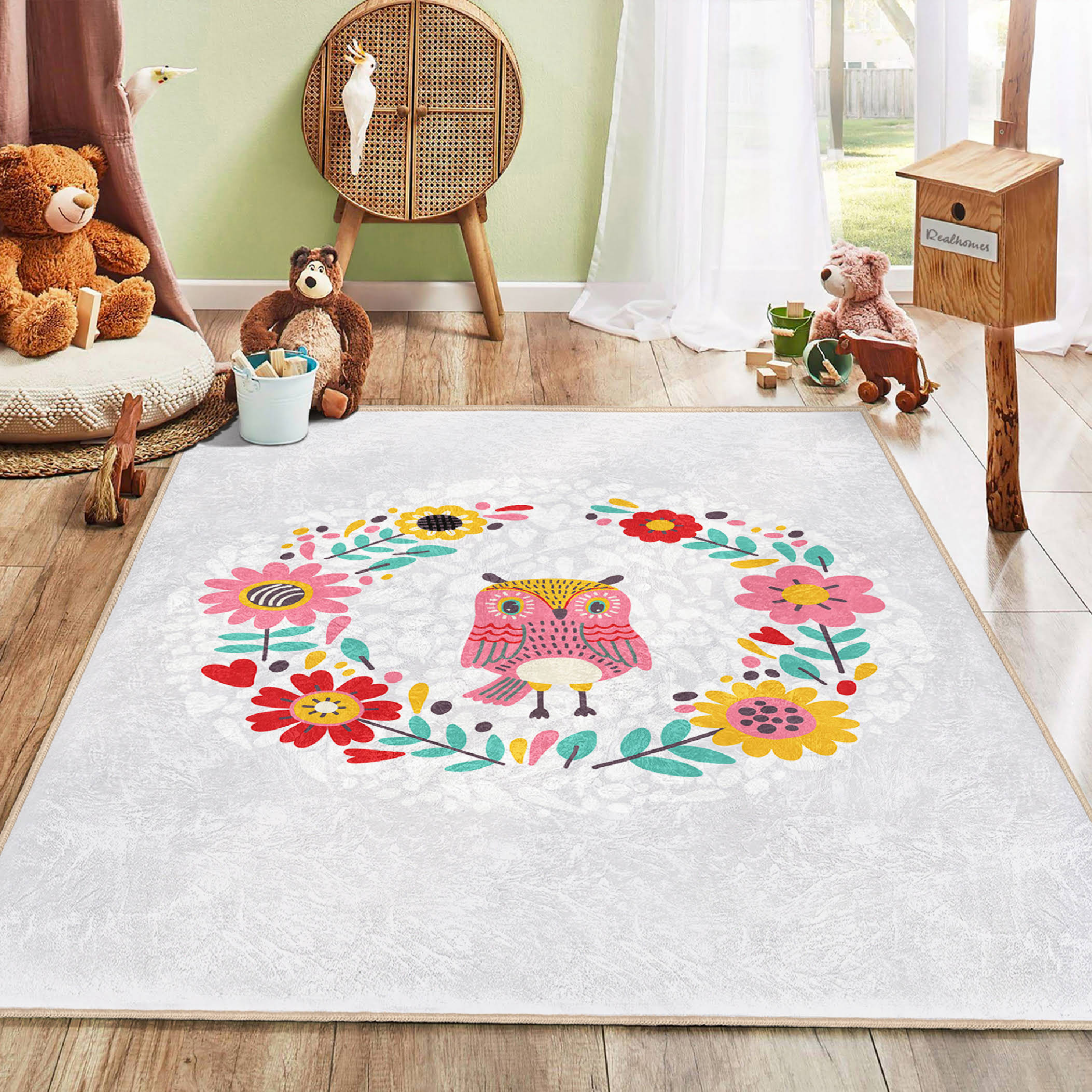 Sevimli Baykuş Desenli Renkli Çiçeklerle Süslenmiş Makinede Yıkanabilir Kaymaz Taban Çocuk Halısı