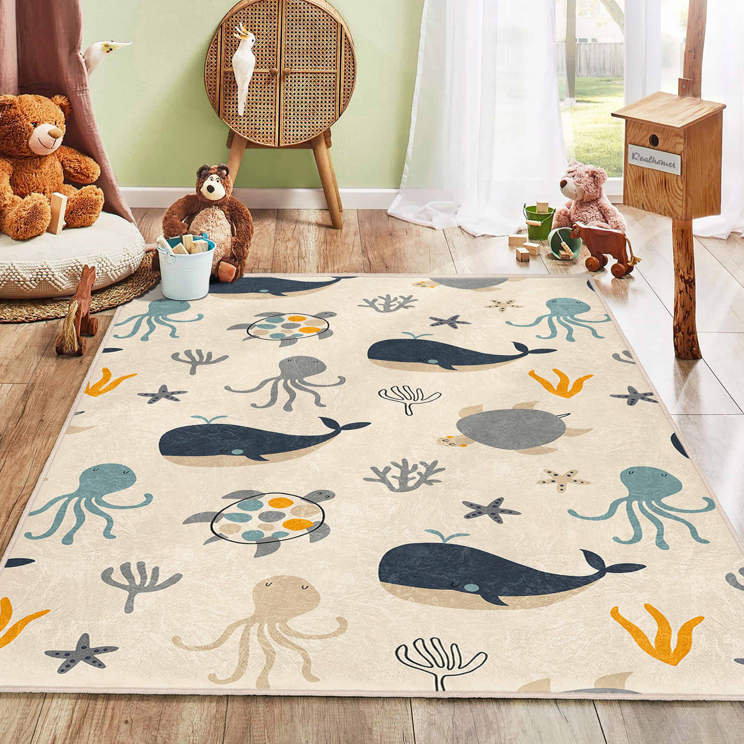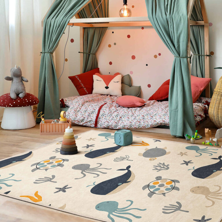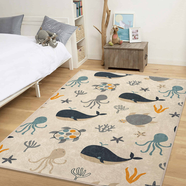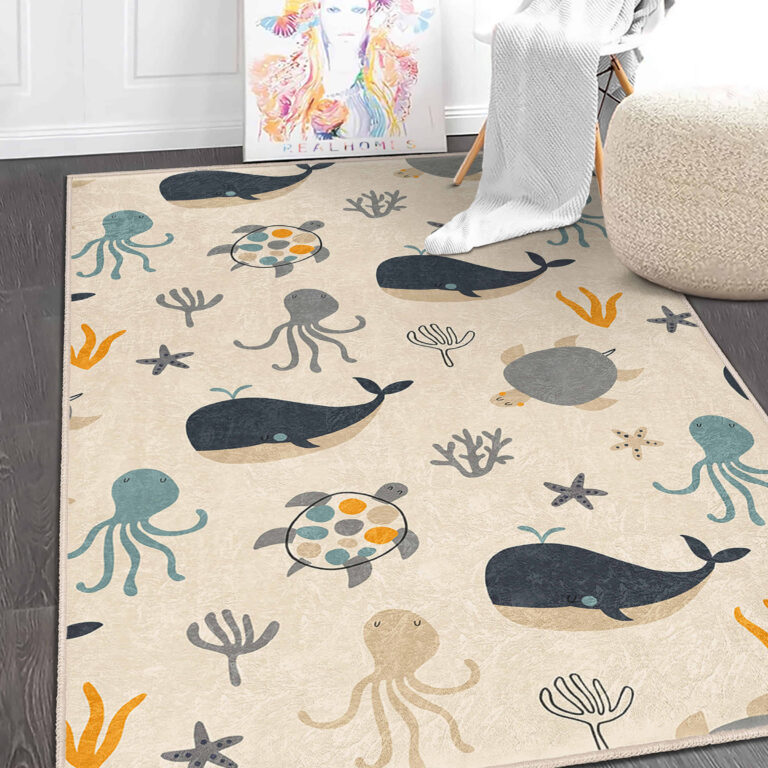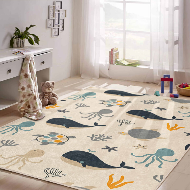 Sevimli Deniz Canlıları Desenli Dikdörtgen Çocuk Halısı – Yıkanabilir Kaymaz Taban