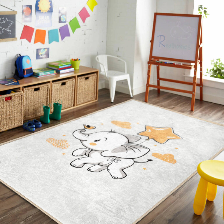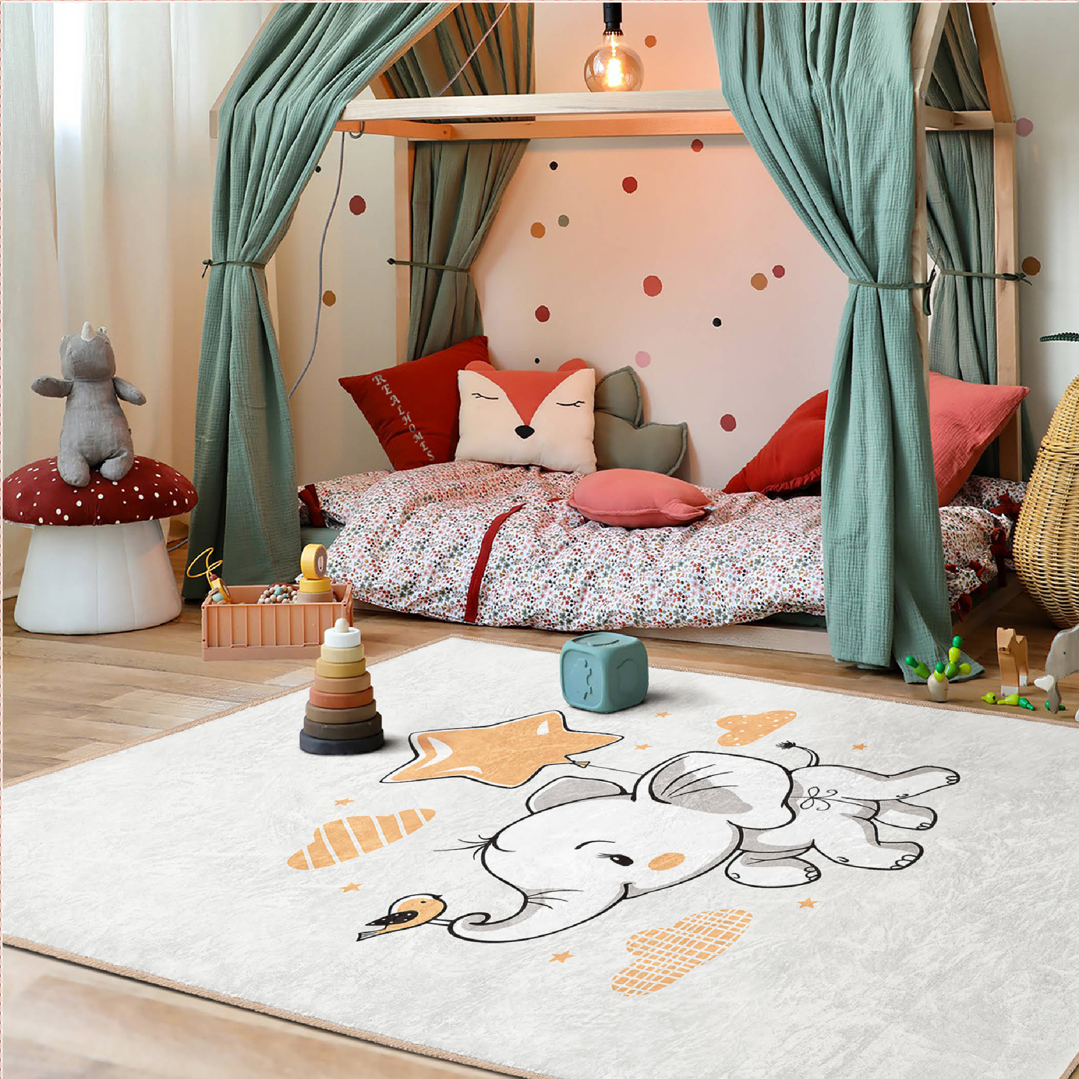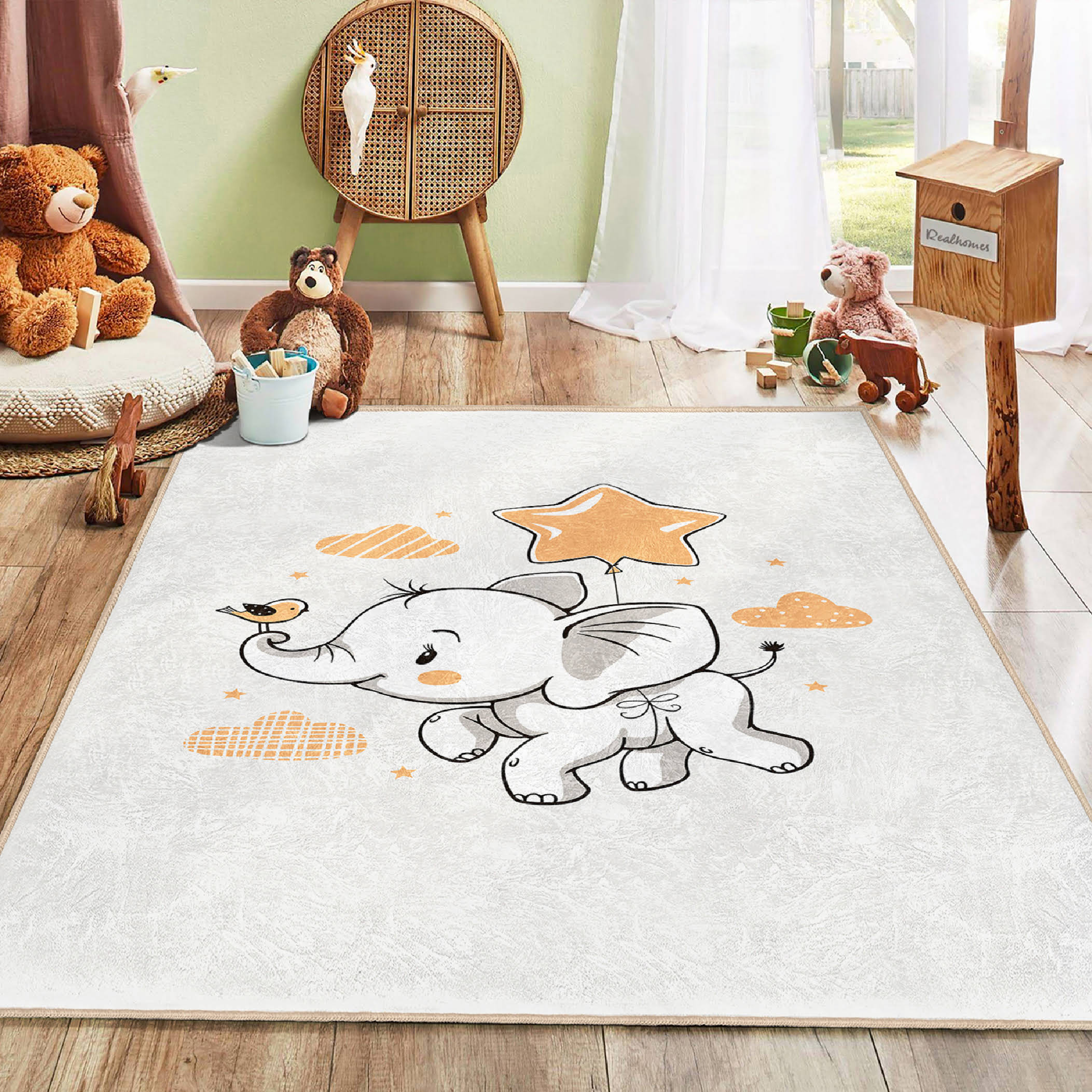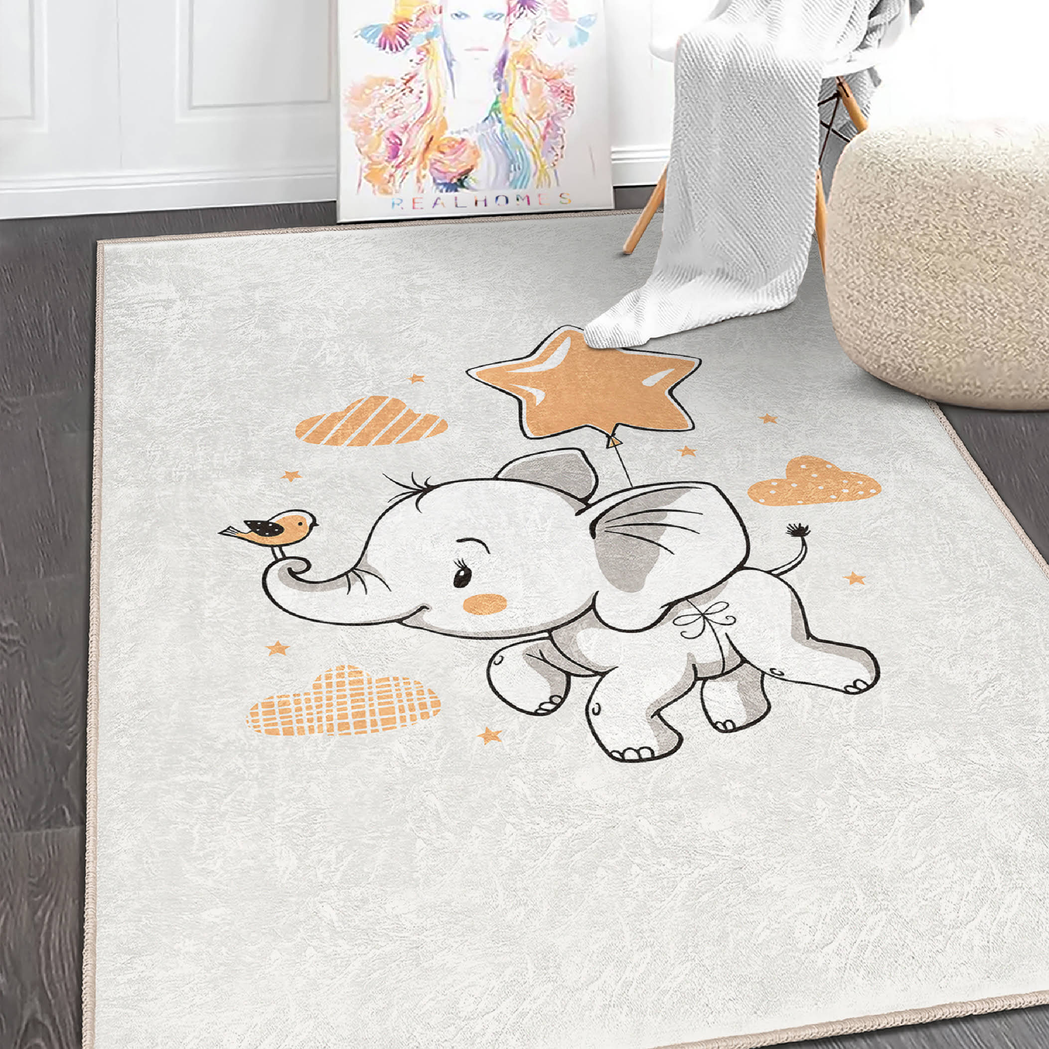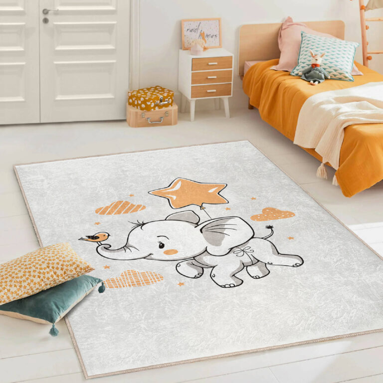 Sevimli Fil Desenli Renkli Çocuk Halısı – 3D Dijital Baskı ile Makinede Yıkanabilir Kaymaz Taban Halı