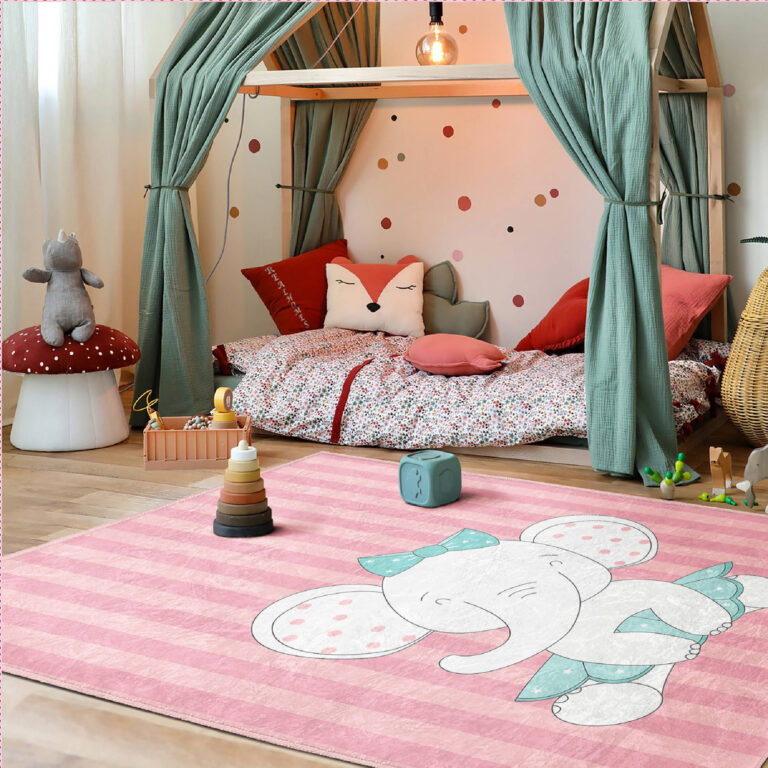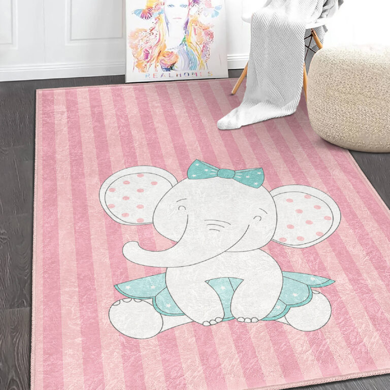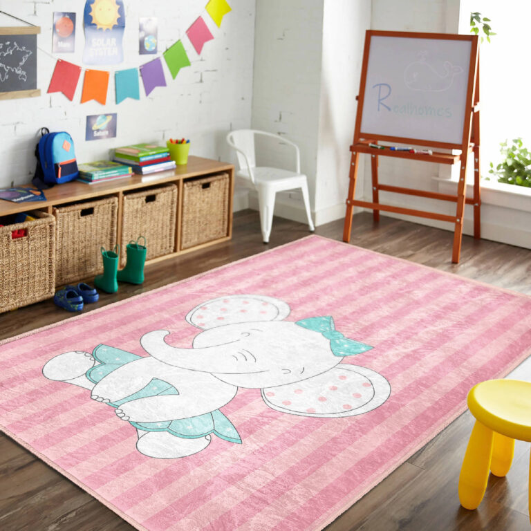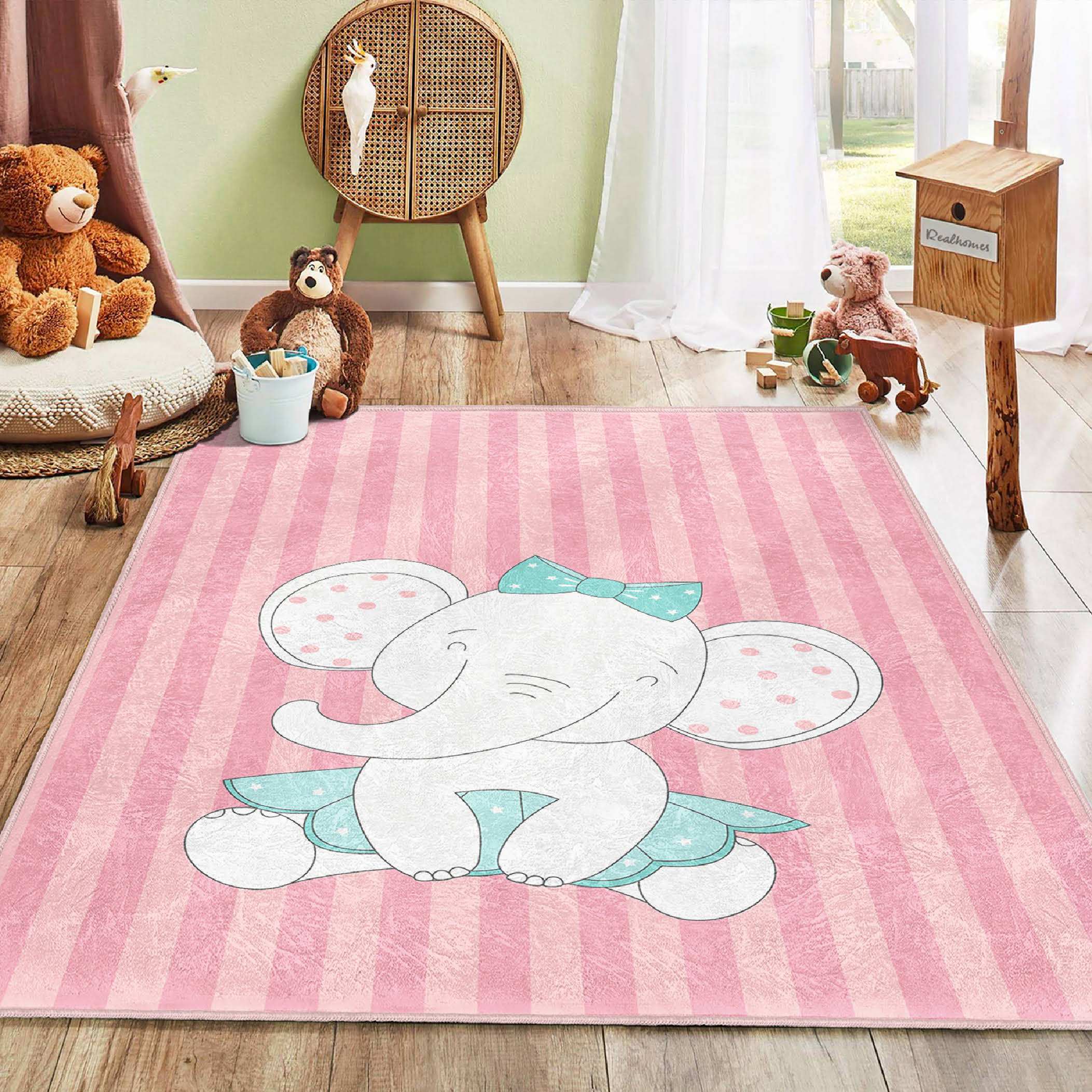 Sevimli Fil Temalı Pembe Şeritli Dijital Baskılı Kaymaz Taban Çocuk Halısı | Makinede Yıkanabilir