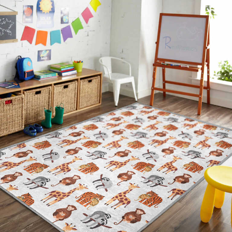 Sevimli Hayvan Desenli Renkli Çocuk Halısı – Makinede Yıkanabilir Kaymaz Tabanlı Dikdörtgen Halı