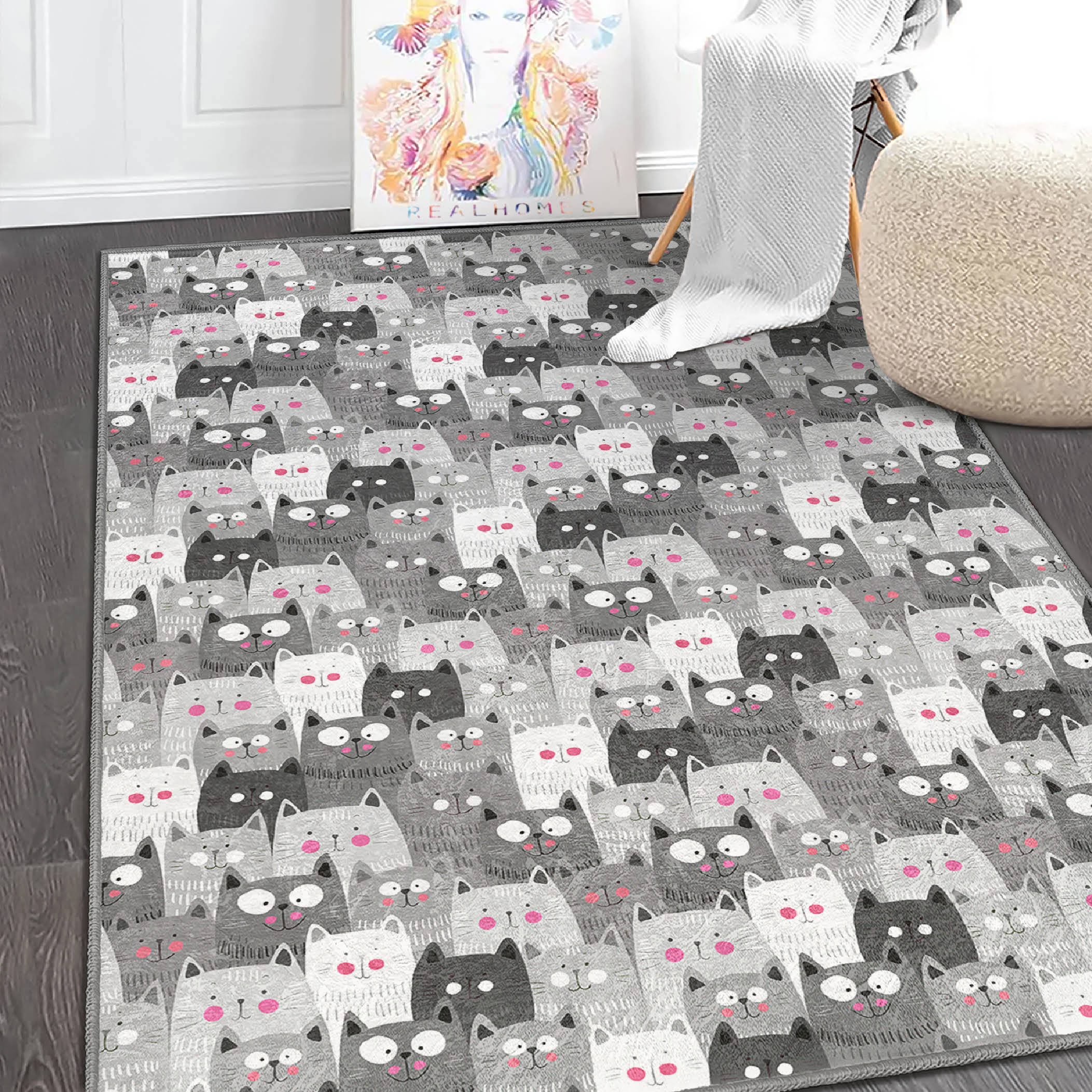Sevimli Kedi Motifli Çocuk Odası İçin Makinede Yıkanabilir Kaymaz Taban Halı