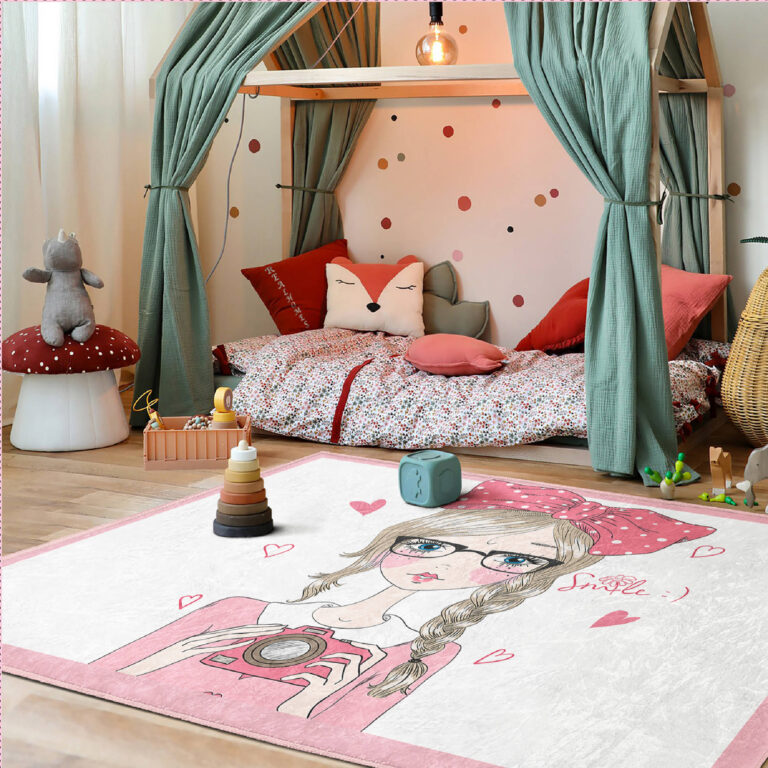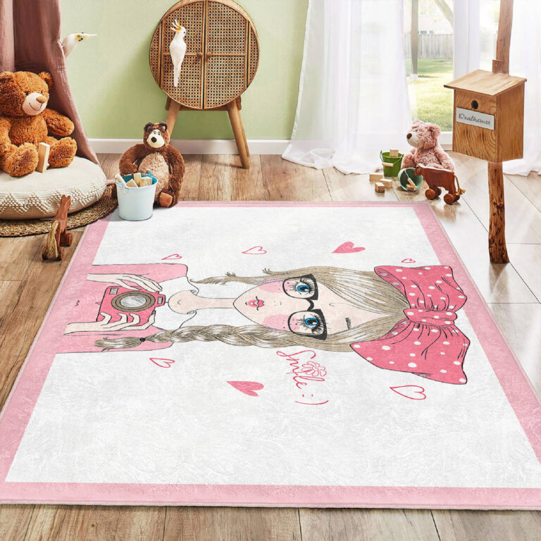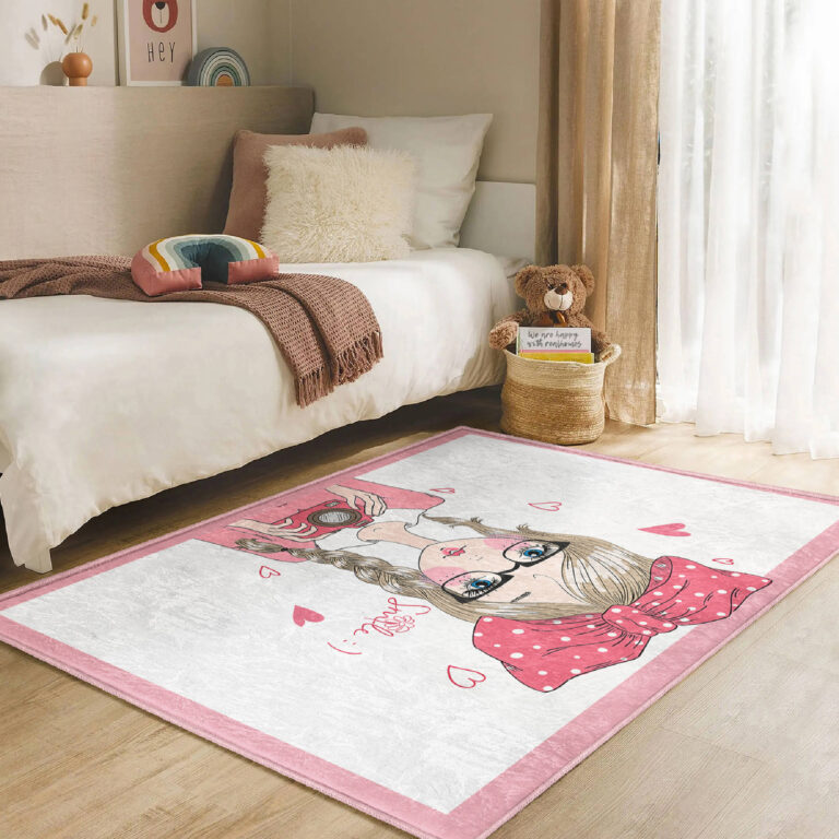 Sevimli Kız Motifli Renkli Çocuk Halısı – Makinede Yıkanabilir, Kaymaz Tabanlı Dikdörtgen Tasarım