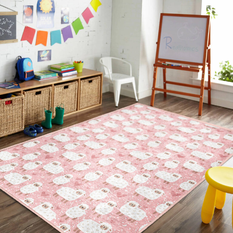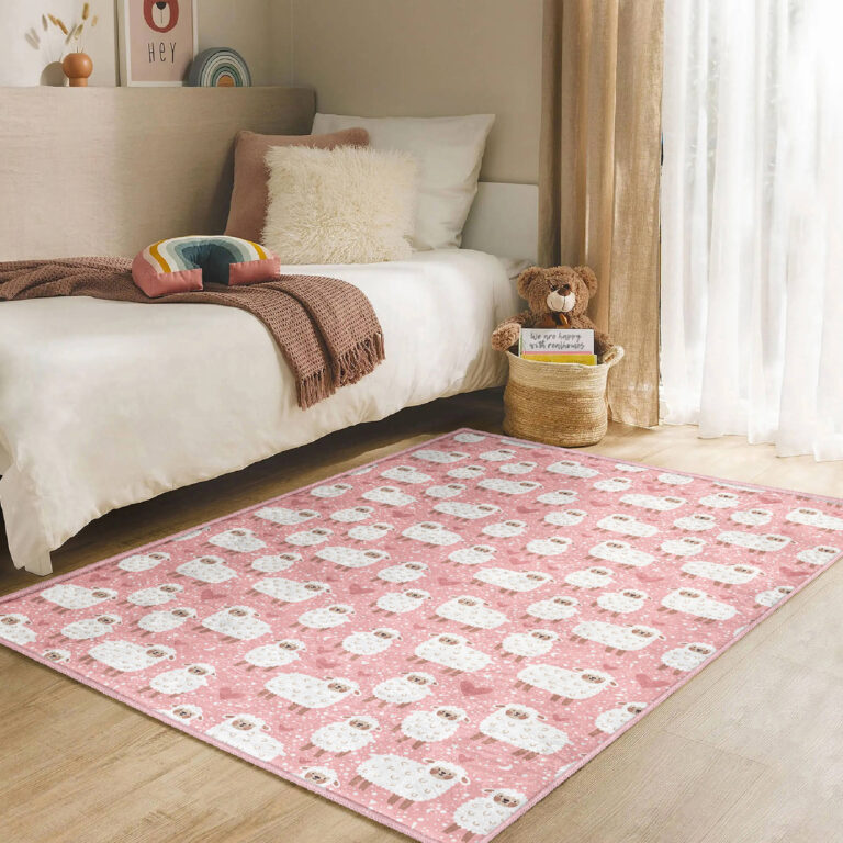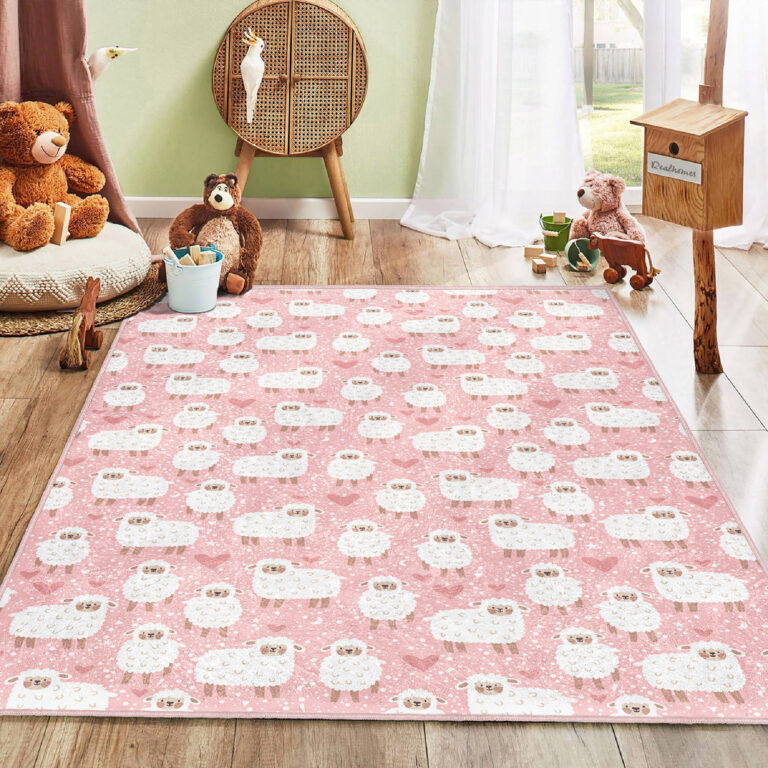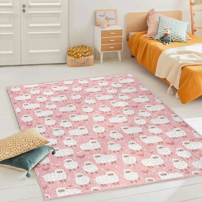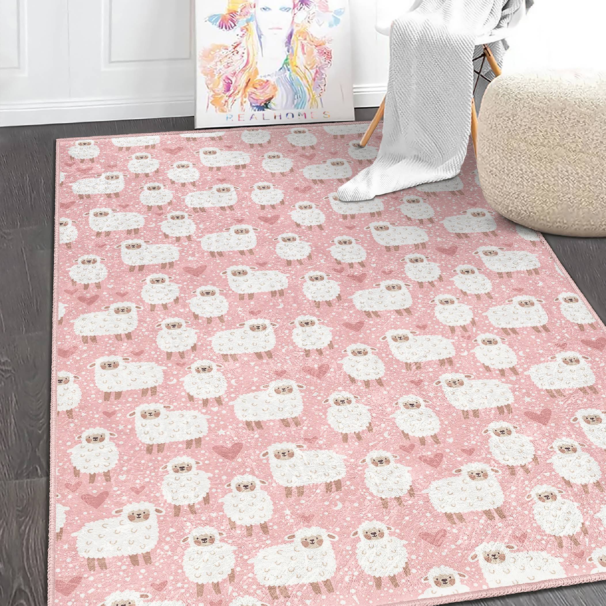 Sevimli Koyun Figürleriyle Renkli Kalp Desenli Yıkanabilir Kaymaz Taban Çocuk Halısı