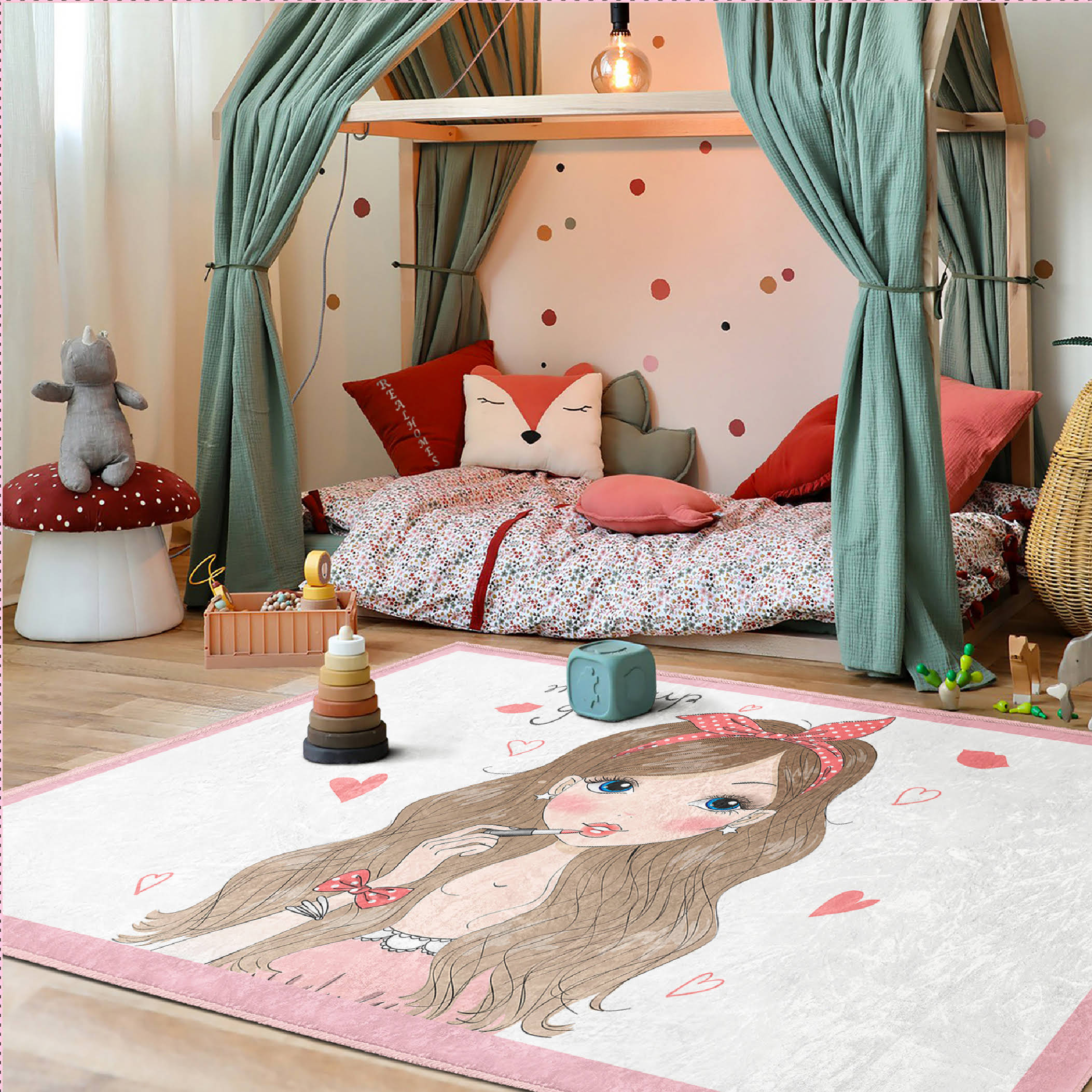 Sevimli Makyaj Kız Desenli Dikdörtgen Çocuk Halısı – Yıkanabilir Kaymaz Taban Özelliğiyle