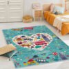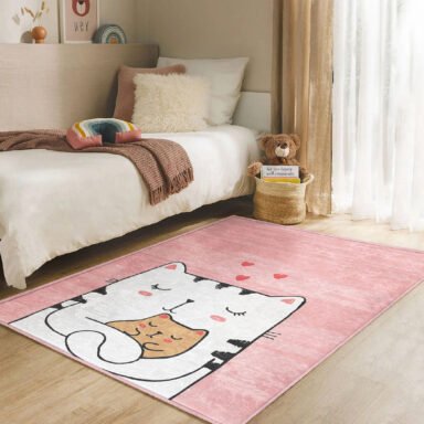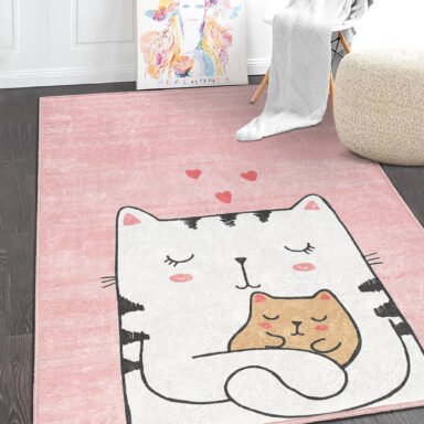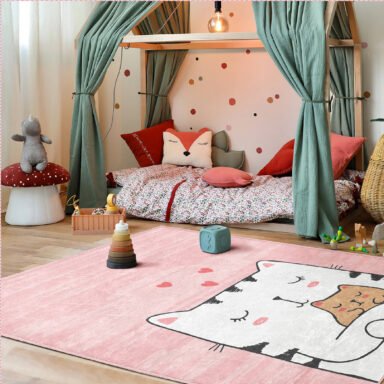 Sevimli Pembe Kalp Temalı Çocuk Halısı – Yıkanabilir Kaymaz Tabanlı Dikdörtgen Halı