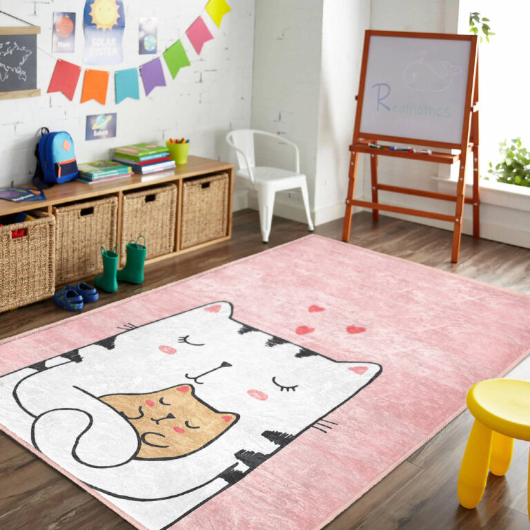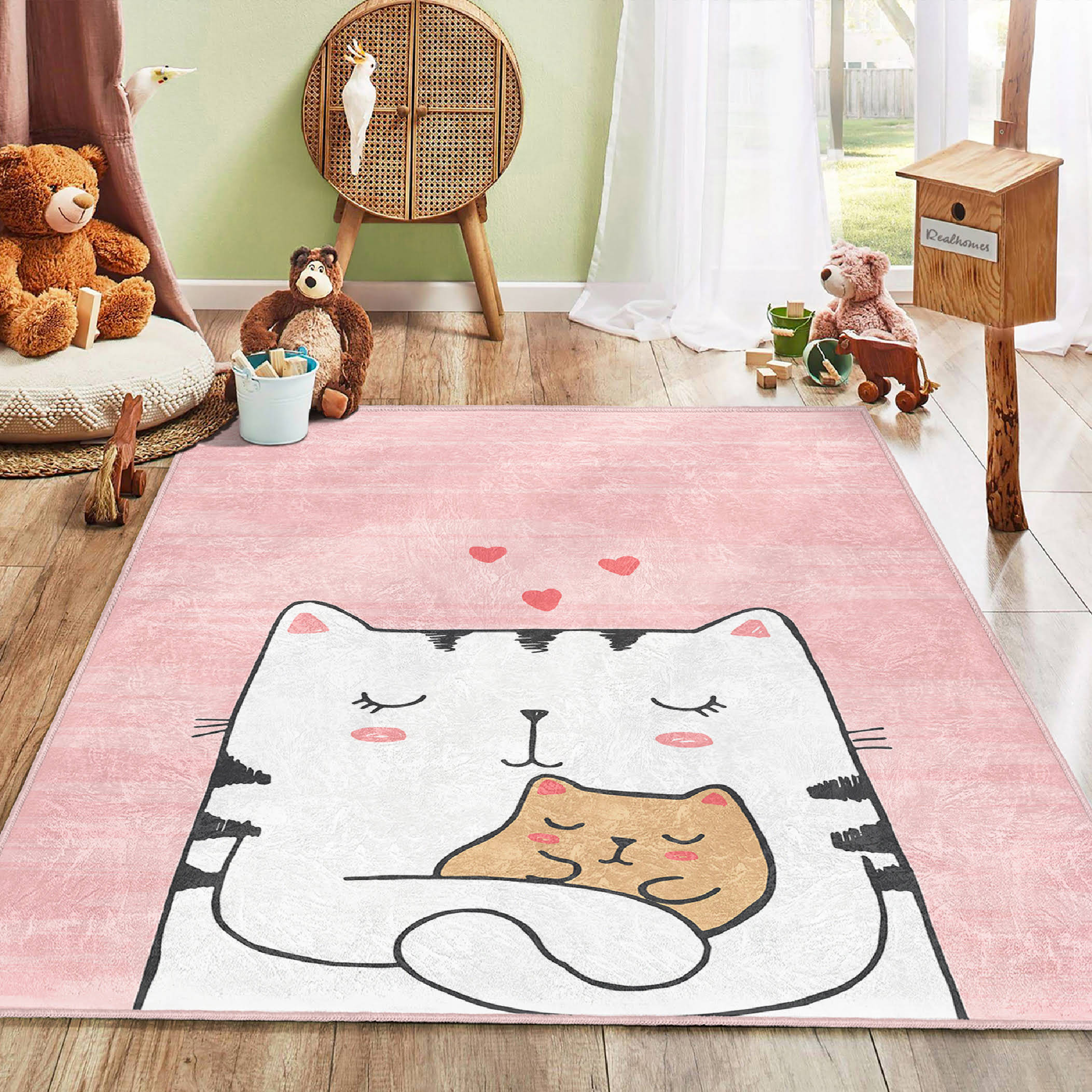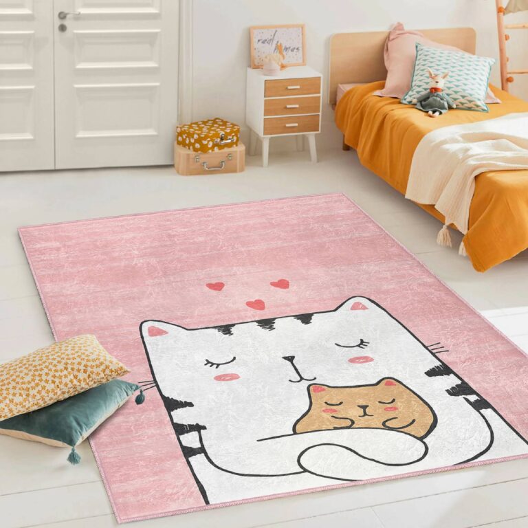 Sevimli Pembe Kalp Temalı Çocuk Halısı – Yıkanabilir Kaymaz Tabanlı Dikdörtgen Halı