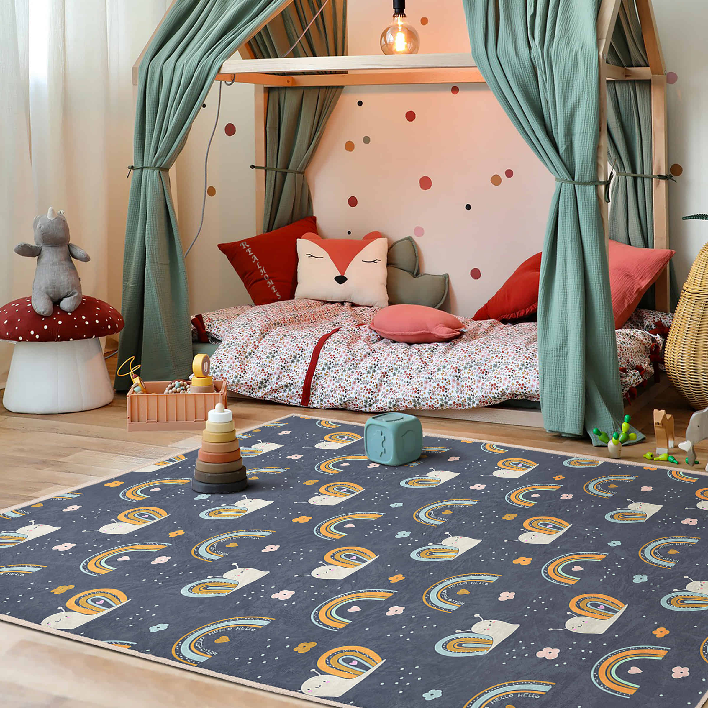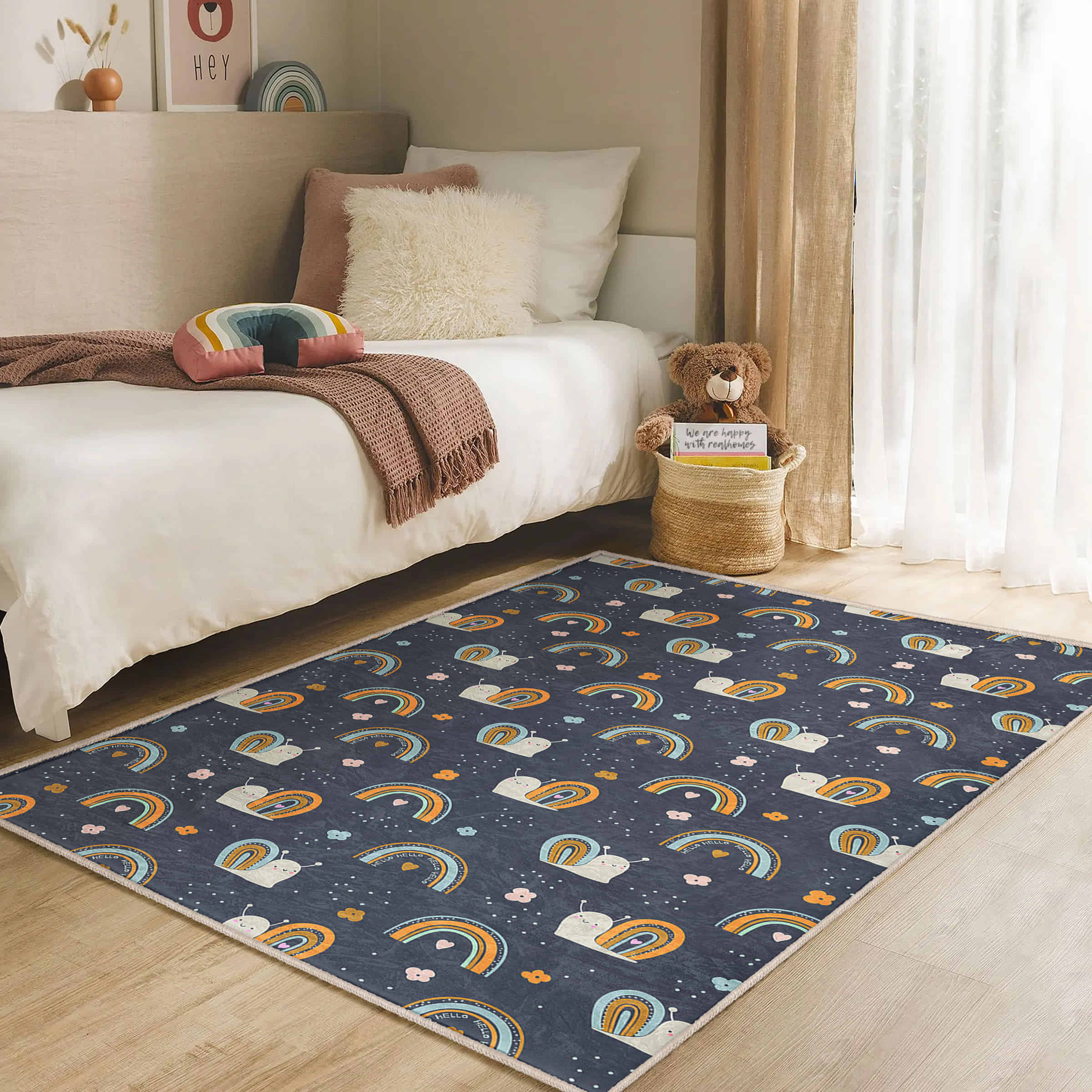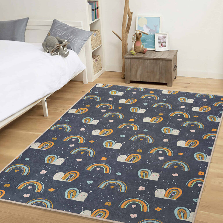 Sevimli Salaklar ve Gökkuşağı Desenli Yıkanabilir Kaymaz Taban Çocuk Halısı