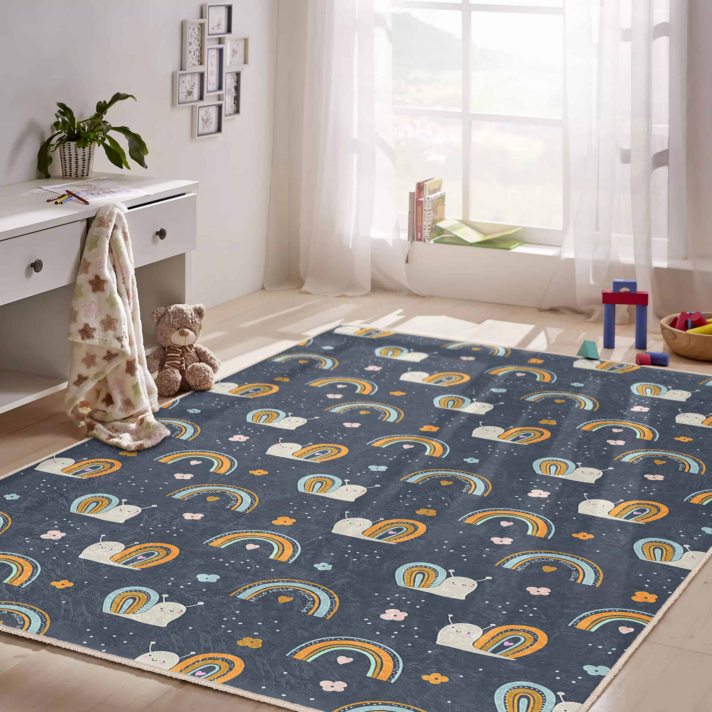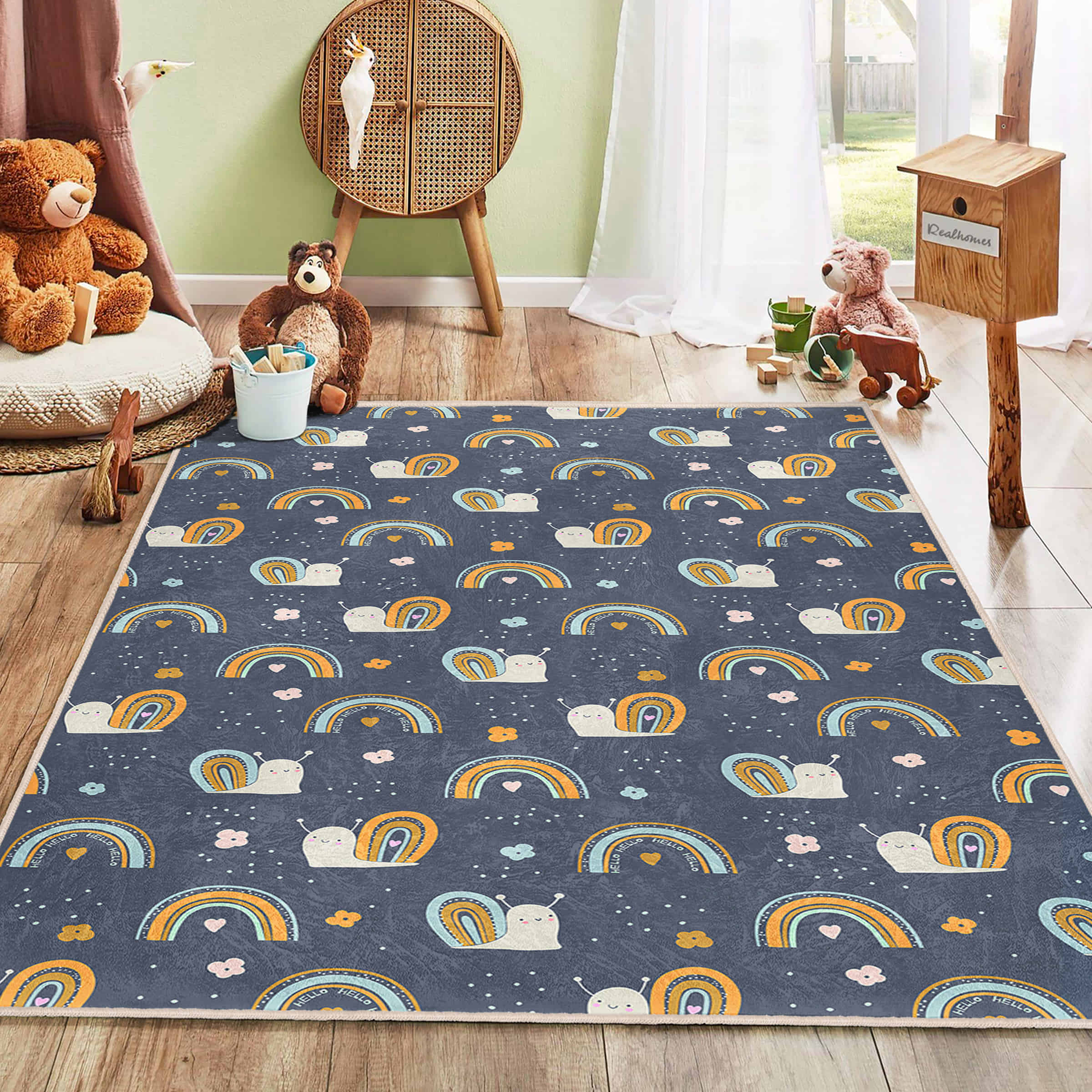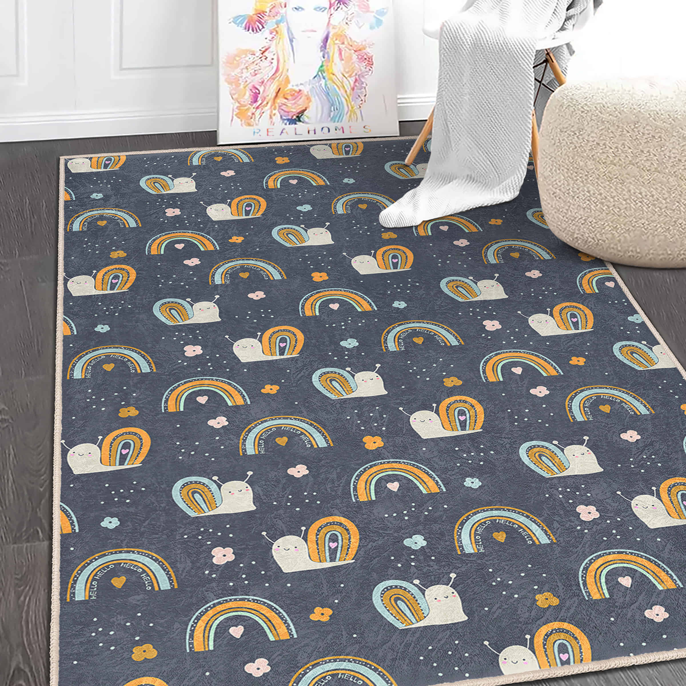 Sevimli Salaklar ve Gökkuşağı Desenli Yıkanabilir Kaymaz Taban Çocuk Halısı