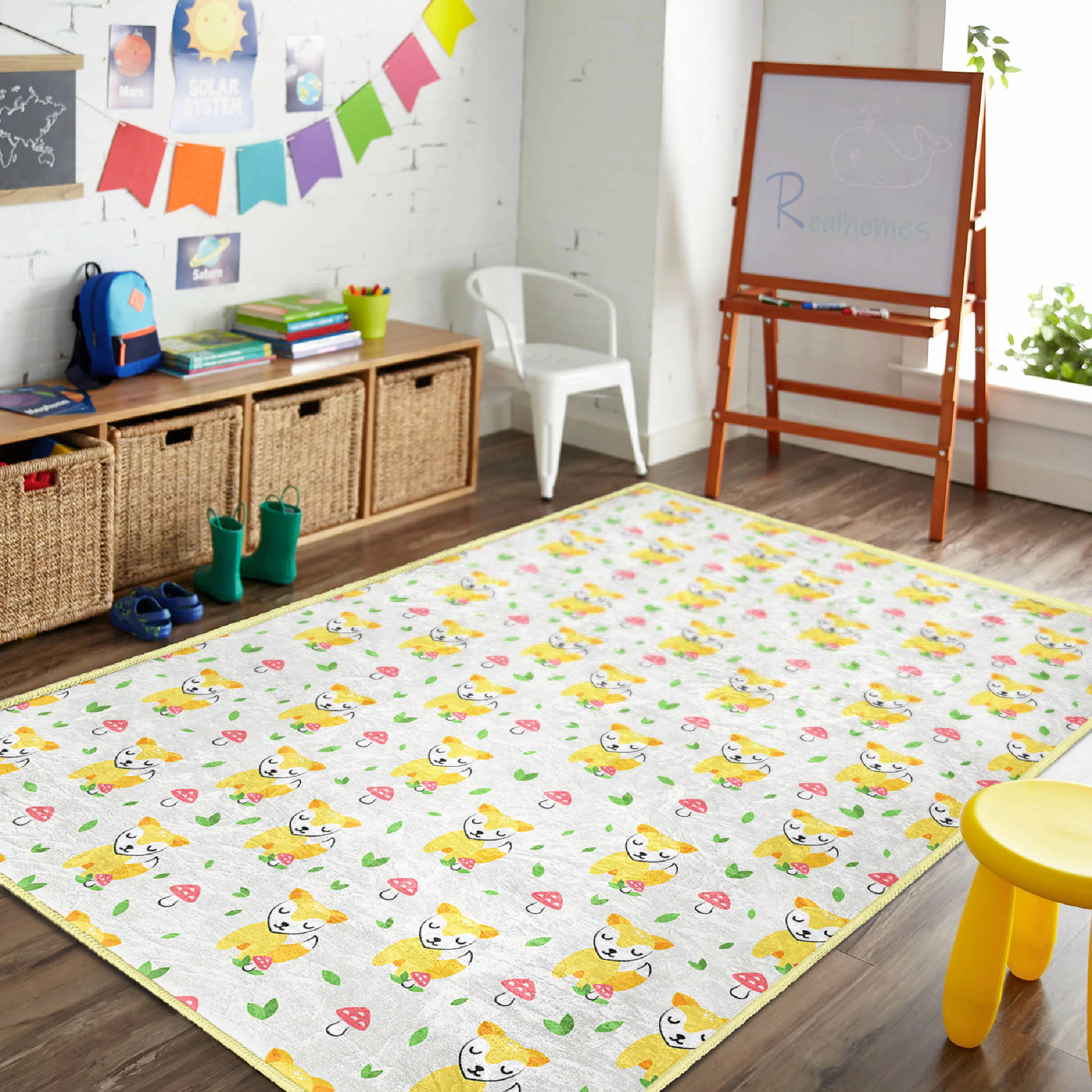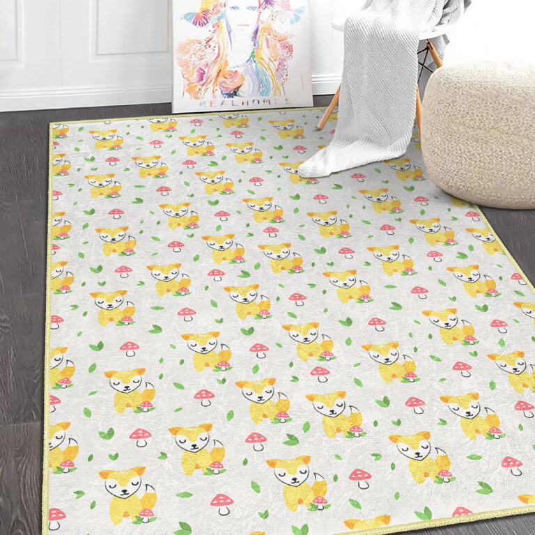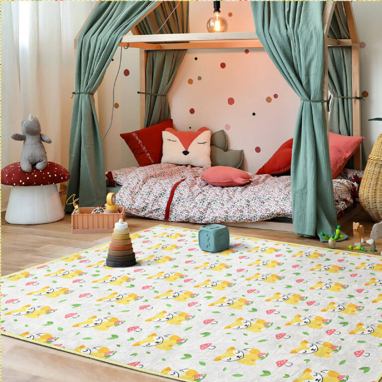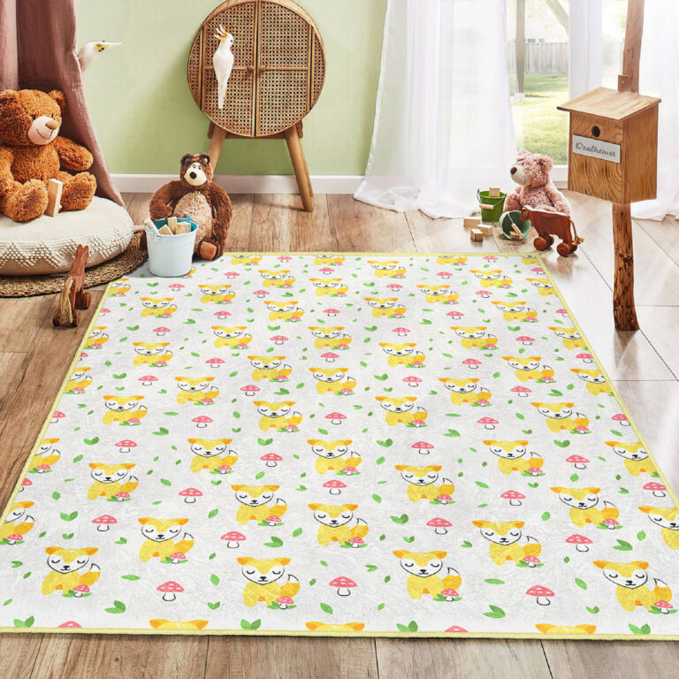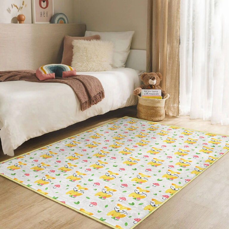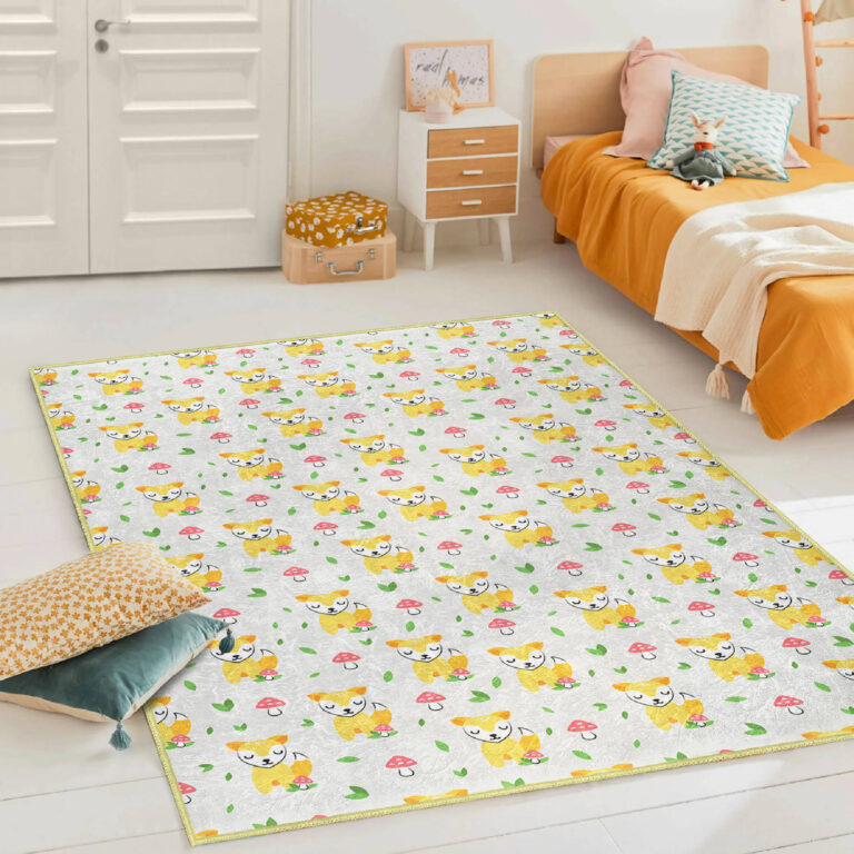 Sevimli Sarı Köpekler ve Mantarlarla Beştaş Desenli Yıkanabilir Kaymaz Taban Çocuk Halısı