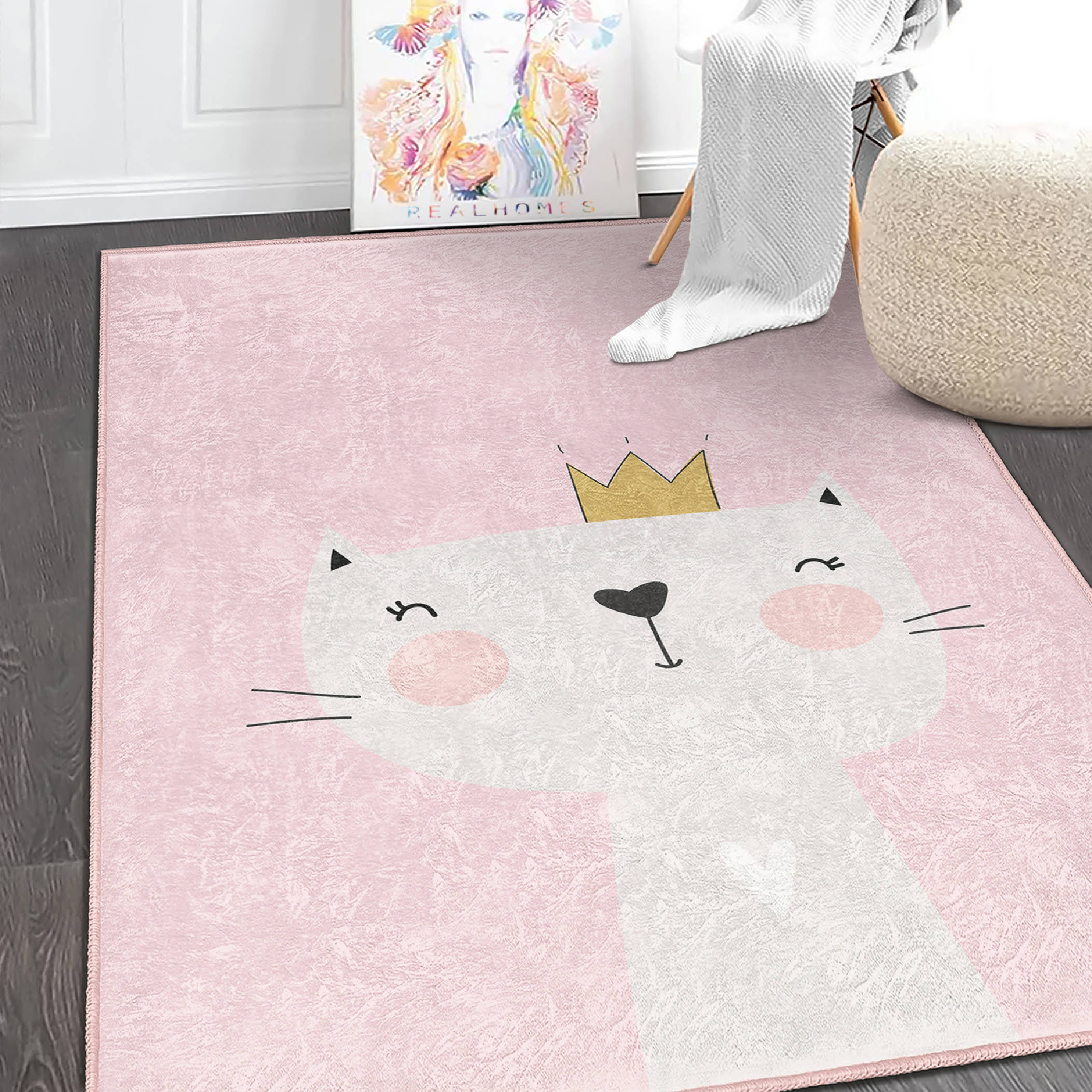Sevimli Taçlı Kedi Desenli Dikdörtgen Çocuk Halısı – Yıkanabilir Kaymaz Tabanlı Kolay Temizlenir
