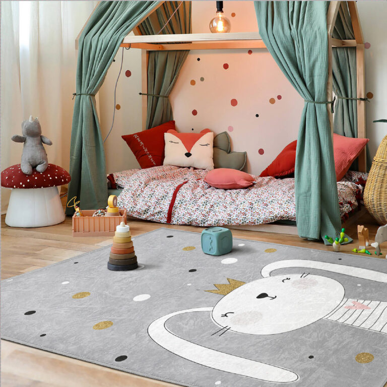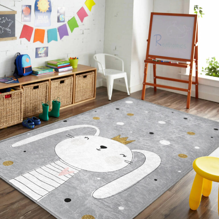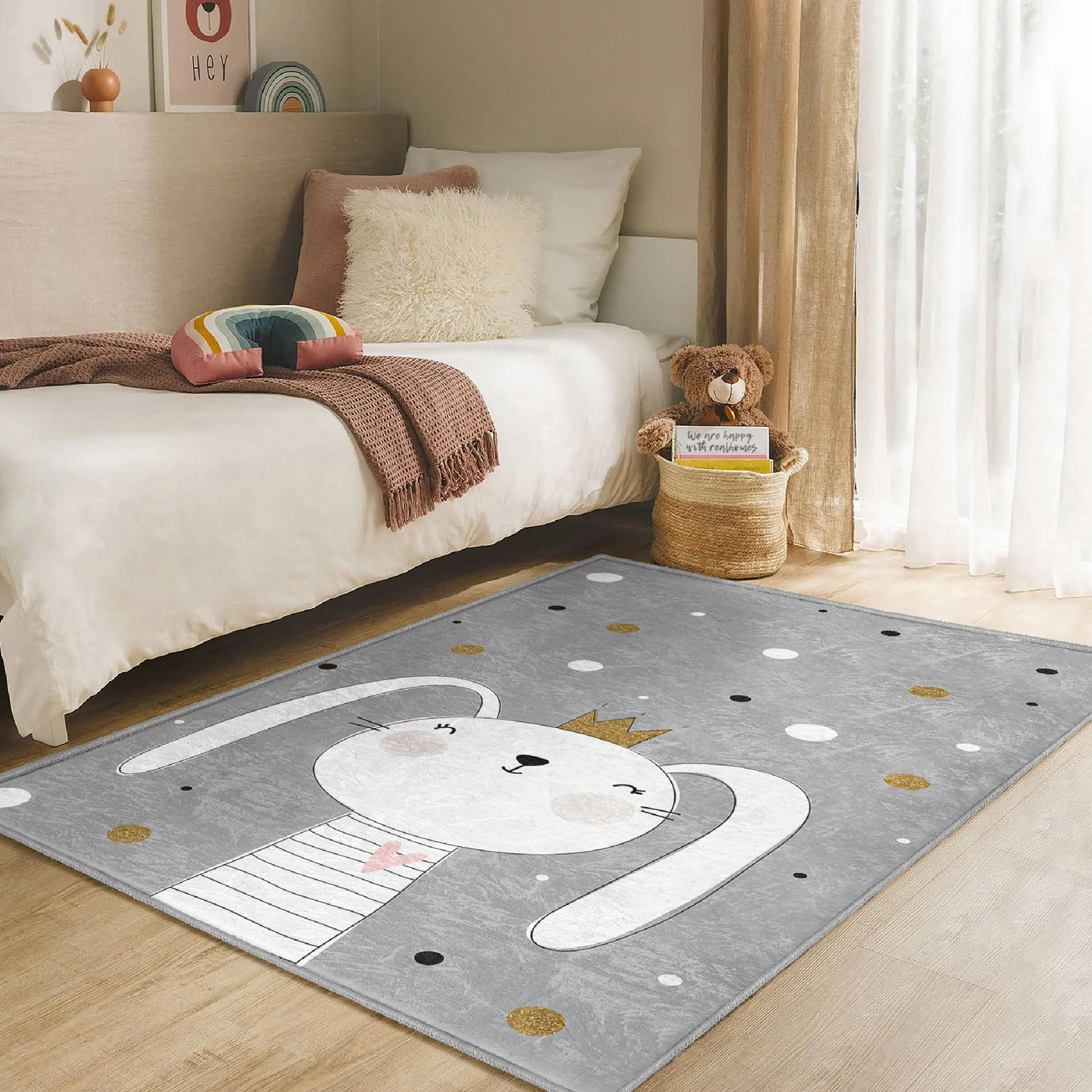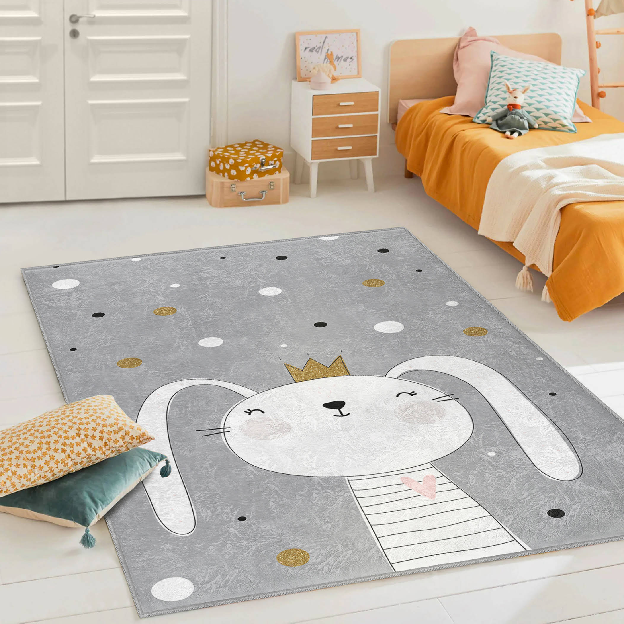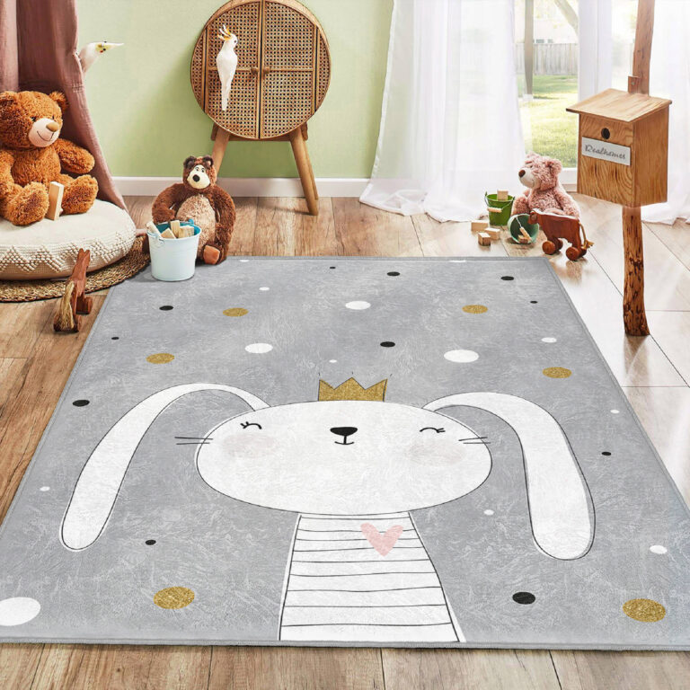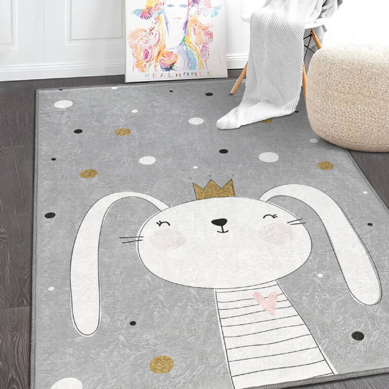 Sevimli Tavşan Desenli Dijital Baskılı Dikdörtgen Çocuk Halısı – Kaymaz Tabanlı ve Yıkanabilir