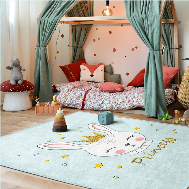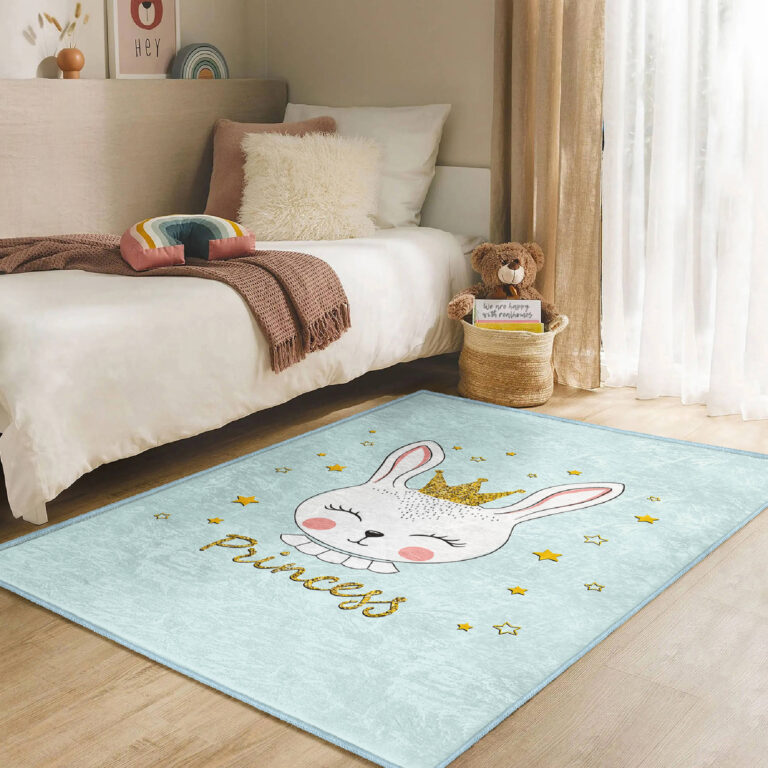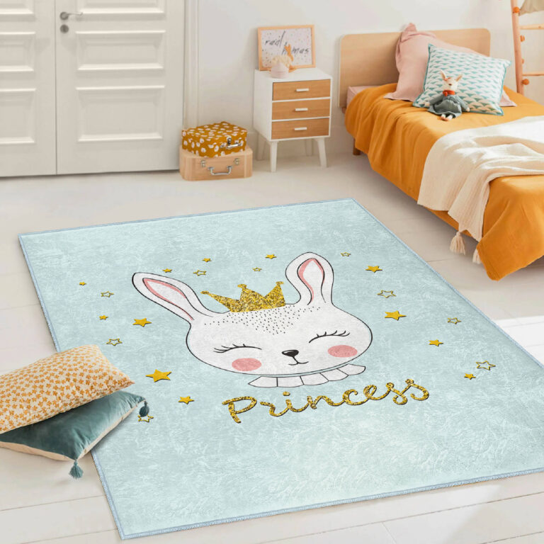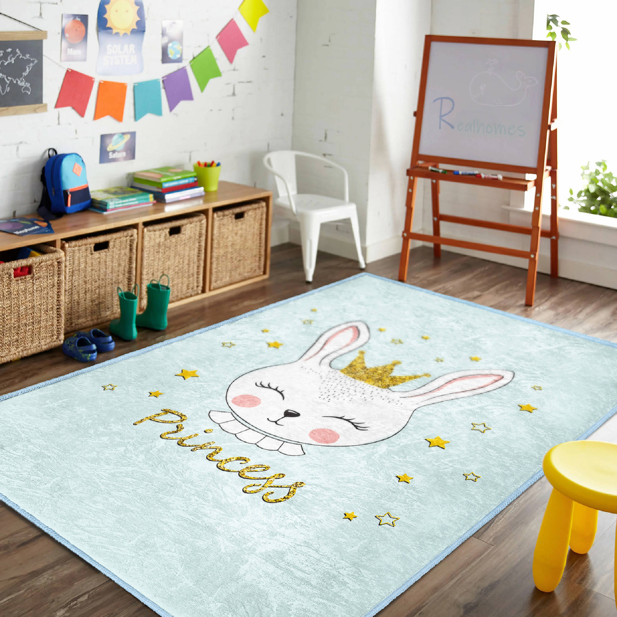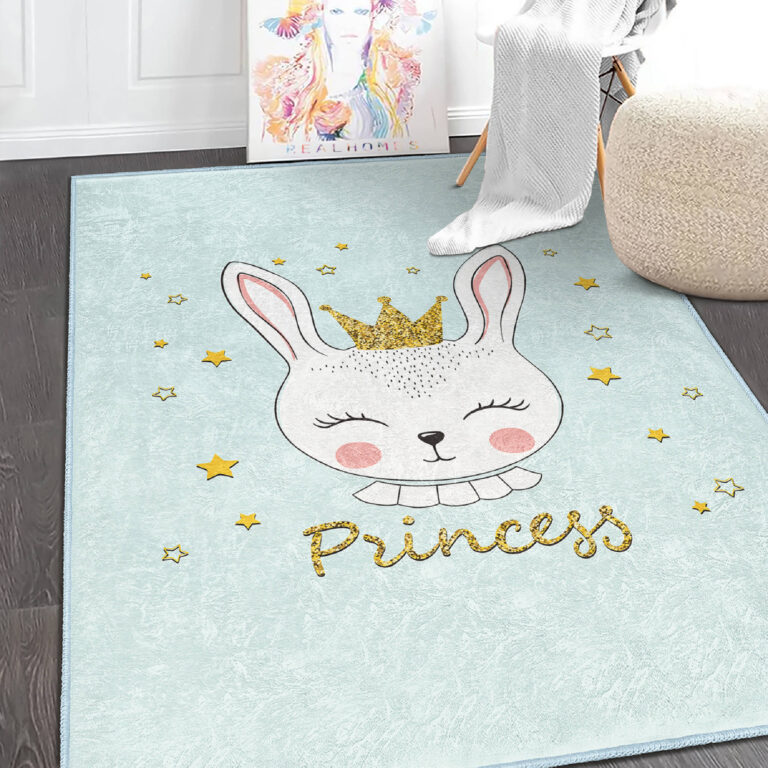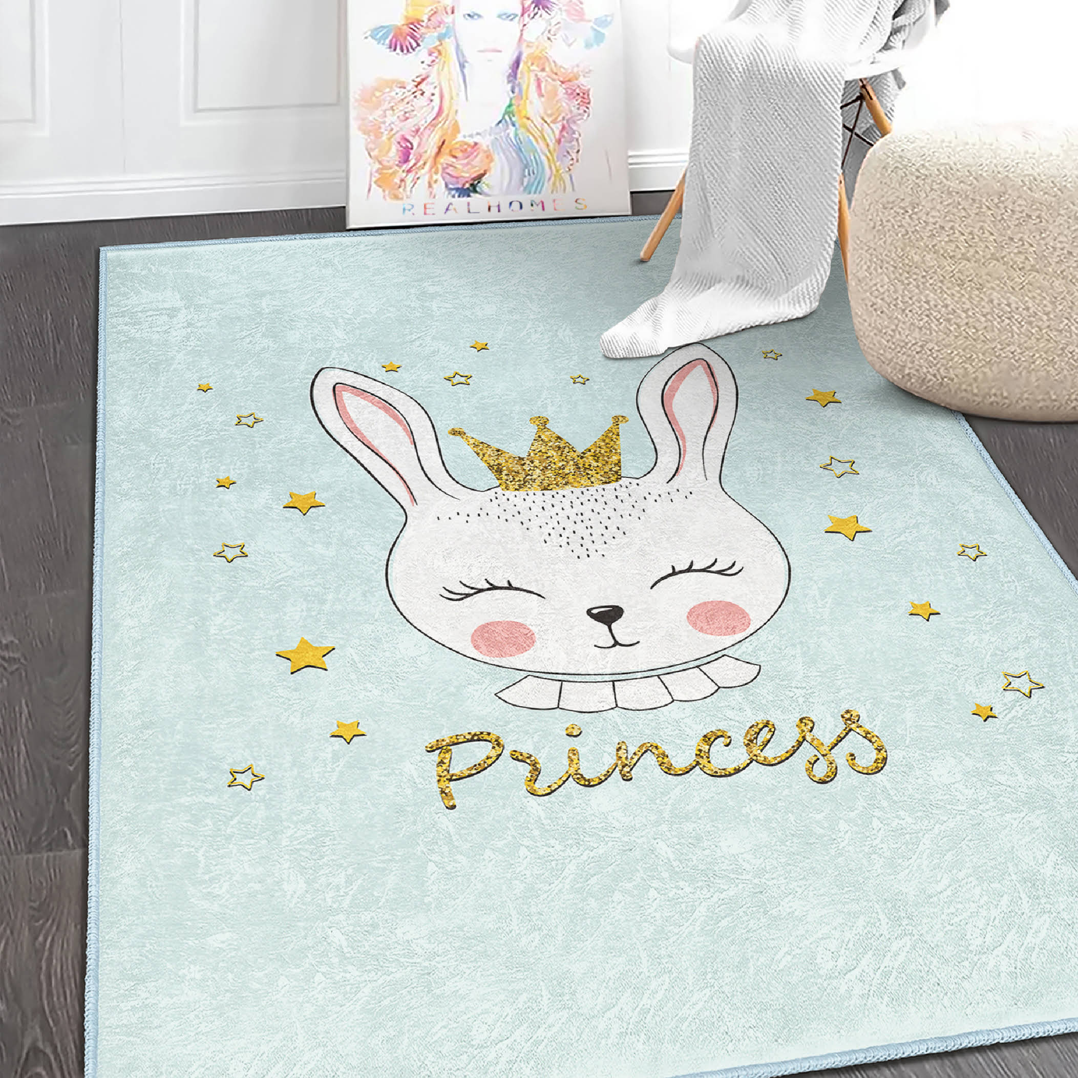 Sevimli Tavşan Figürlü Princess Temalı Yıkanabilir Kaymaz Taban Çocuk Halısı