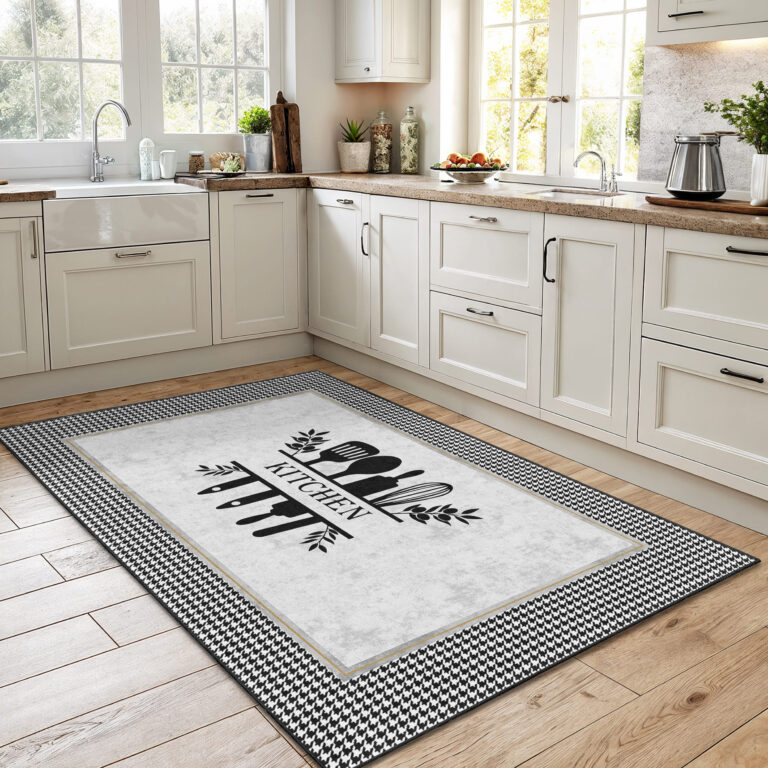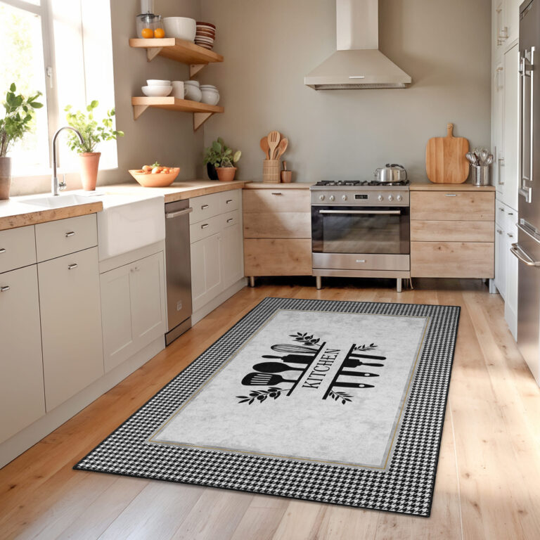 Şık ve Modern Mutfak Tasarımı için Siyah-Beyaz Şerit Desenli Yıkanabilir Kaymaz Taban Halı
