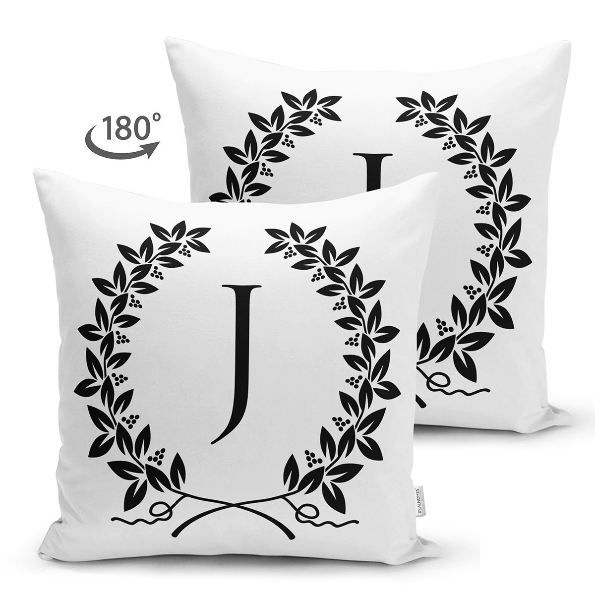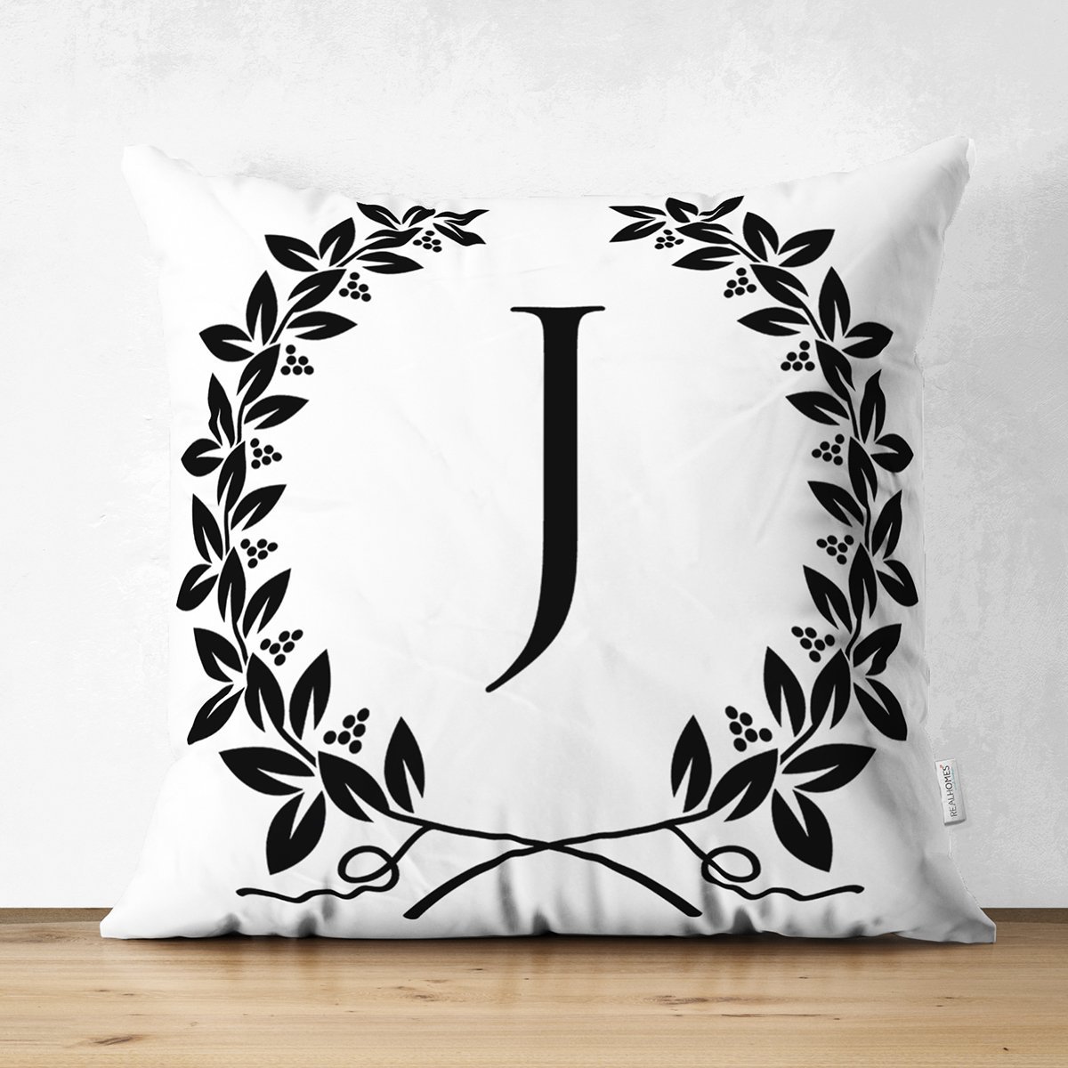 Siyah Beyaz Çelenkli J Harfi Özel Tasarım Modern Suet Yastık Kırlent Kılıfı