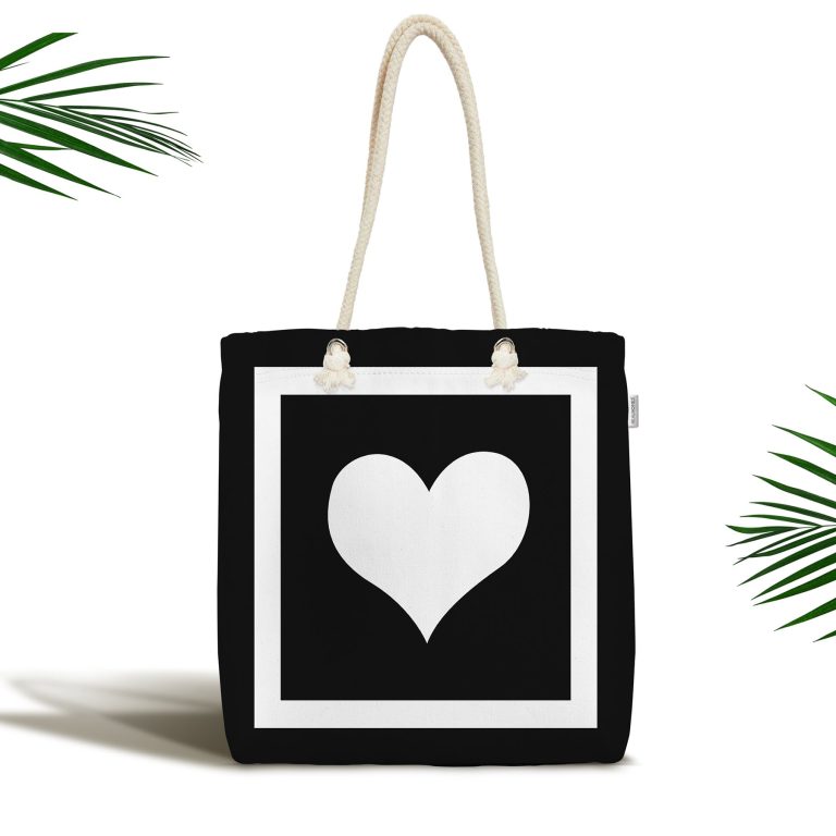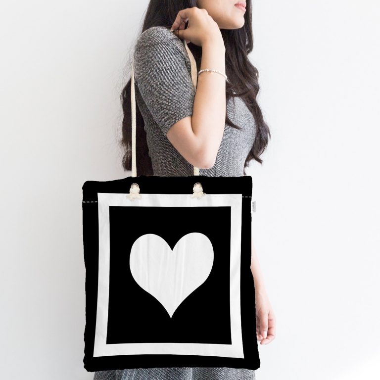 Siyah Beyaz Çerçeveli Kalp Tasarımlı Dijital Baskılı Fermuarlı Kumaş Omuz Çantası