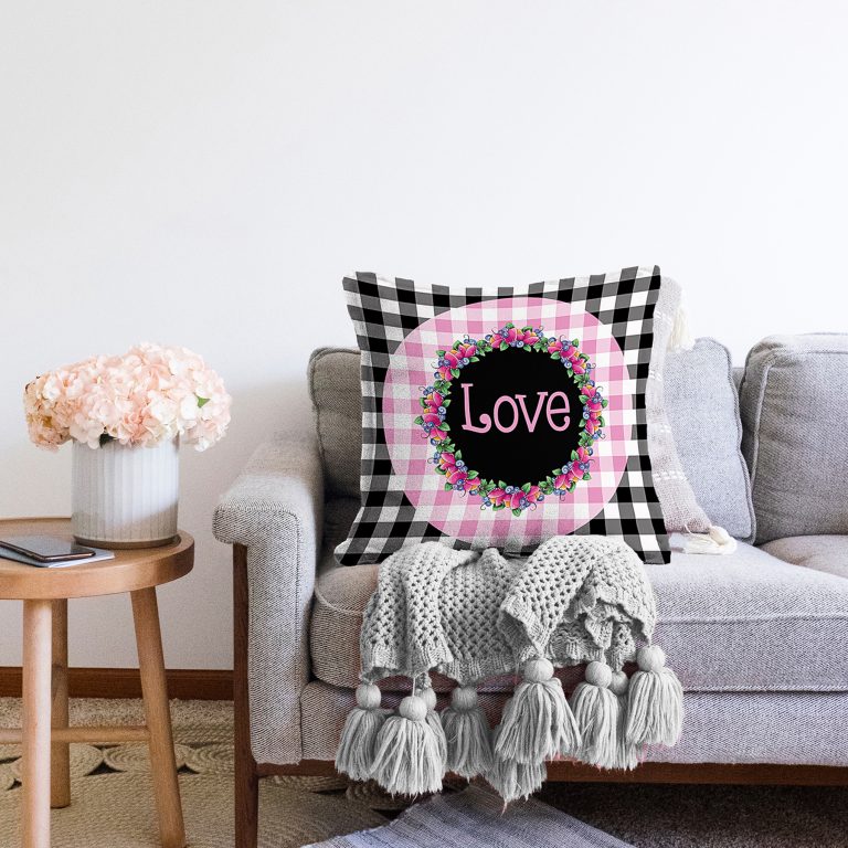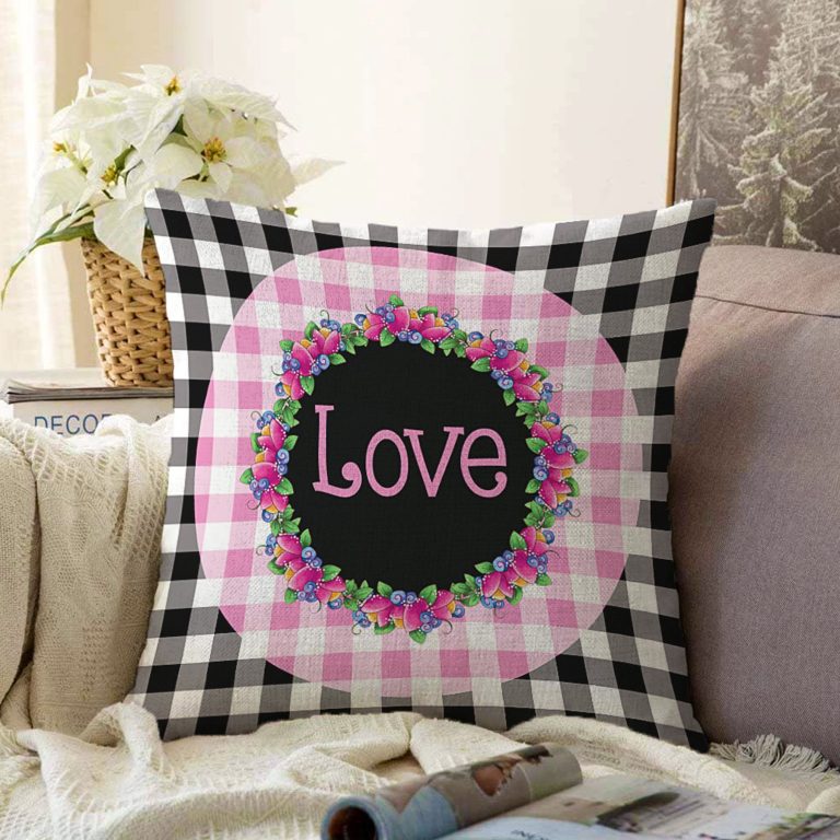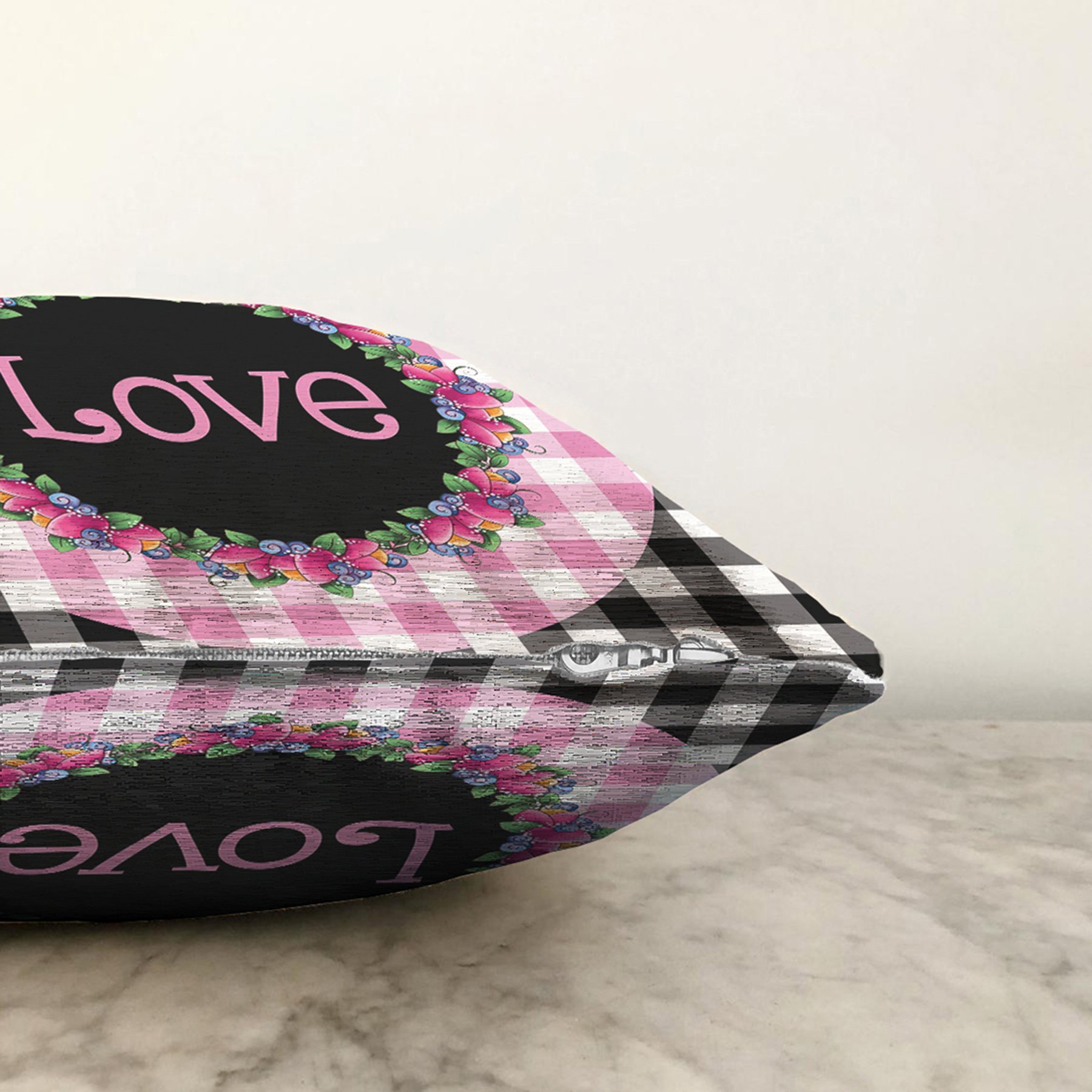 Siyah Beyaz Ekose Pembe Love Temalı Modern Raşel Yastık Kırlent Kılıfı