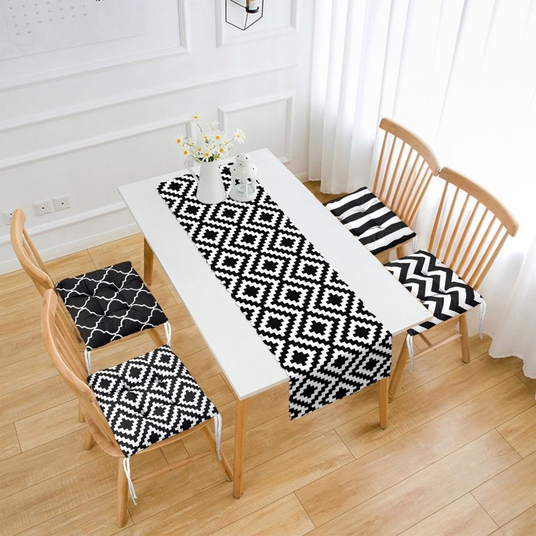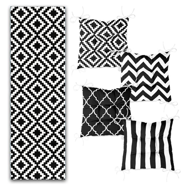 Siyah Beyaz Geometrik Çizimler Tasarımlı 4 Pofidik Sandalye Minderi ve 1 Runner Seti