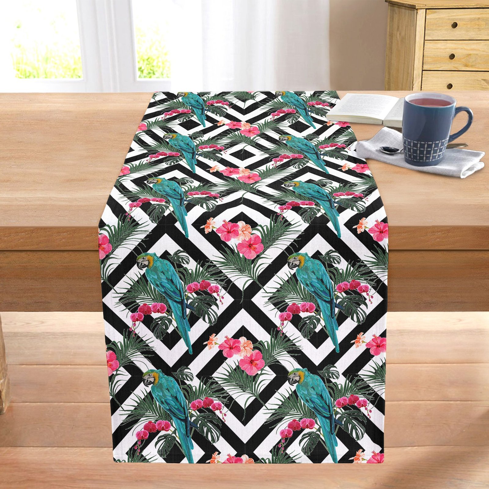 Siyah Beyaz Geometrik Kareli Papağan Motifli Dikişli Şönil Runner