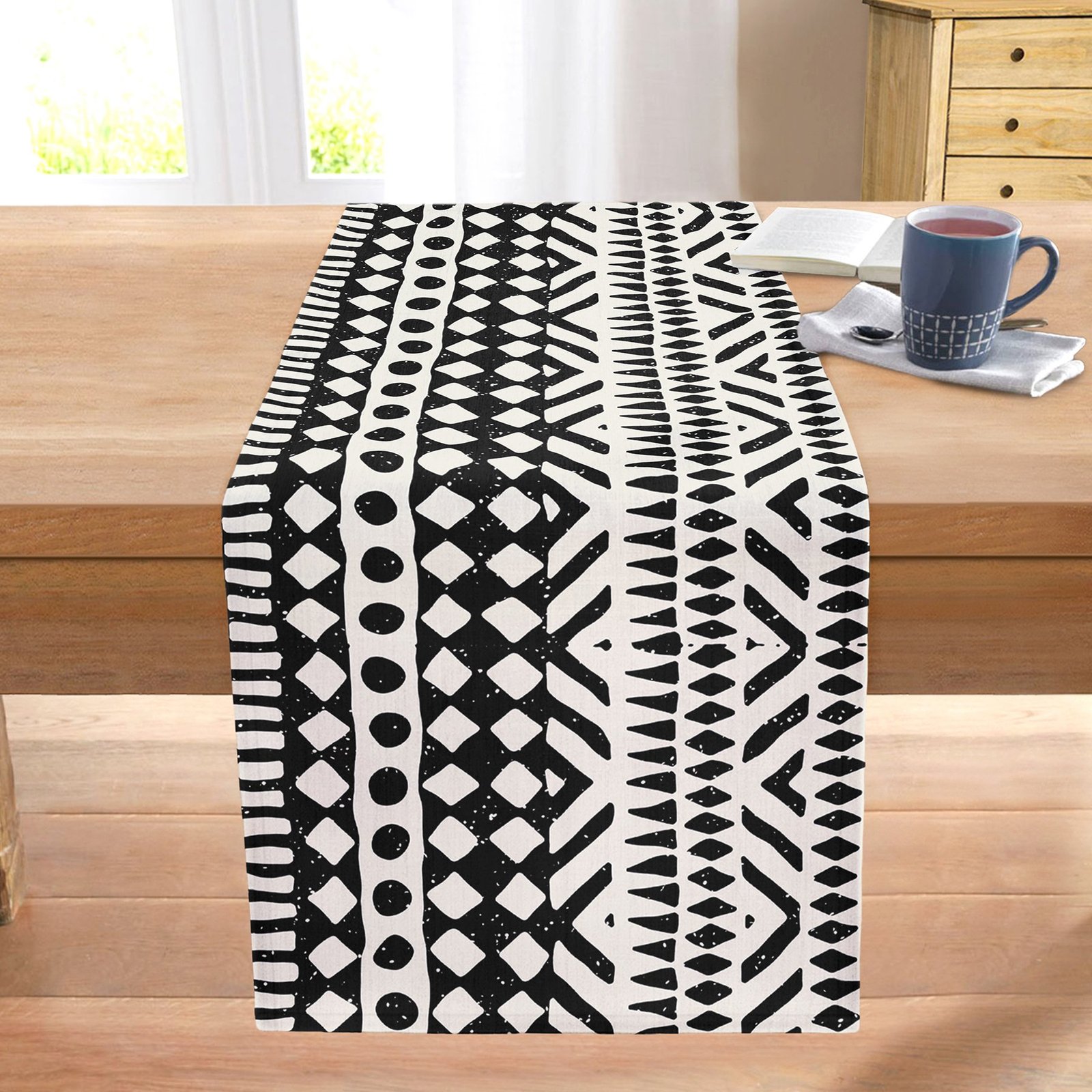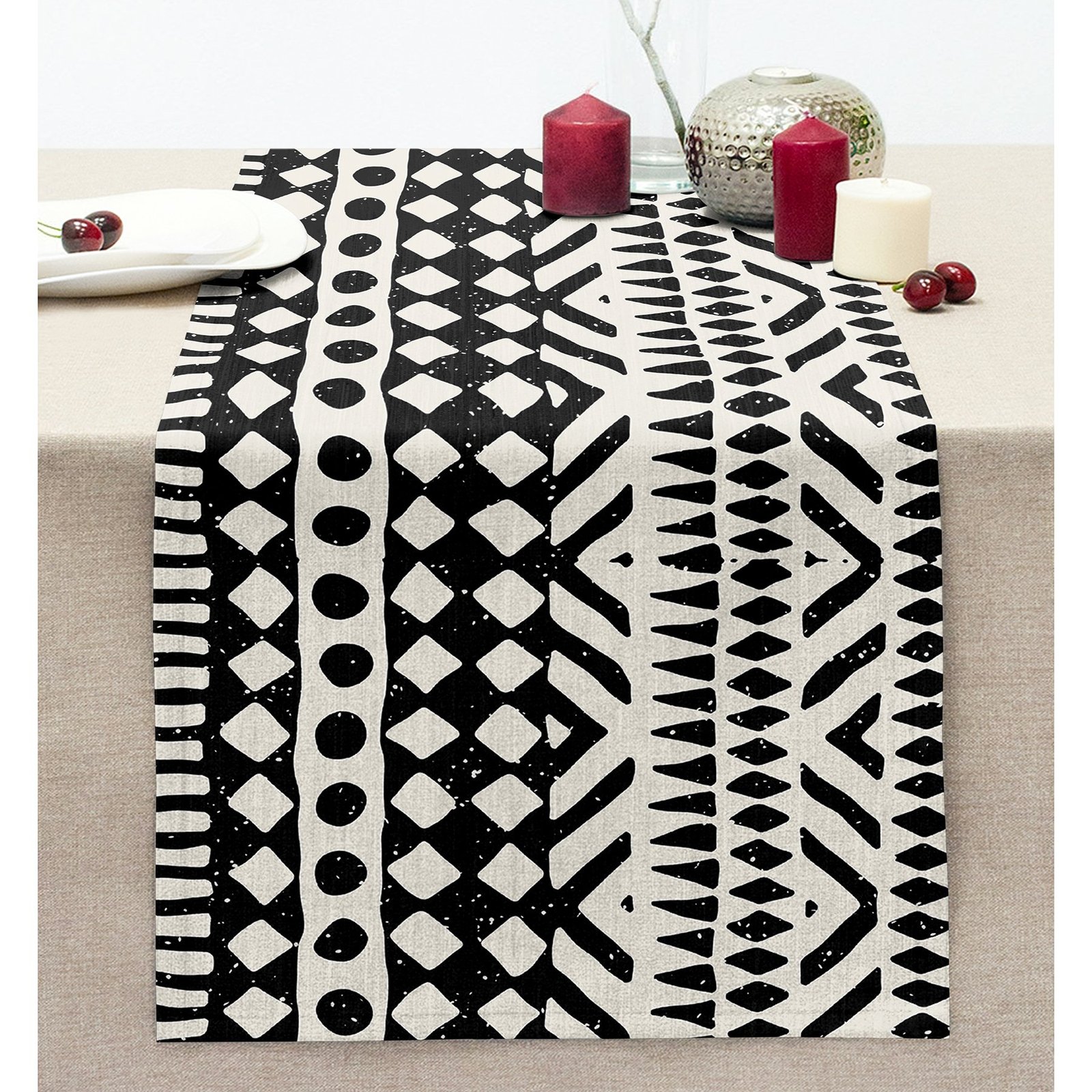 Siyah Beyaz İskandinav Desen Tasarımlı Dijital Baskılı Dekoratif Dikişli Şönil Runner