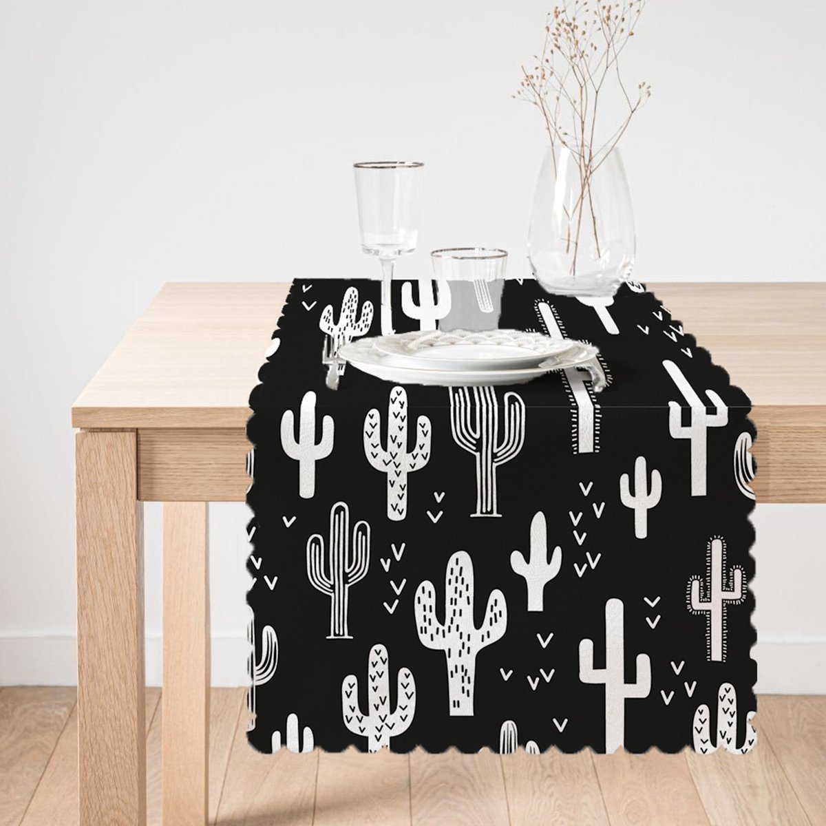Siyah Beyaz Kaktüs Baskılı Dekoratif Özel Tasarım Runner