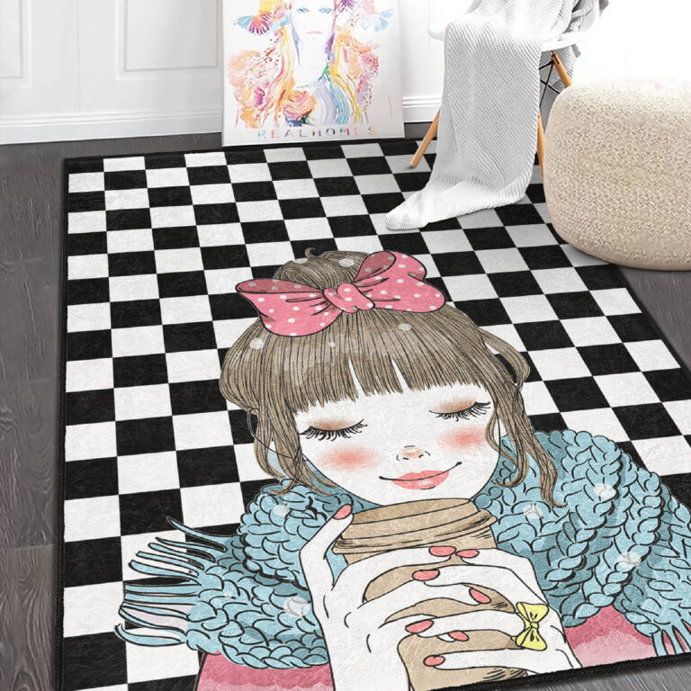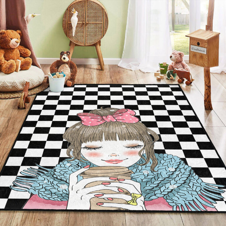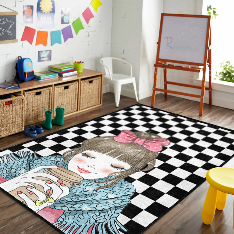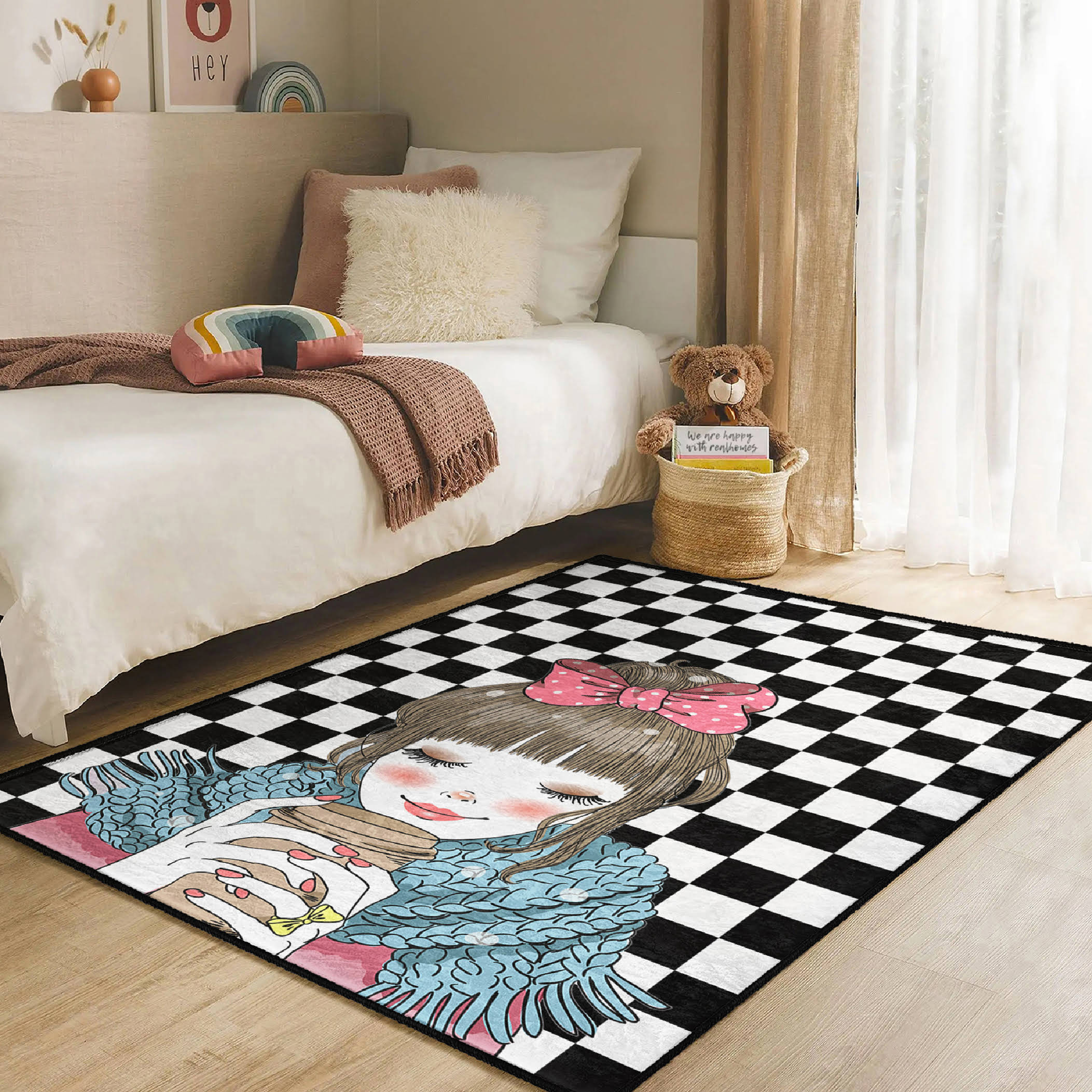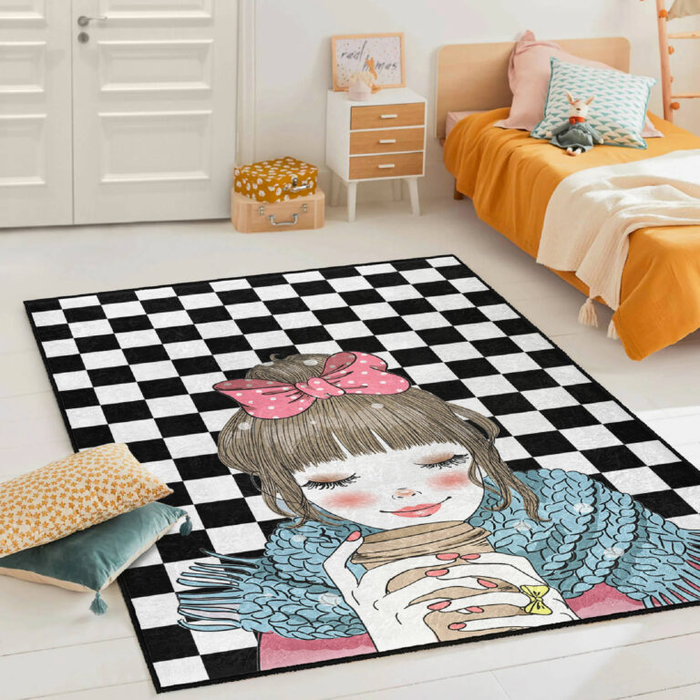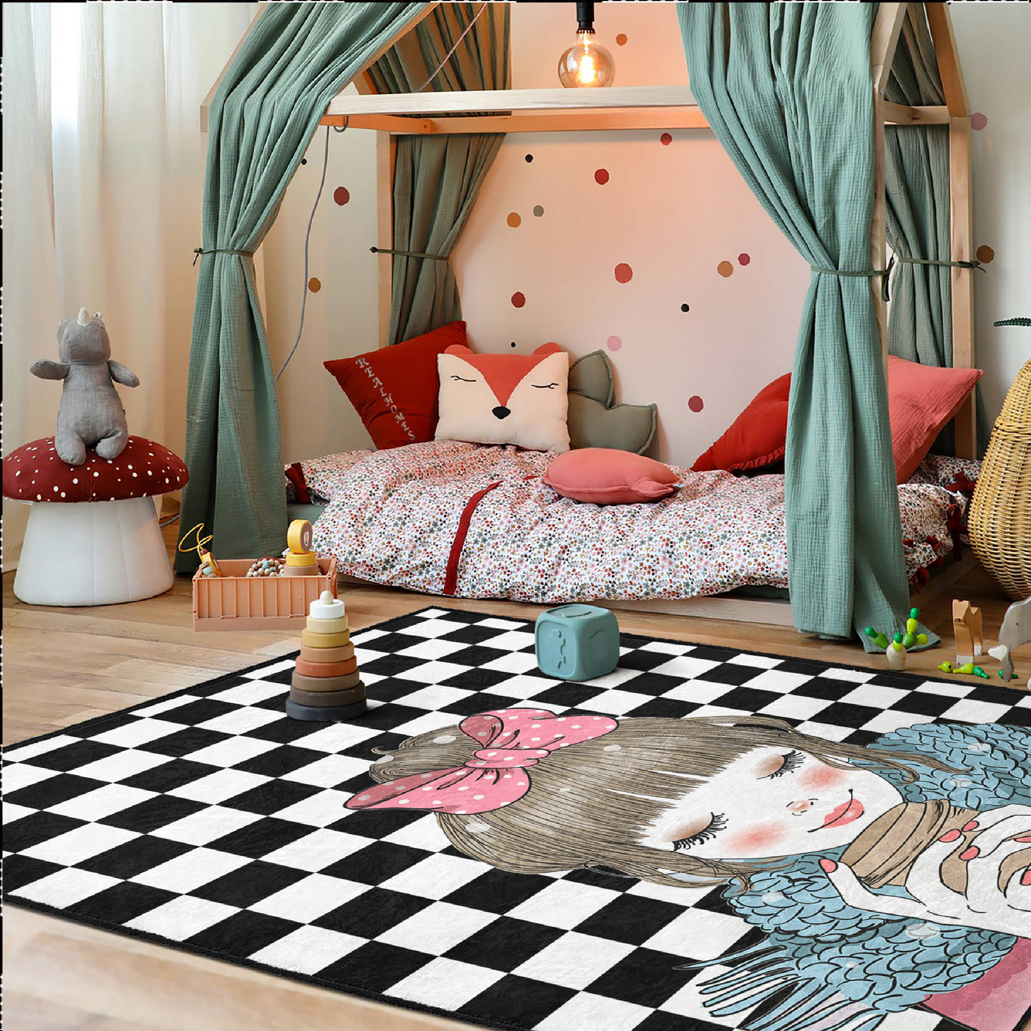 Siyah Beyaz Kare Desenli Yıkanabilir Dikdörtgen Çocuk Halısı – Kaymaz Tabanlı Rahat Kullanım