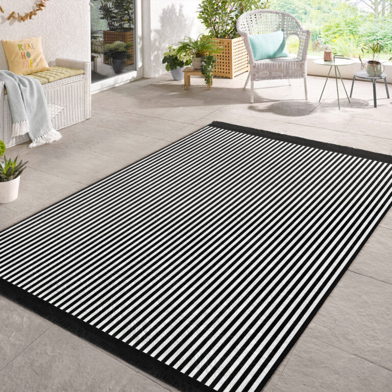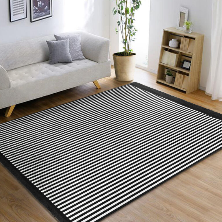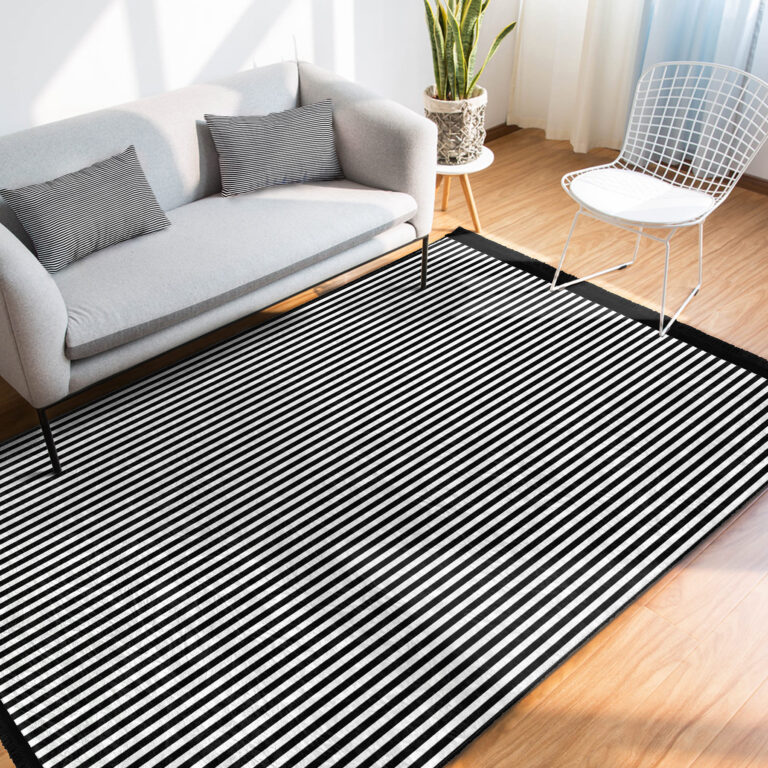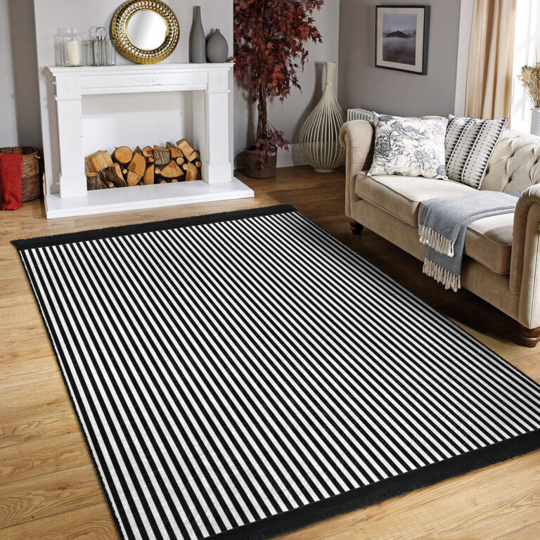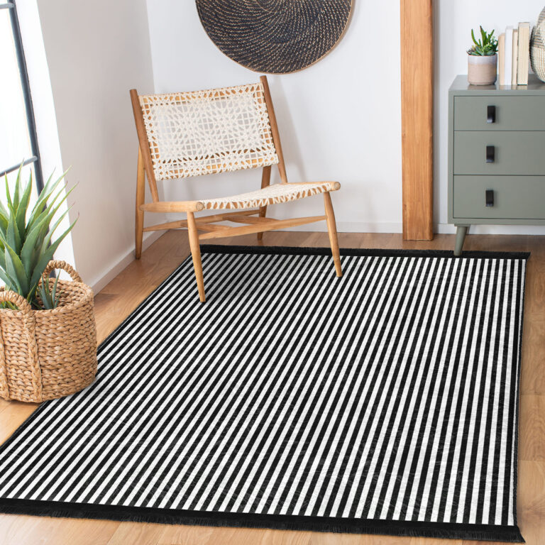 Siyah – Beyaz Zeminde Çizgili Motifli Geometrik Desenli Geometrik Sade & Şık Ofis Salon & Oturma Odası Dijital Baskılı Makinede Yıkanabilir Kaymaz Taban Saçaklı Halı