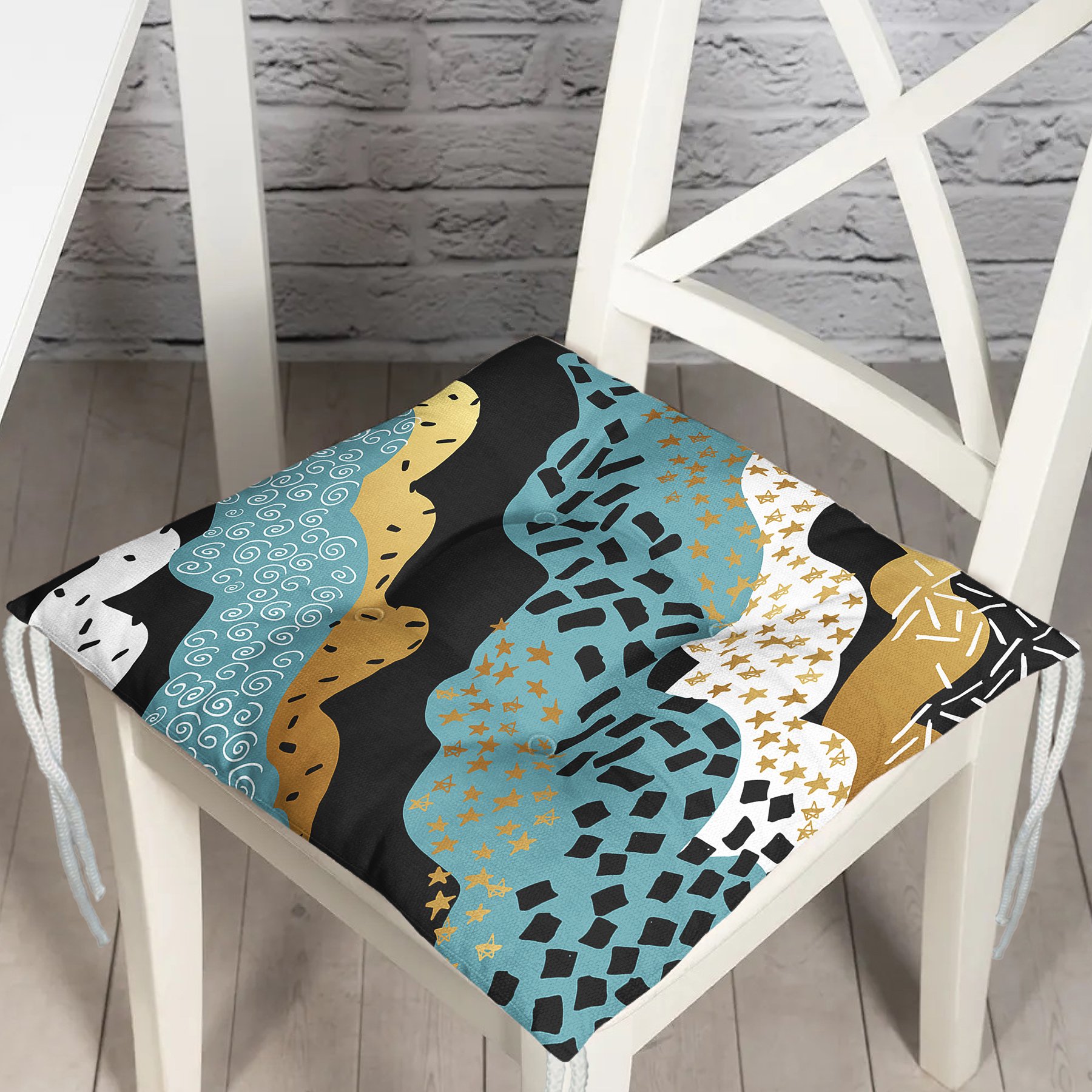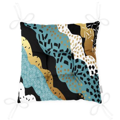 Siyah Beyaz Zeminde Gold Detaylı Renkli Çizim Dijital Baskılı Modern Pofidik Sandalye Minderi