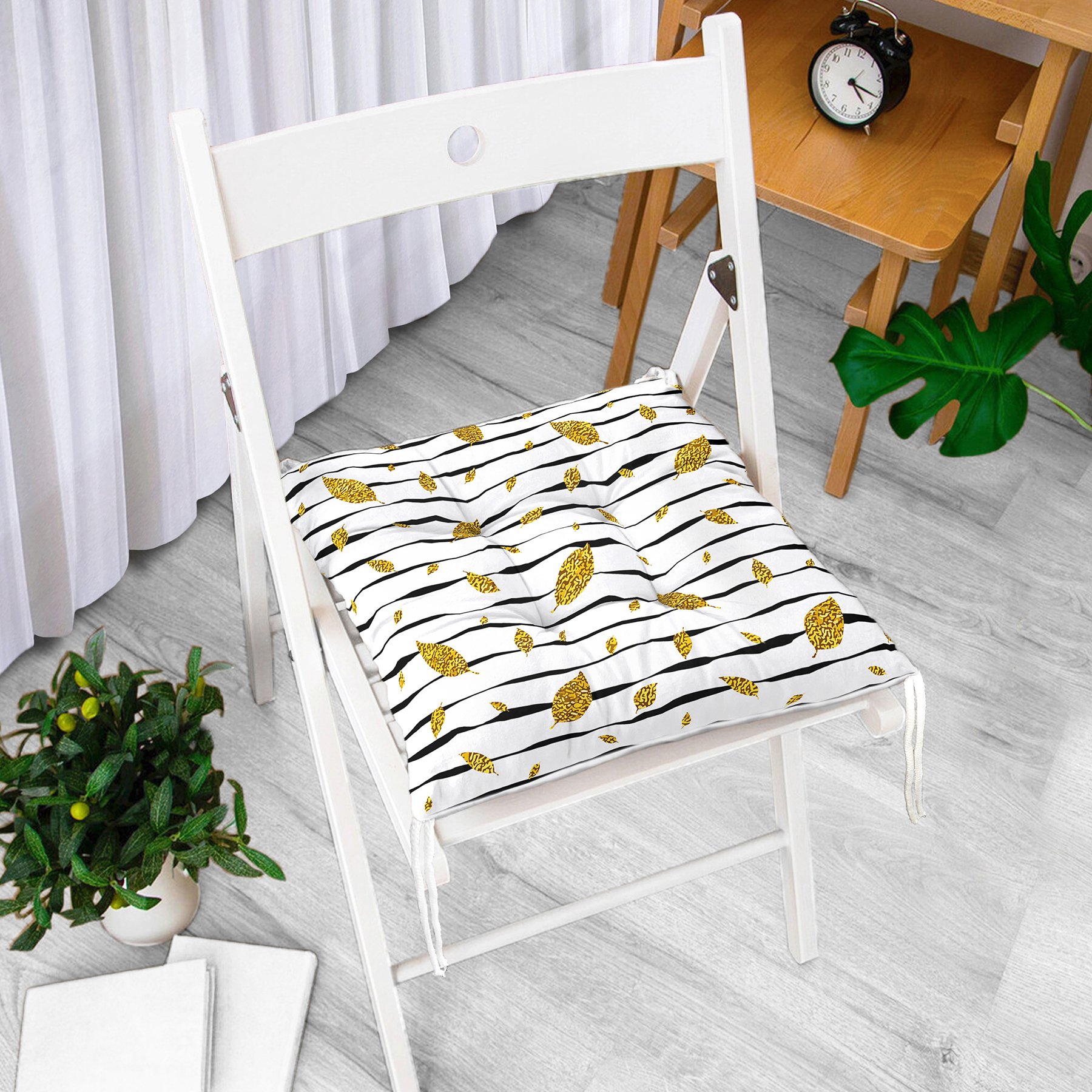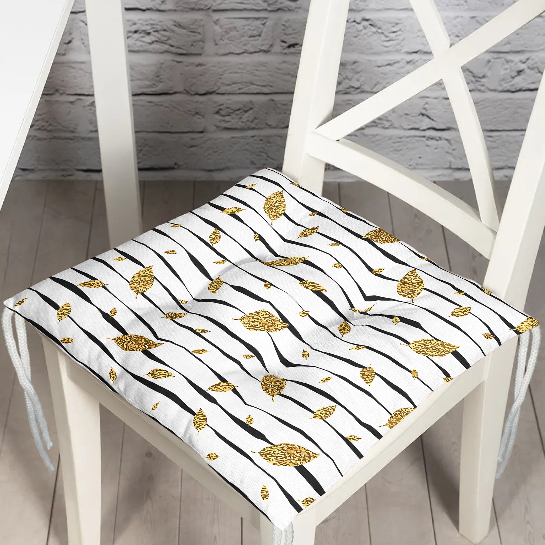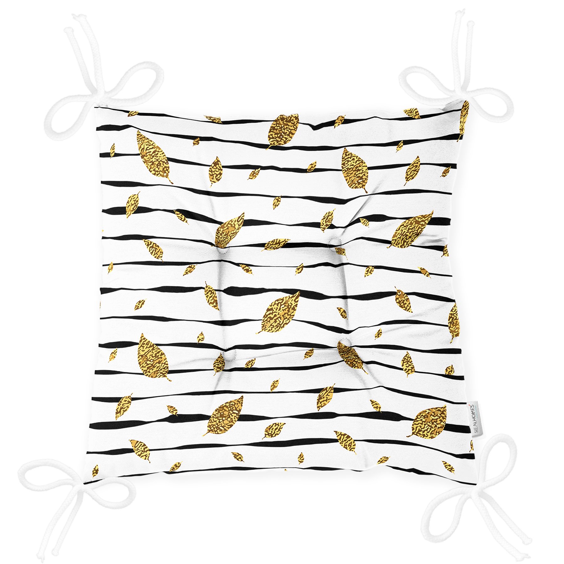Siyah Beyaz Zeminli Gold Yaprak Desenli Dijital Baskılı Modern Pofidik Sandalye Minderi