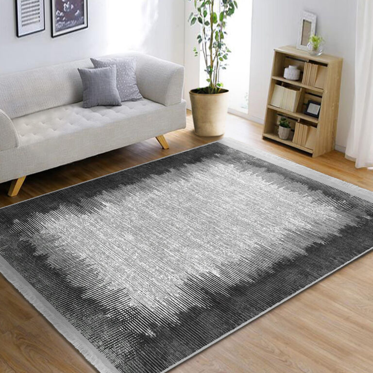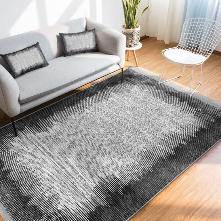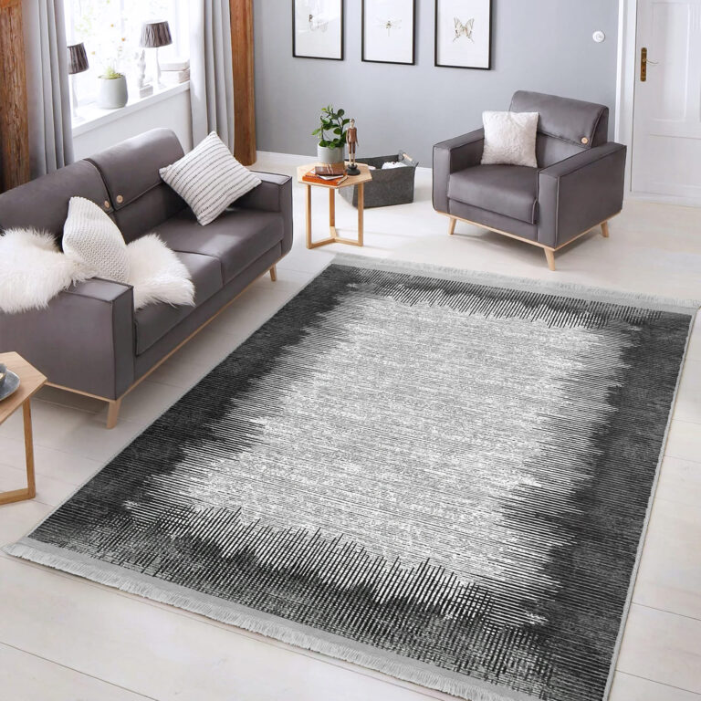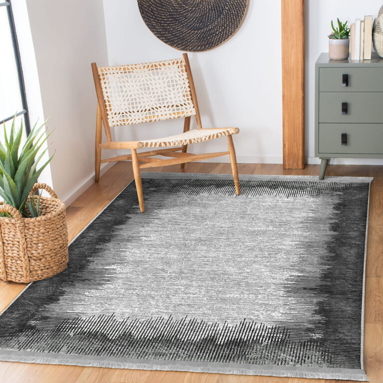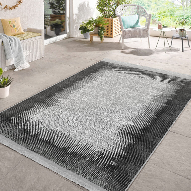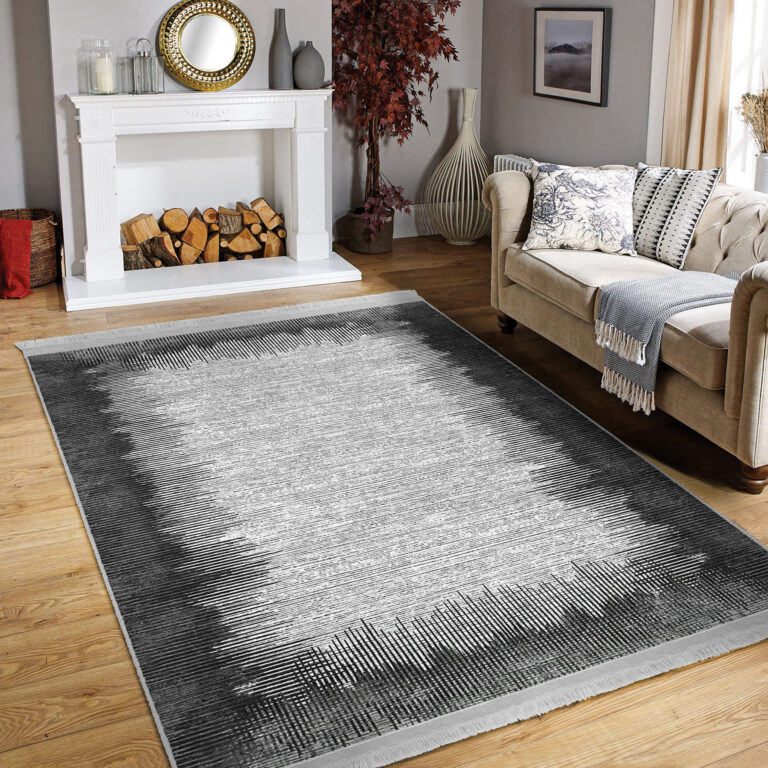 Siyah – Gri Zeminde Çerçeveli Motifli Eskitme Desenli Eskitme Motifli Vintage Salon & Oturma Odası Yatak Odası Dijital Baskılı Makinede Yıkanabilir Kaymaz Taban Saçaklı Halı