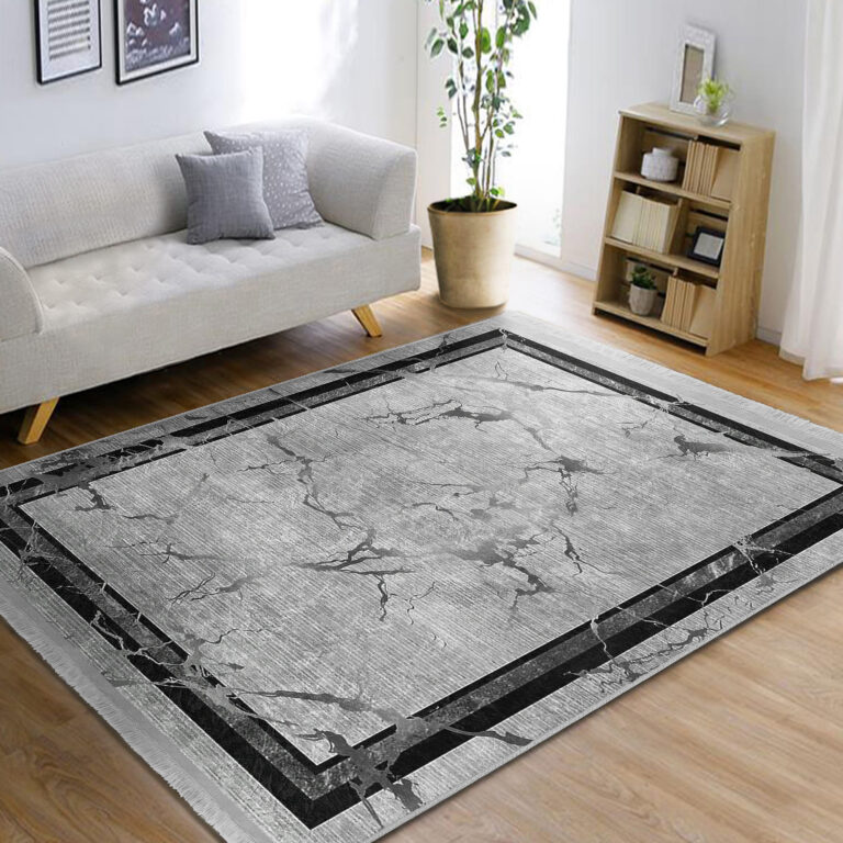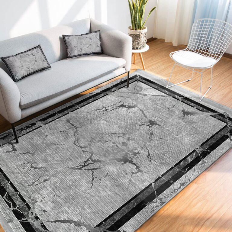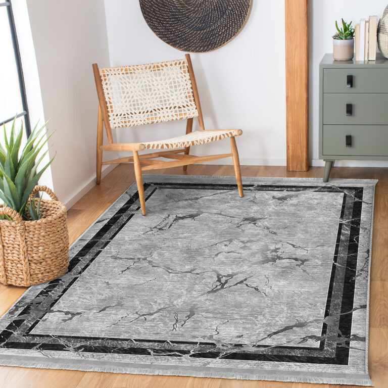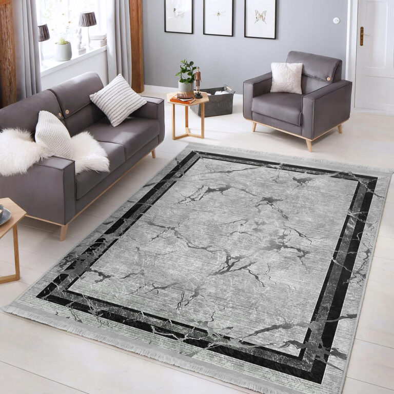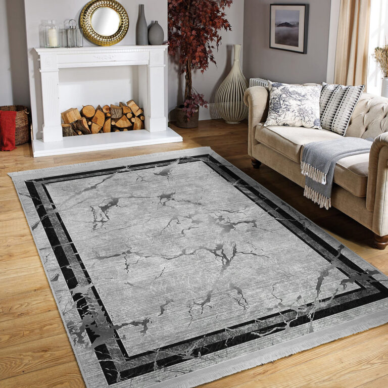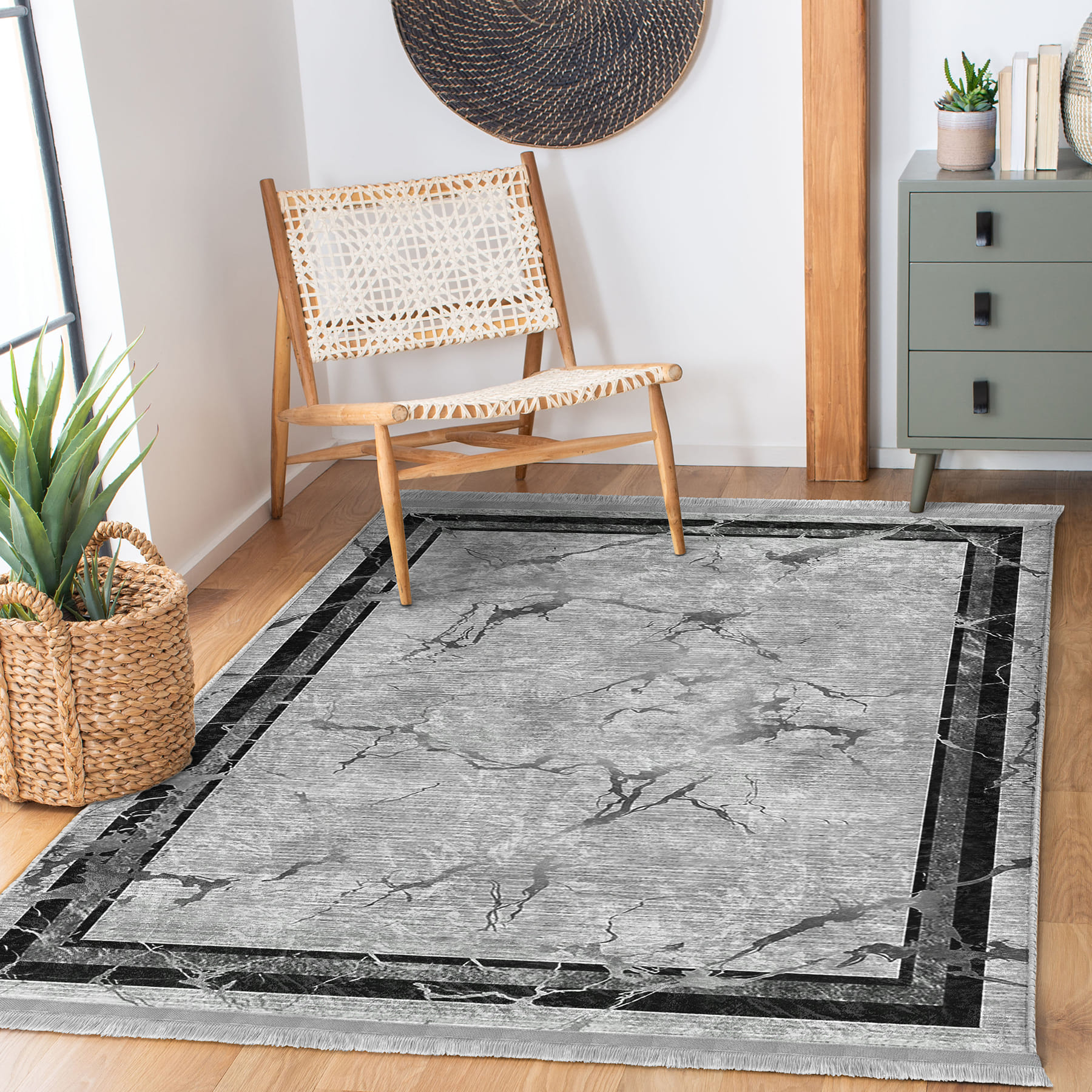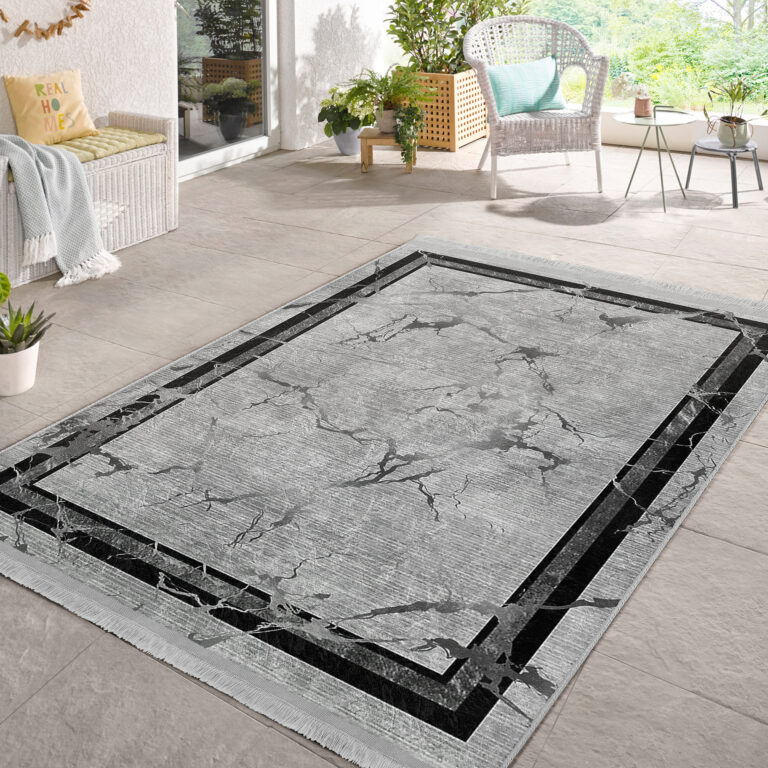 Siyah – Gri Zeminde Çerçeveli Motifli Mermer Desenli Geometrik Eskitme Motifli Salon & Oturma Odası Dış Mekan & Outdoor Dijital Baskılı Makinede Yıkanabilir Kaymaz Taban Saçaklı Halı