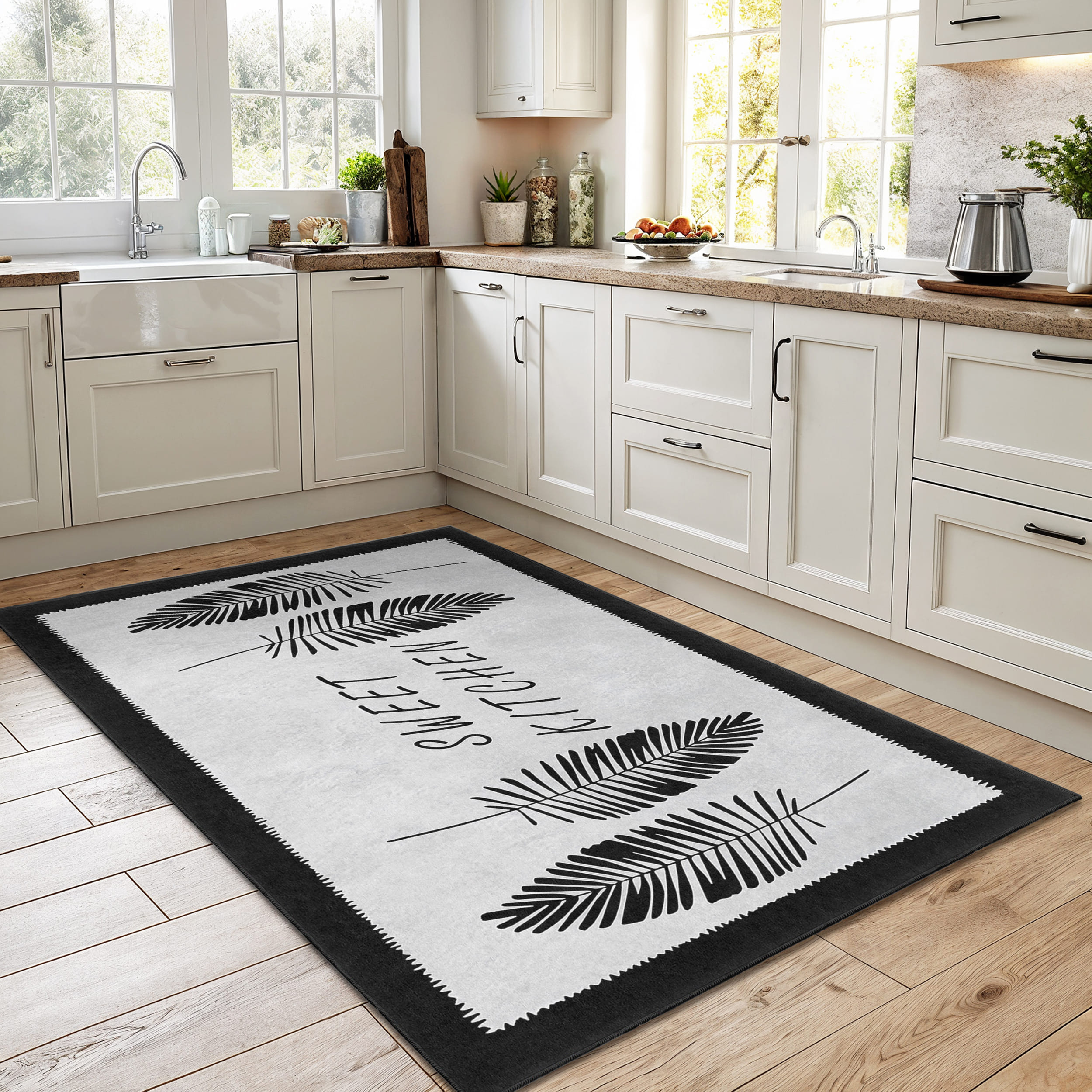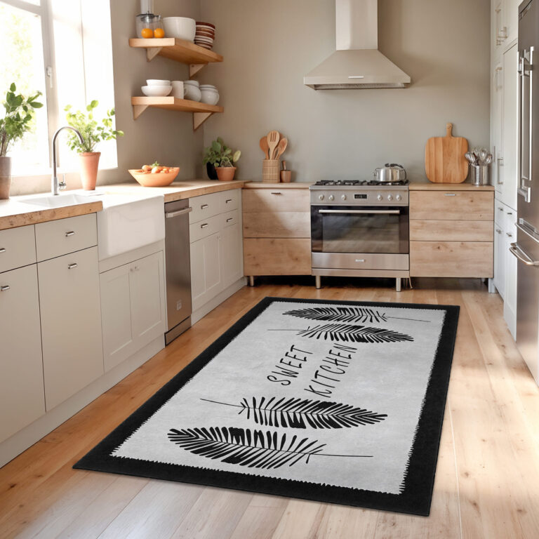 Siyah Yaprak Desenli Yıkanabilir Kaymaz Taban Mutfak Halısı – Şık ve Modern Tasarım