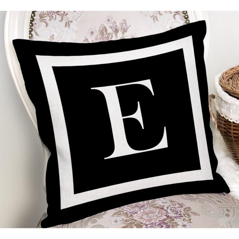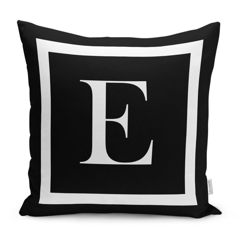 Siyah Zemin Beyaz Çerçeveli E Harfi Dijital Baskılı Kırlent Kılıfı