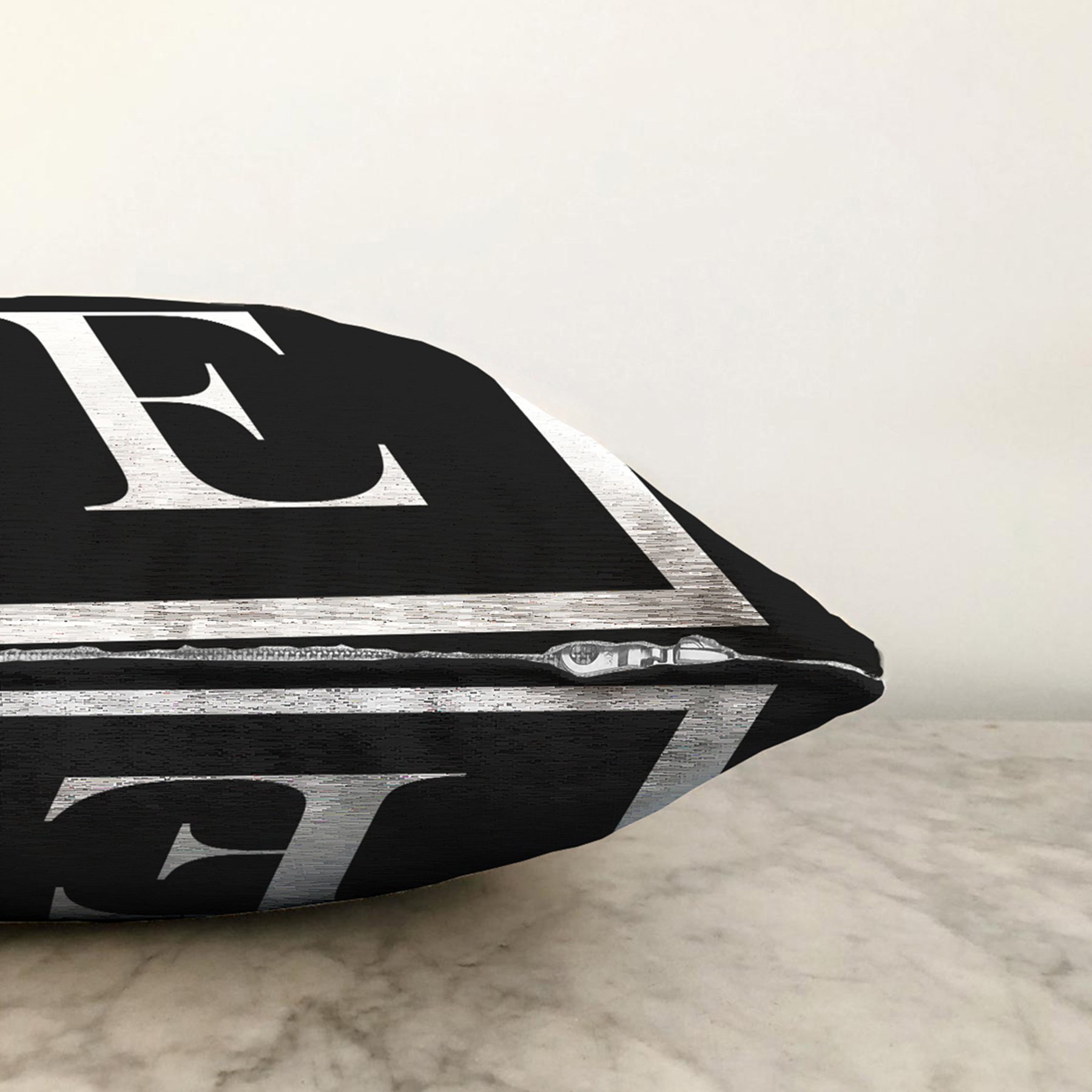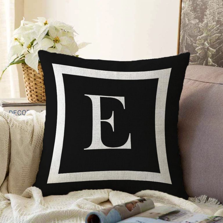 Siyah Zemin Beyaz Çerçeveli E Harfi Dijital Baskılı Raşel Yastık Kırlent Kılıfı