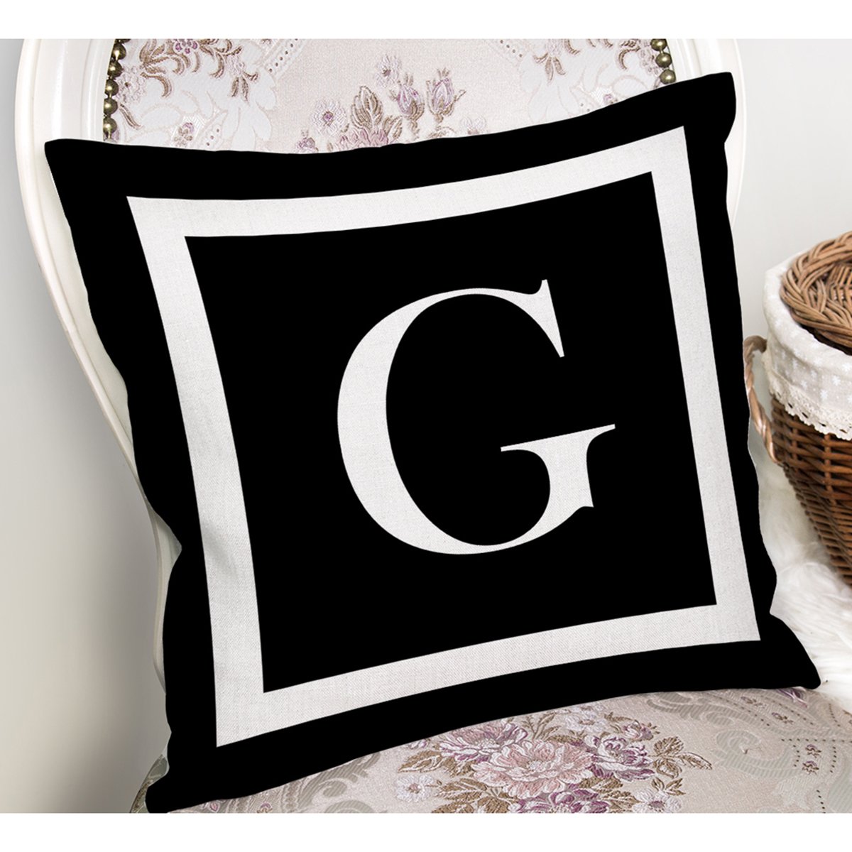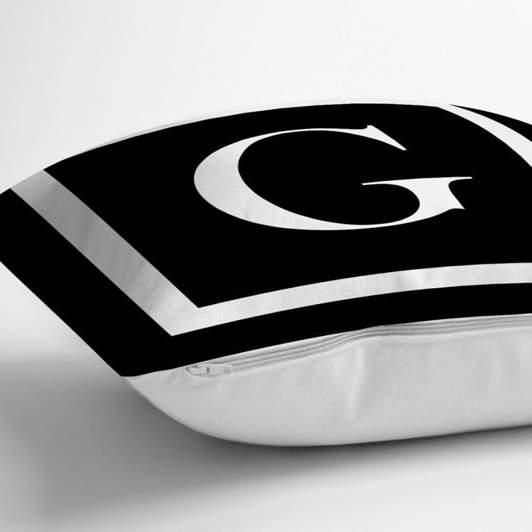 Siyah Zemin Beyaz Çerçeveli G Harfi Dijital Baskılı Kırlent Kılıfı