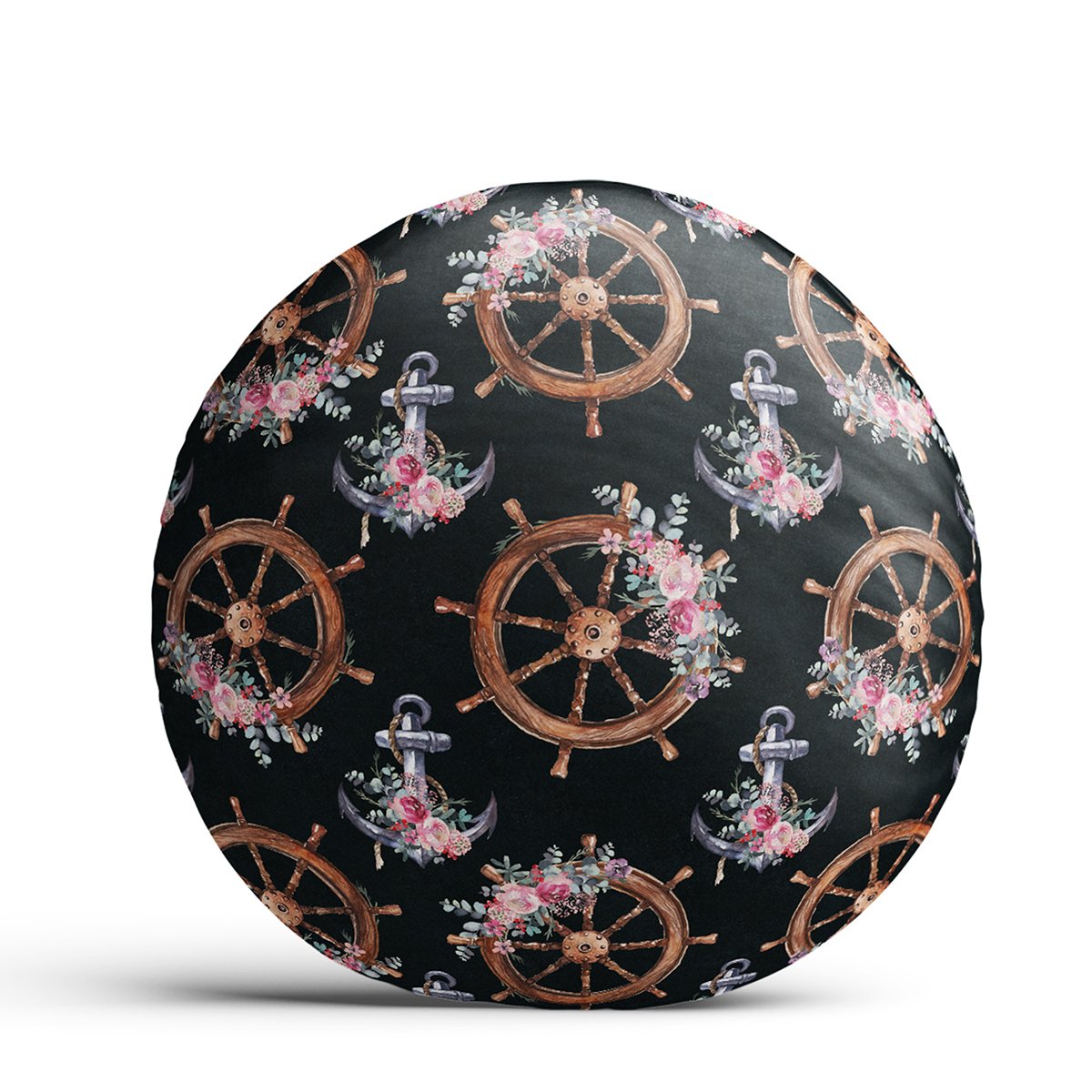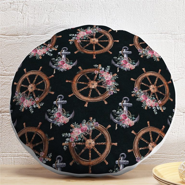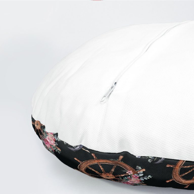 Siyah Zemin Çapa & Dümen Tasarımlı Dijital Baskılı Modern Yuvarlak Yastık Kırlent Kılıfı