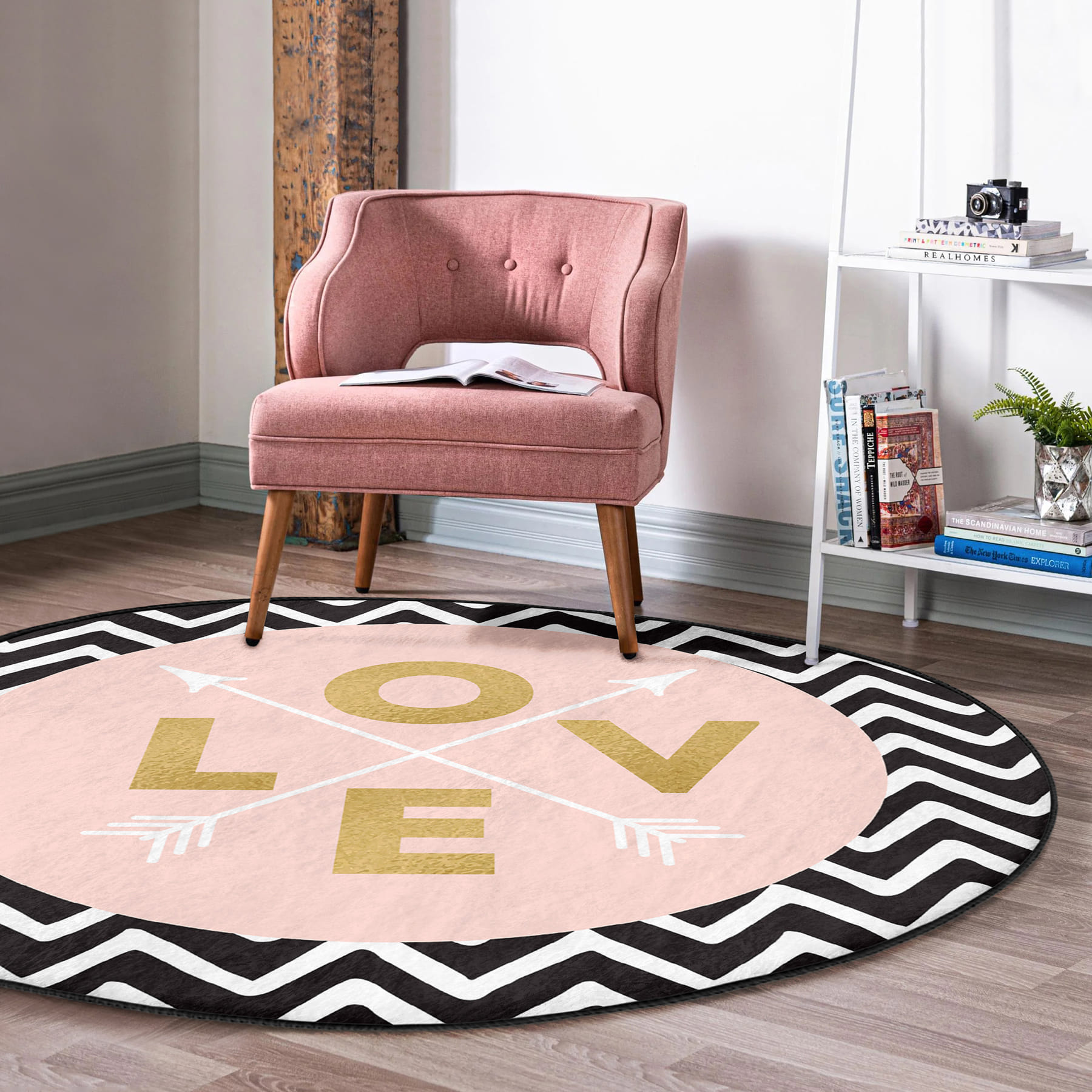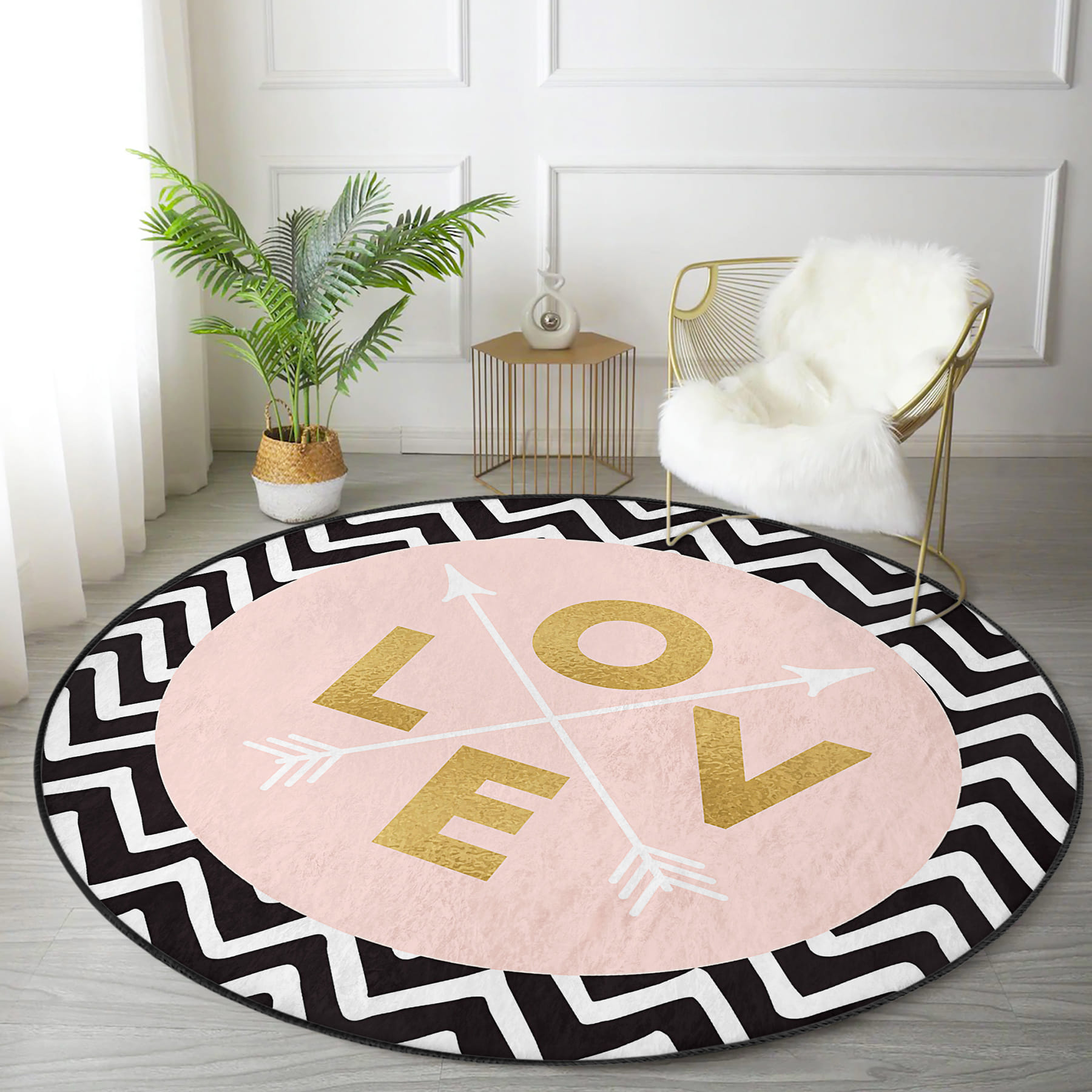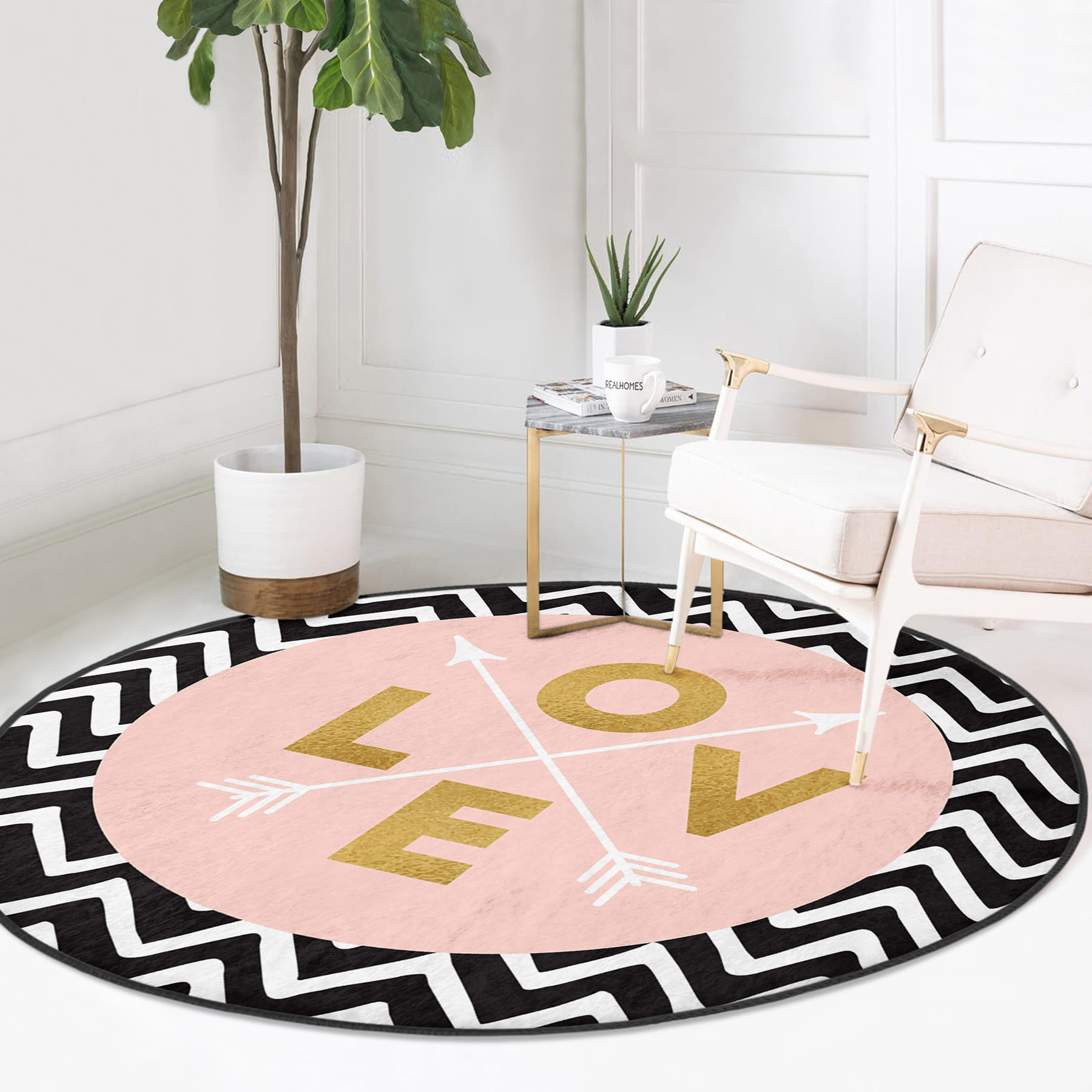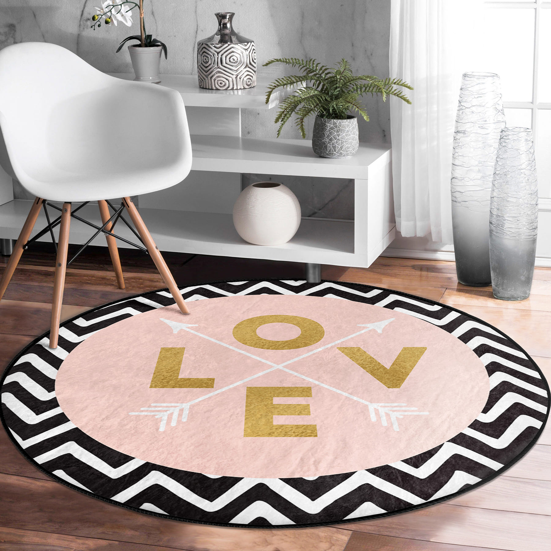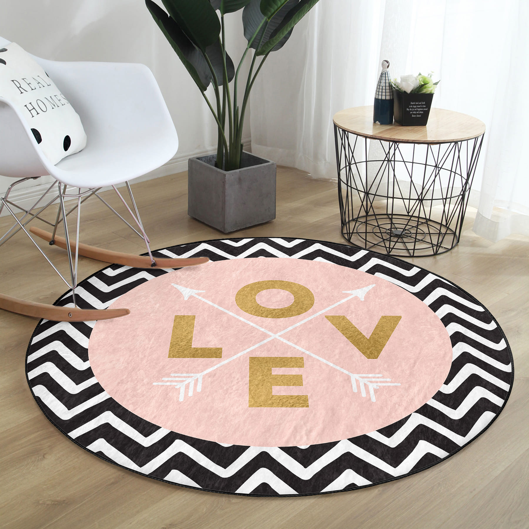 Siyah Zemin Geometrik Zikzak Desenli Love Yazılı Pembe Banyo Yıkanabilir Kaymaz Taban Yuvarlak Halı