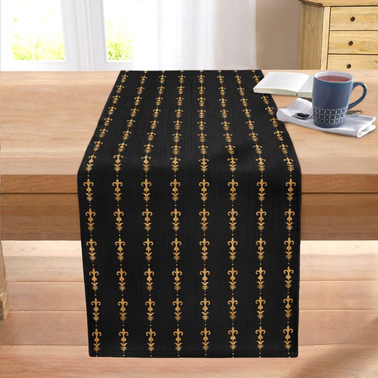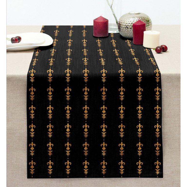 Siyah Zemin Gold Detaylı Dijital Baskılı Dekoratif Dikişli Şönil Runner