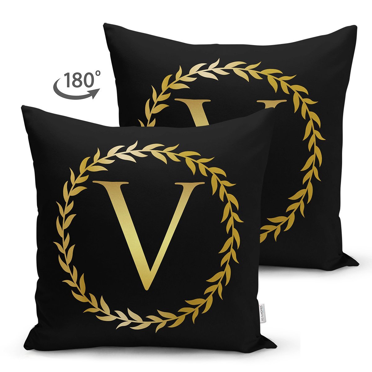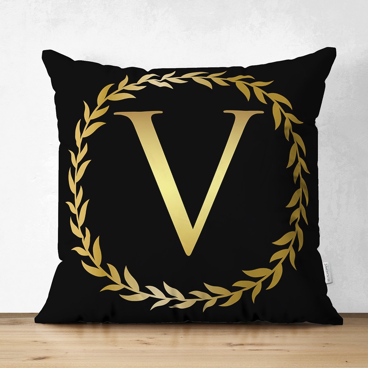 Siyah Zemin Gold Yaprak Çerçeveli V Harfi Özel Tasarım Modern Suet Yastık Kırlent Kılıfı