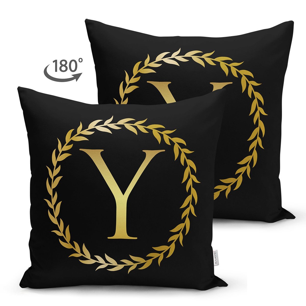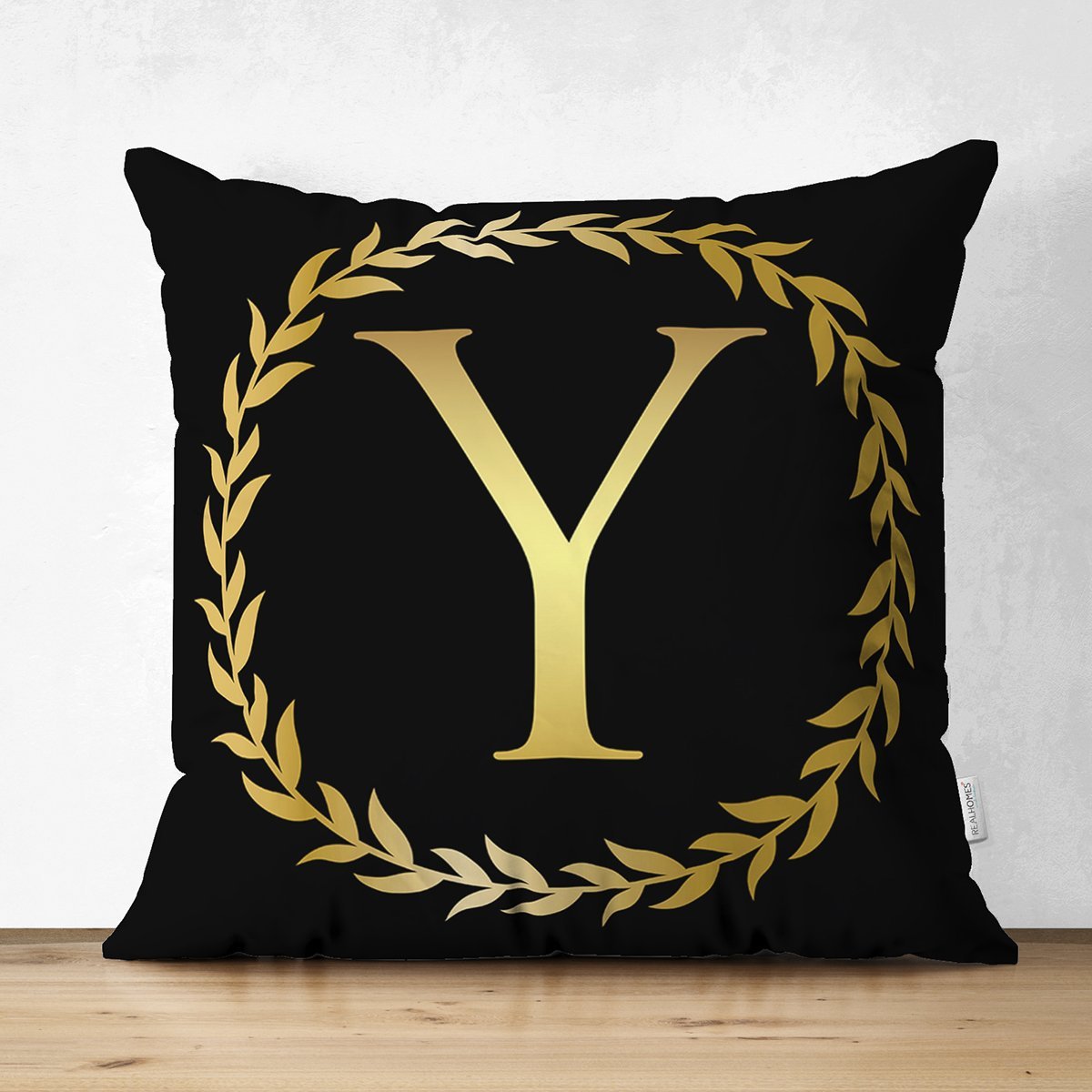 Siyah Zemin Gold Yaprak Çerçeveli Y Harfi Özel Tasarım Modern Suet Yastık Kırlent Kılıfı
