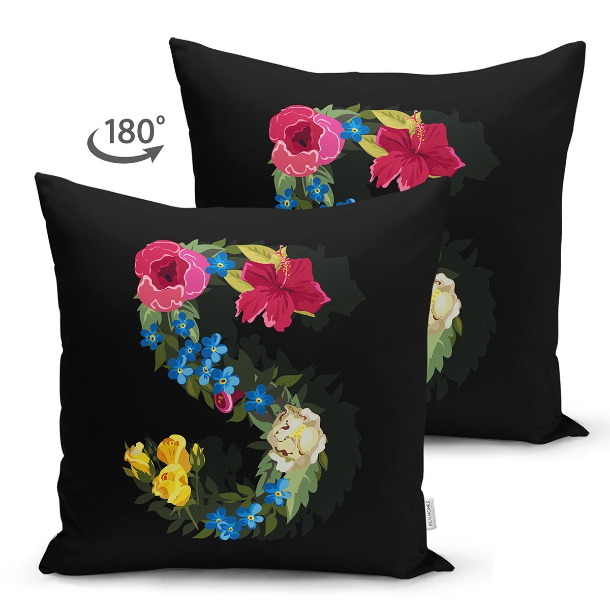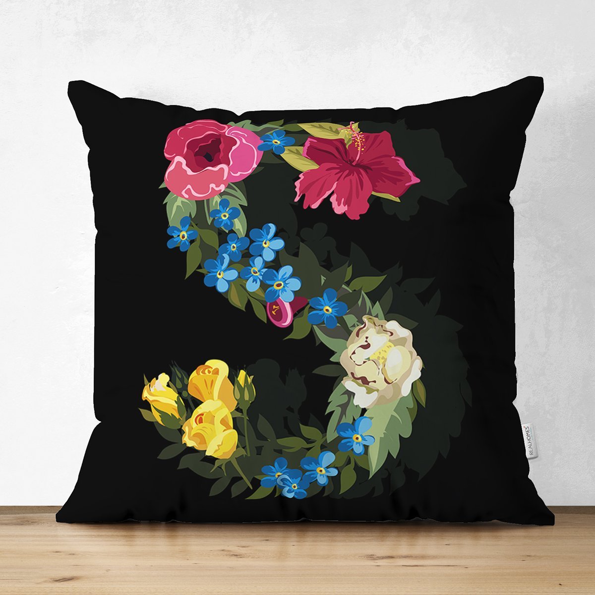 Siyah Zemin Renkli Gül Temalı S Harfi Özel Tasarım Modern Suet Yastık Kırlent Kılıfı