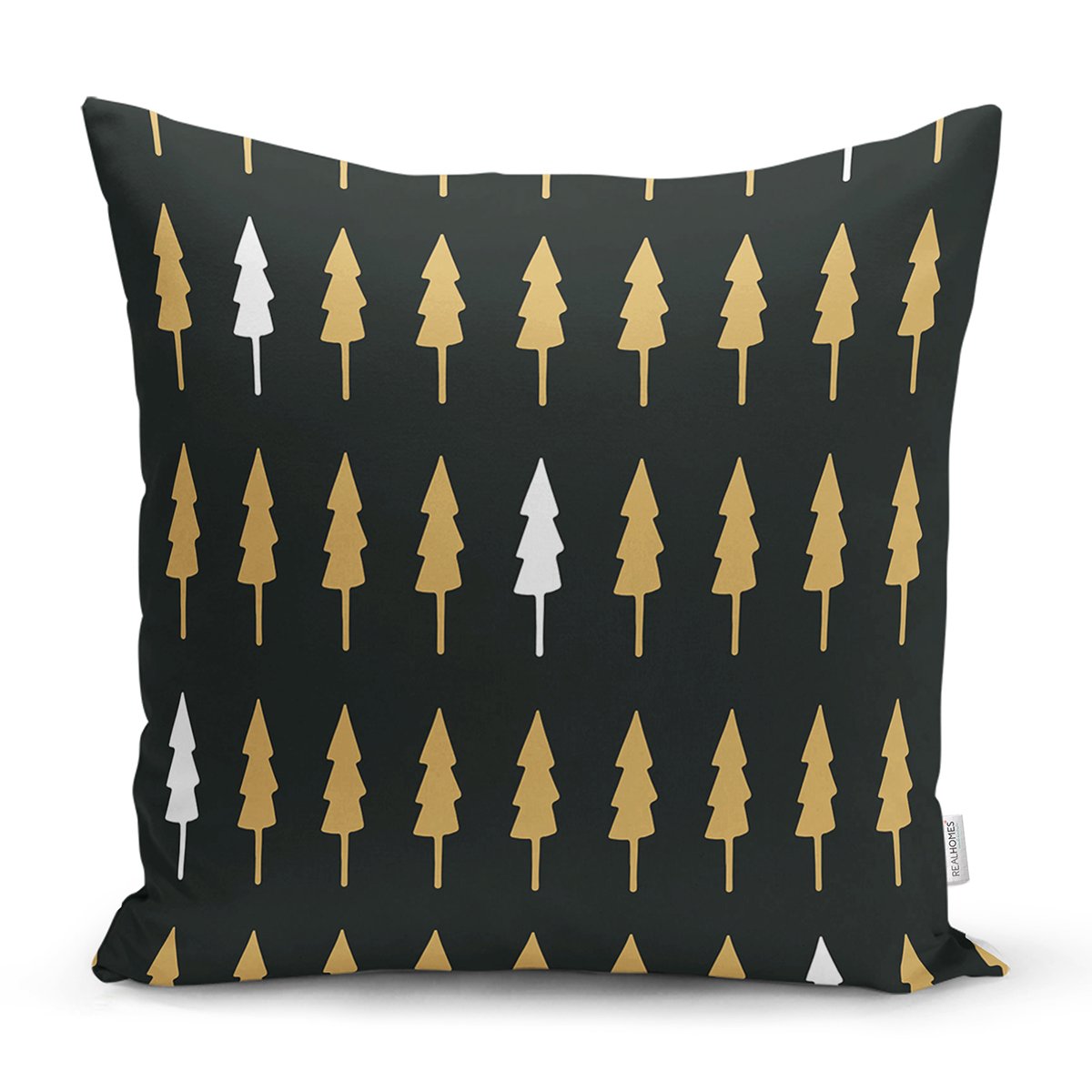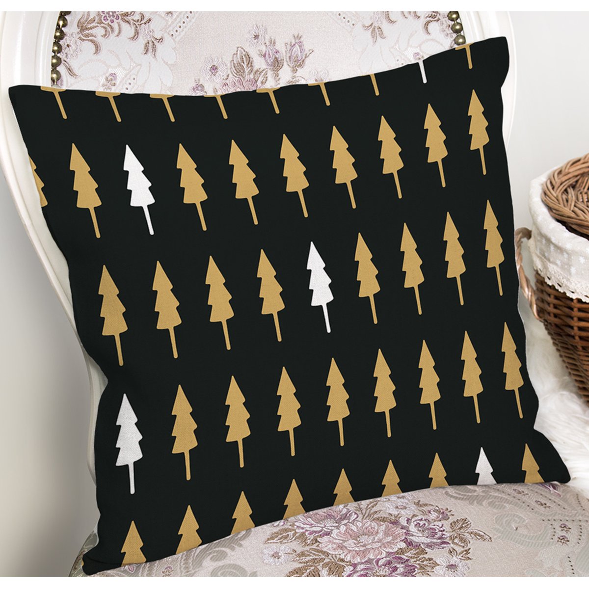 Siyah Zemin Üzerinde Gold Detaylı Çamağacı Desenli Modern Yastık Kırlent Kılıfı