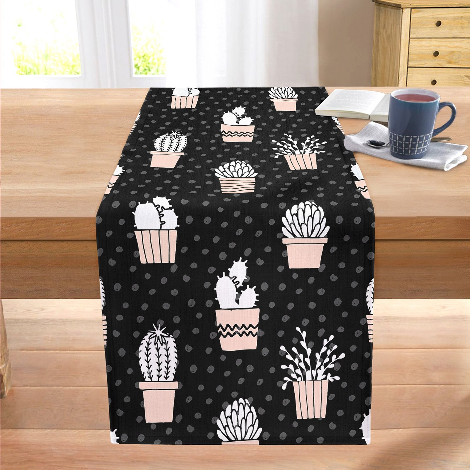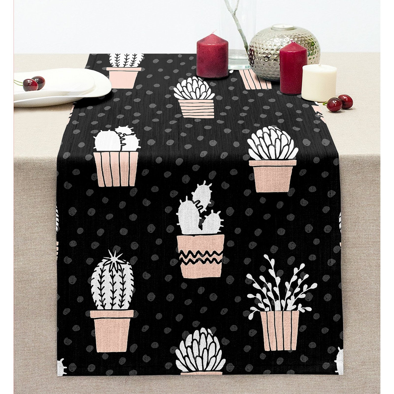 Siyah Zemin Üzerinde Kaktüs Desenli Dijital Baskılı Modern Dikişli Şönil Runner