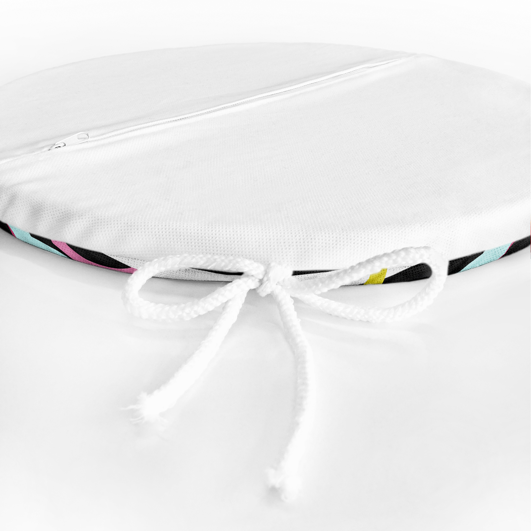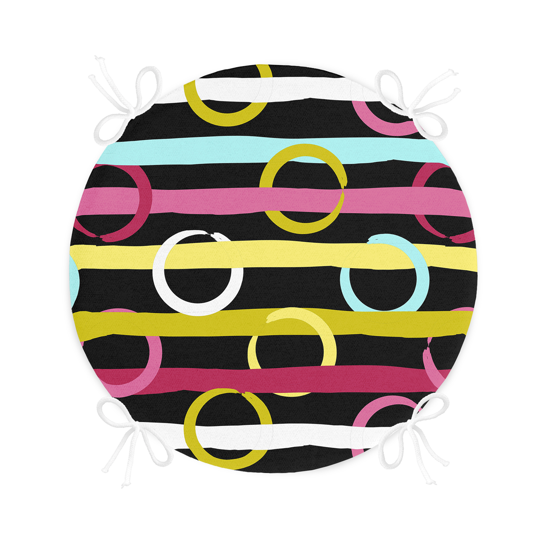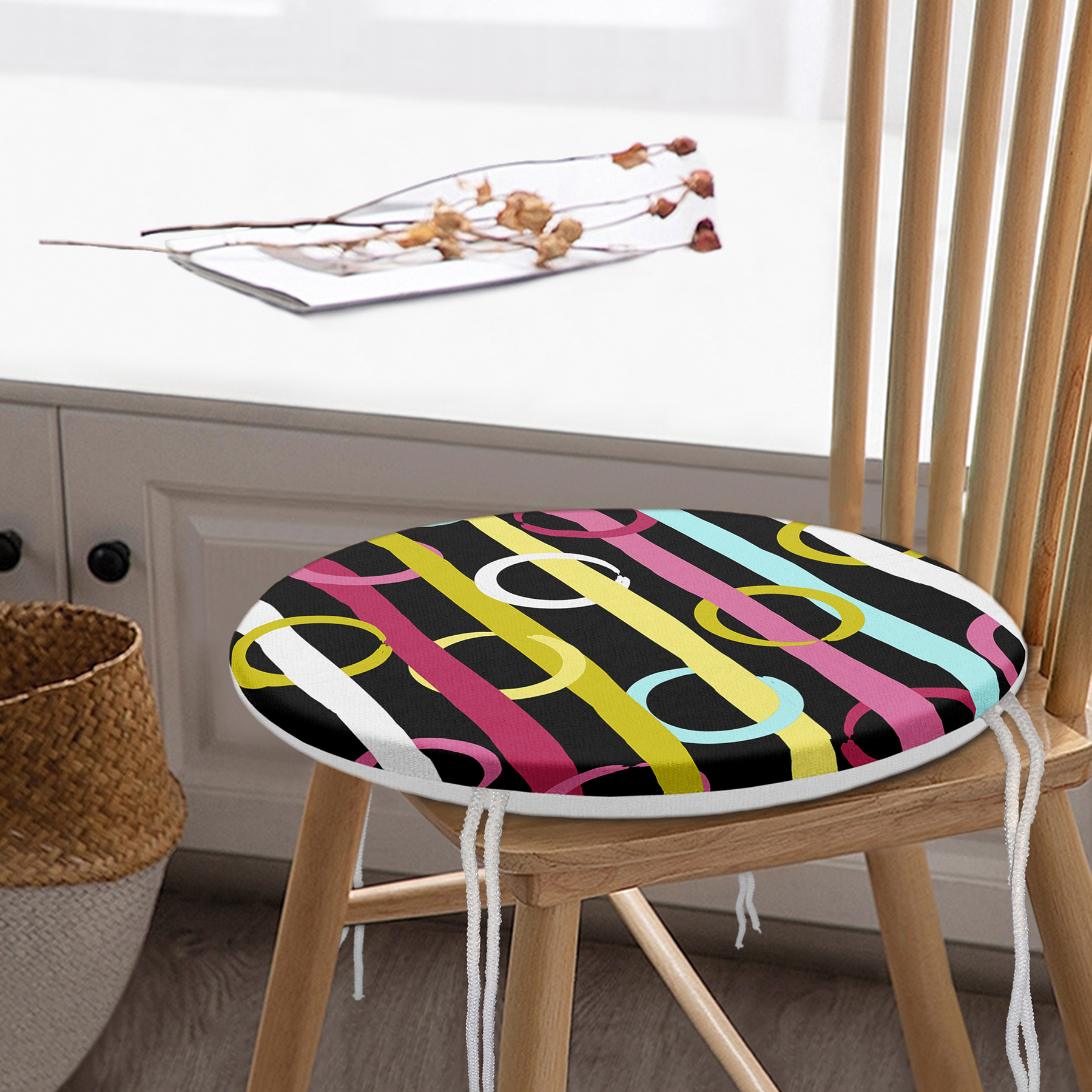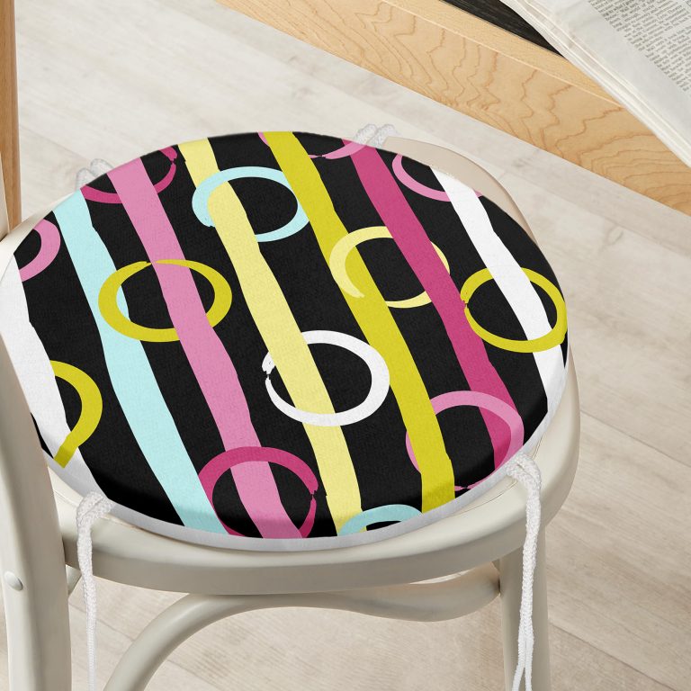 Siyah Zemin Üzerinde Modern Çizgili Renkli Puantiyeli Dijital Baskılı Modern Yuvarlak Fermuarlı Sandalye Minderi