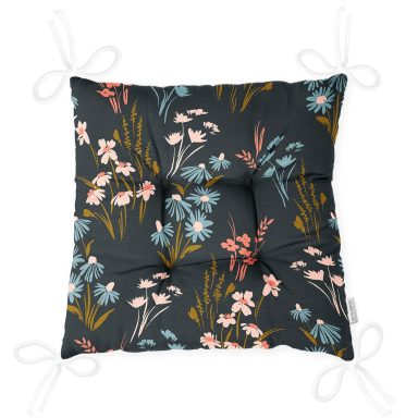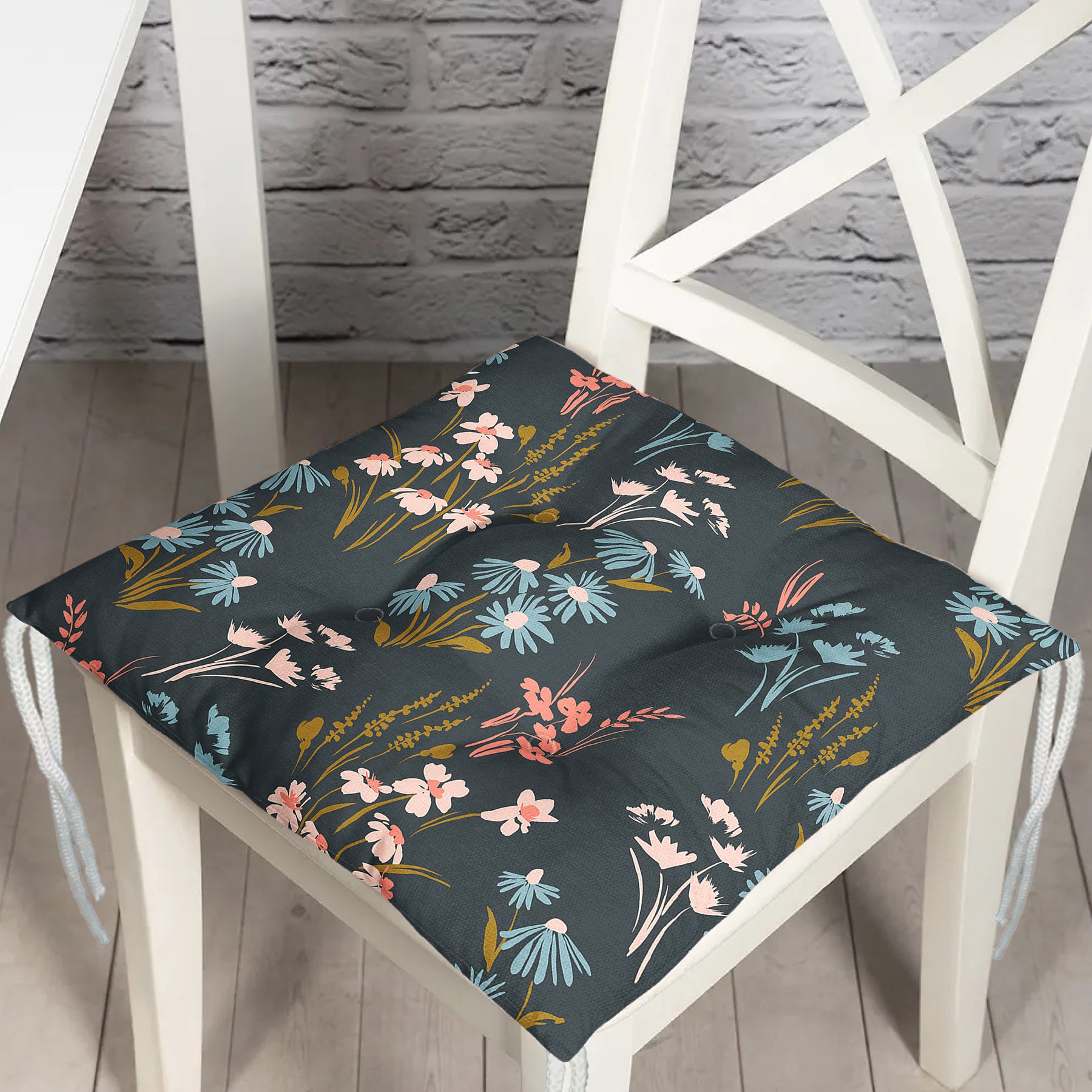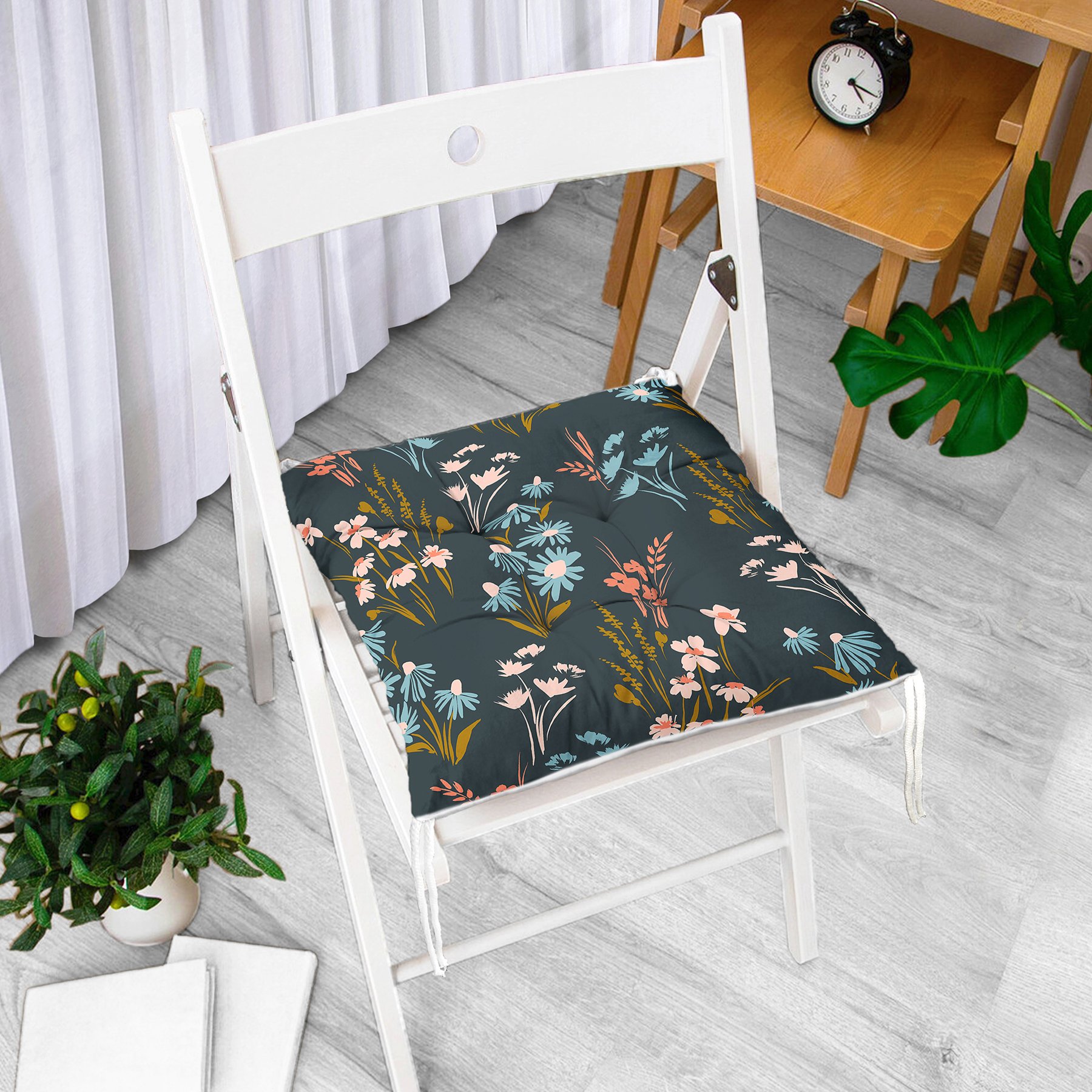 Siyah Zemin Üzerinde Renkli Çiçek Desenli Dijital Baskılı Modern Pofidik Sandalye Minderi