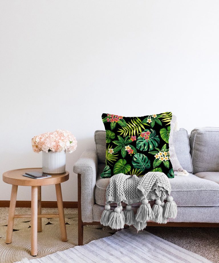 Siyah Zemin Yapraklar Raşel Yastık Kırlent Kılıfı