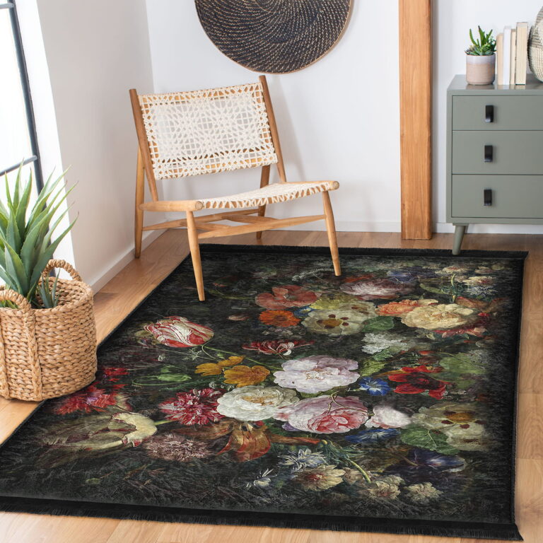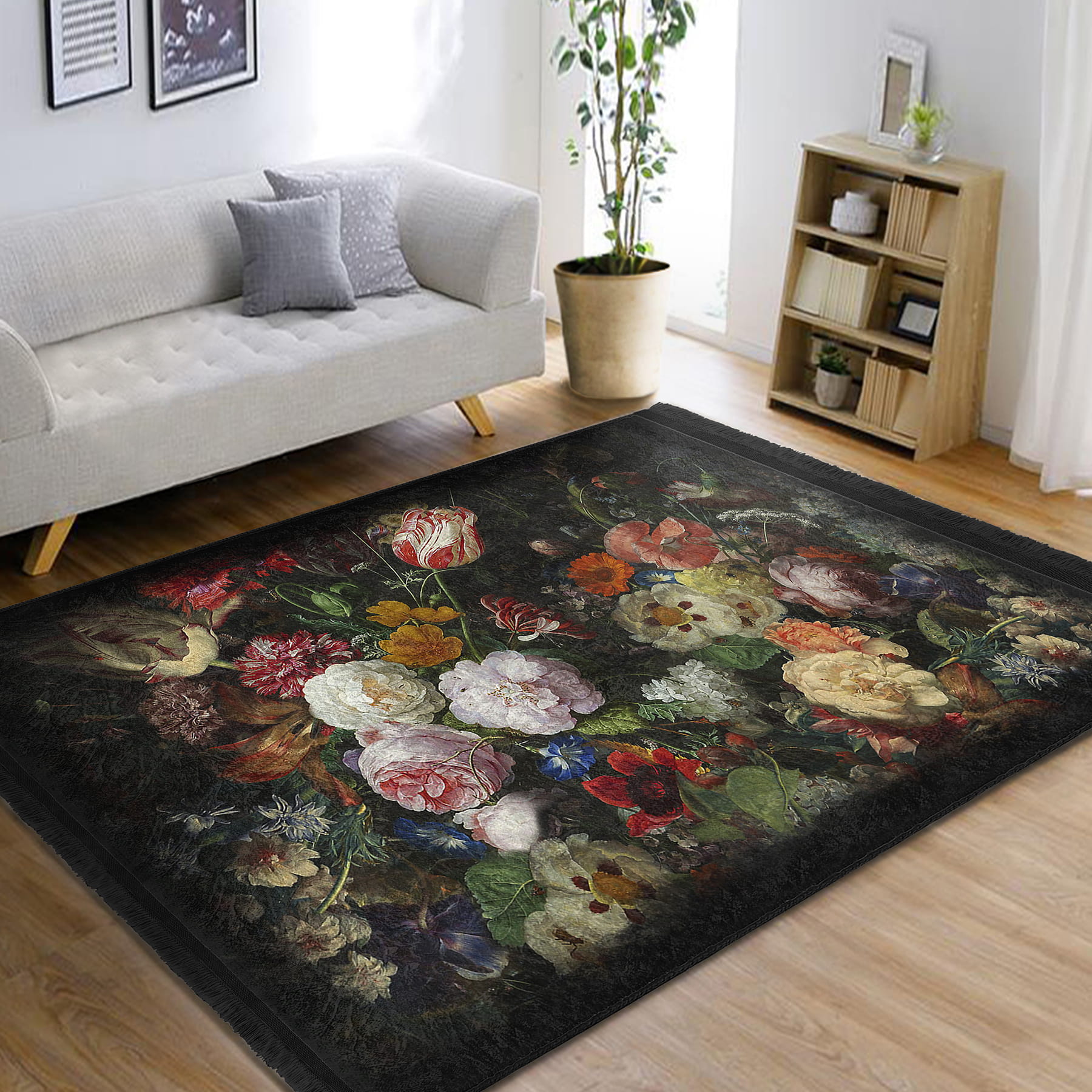 Siyah Zeminde Çiçek Motifli Yapraklar Desenli Floral Klasik Mutfak Salon & Oturma Odası Dijital Baskılı Makinede Yıkanabilir Kaymaz Taban Saçaklı Halı