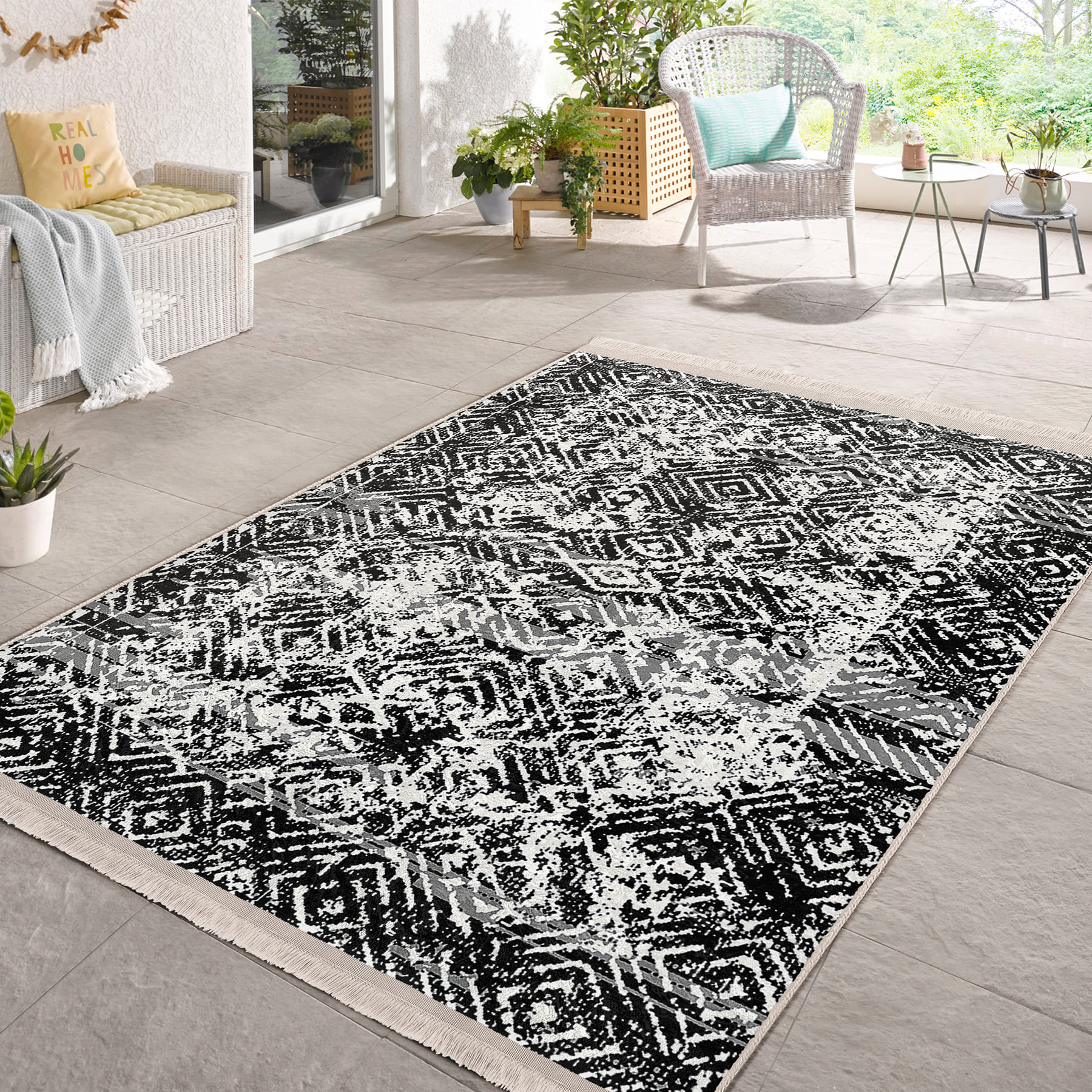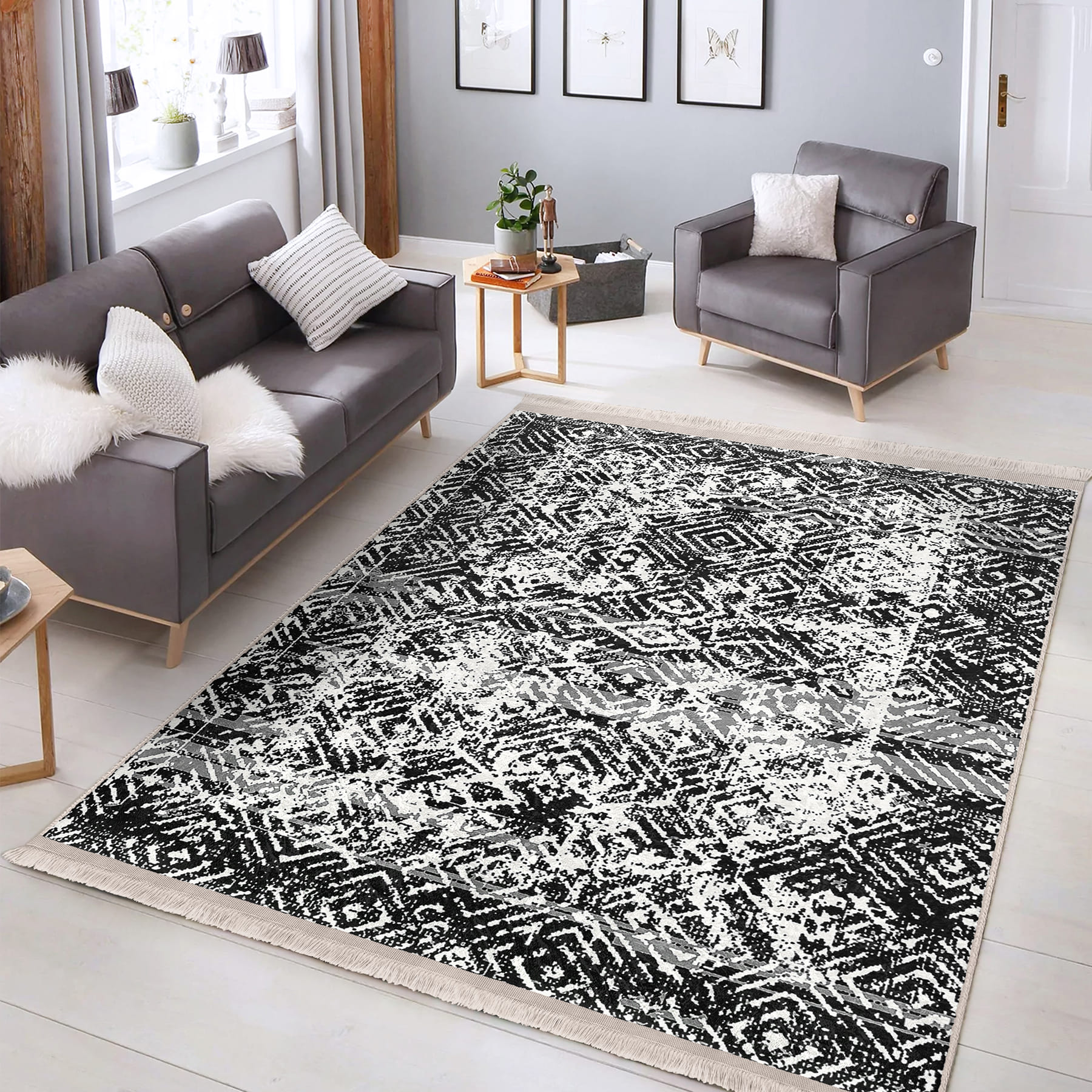 Siyah Zeminde Eskitme Motifli Geleneksel Desenli Geometrik Eskitme Motifli Koridor & Antre Salon & Oturma Odası Dijital Baskılı Makinede Yıkanabilir Kaymaz Taban Saçaklı Halı